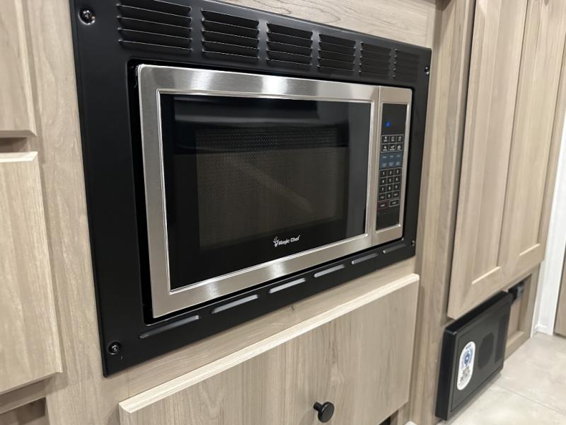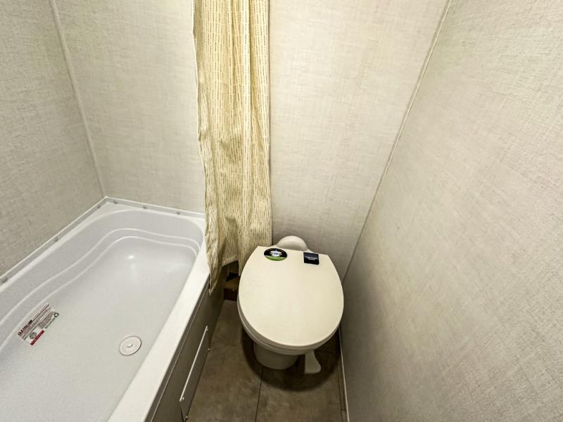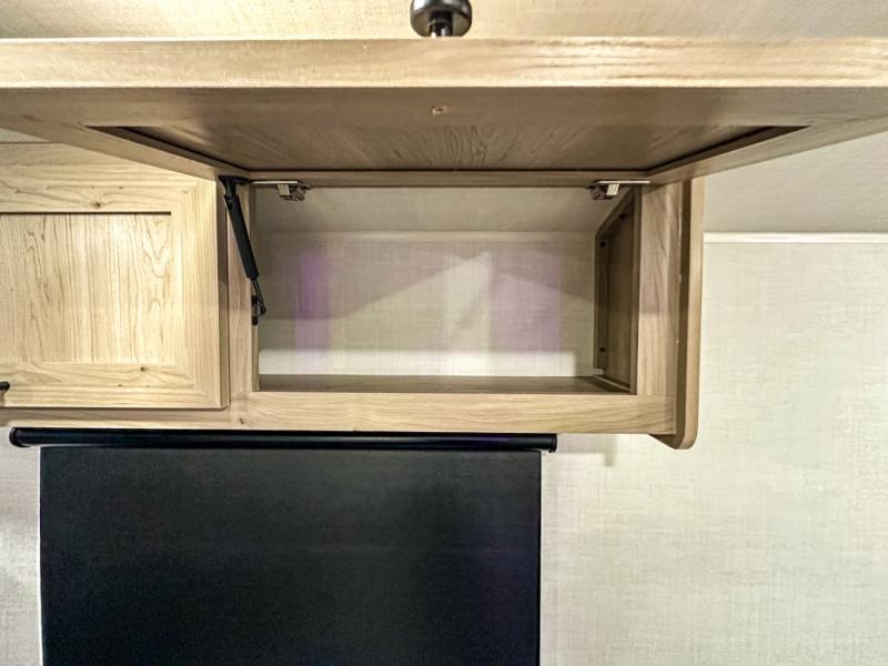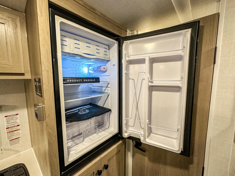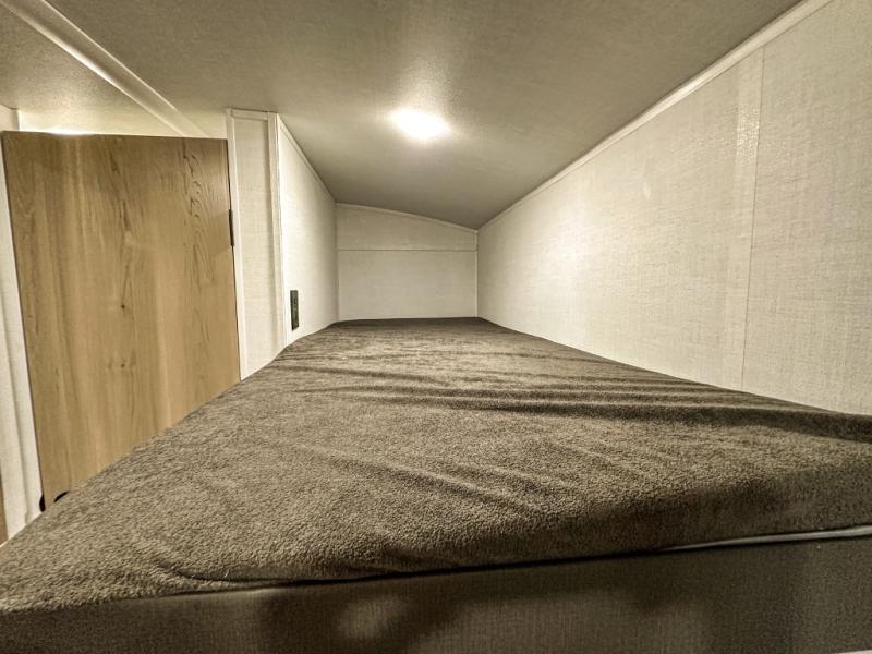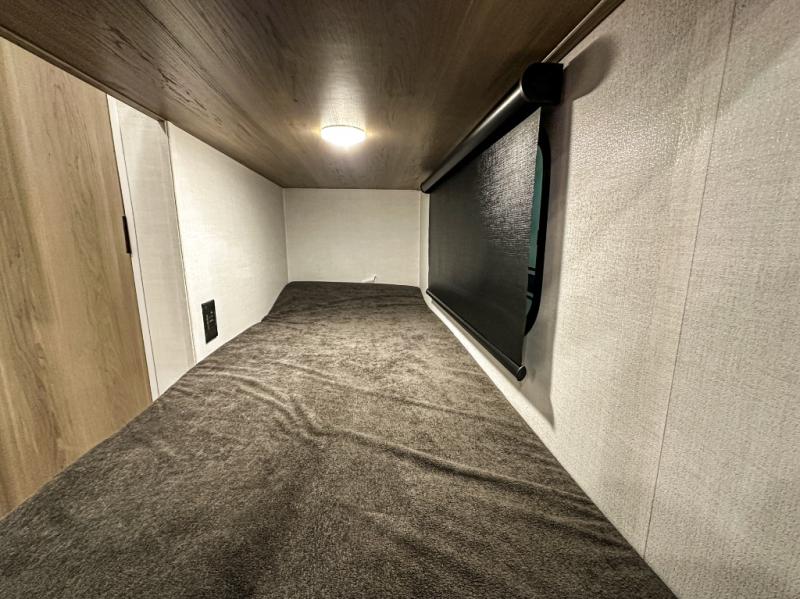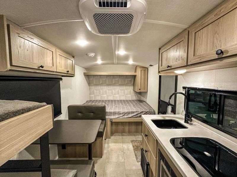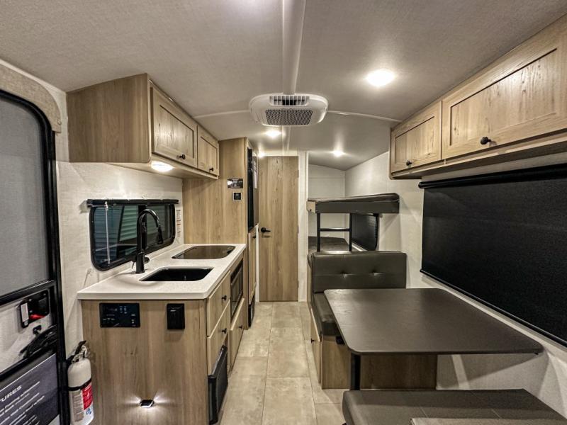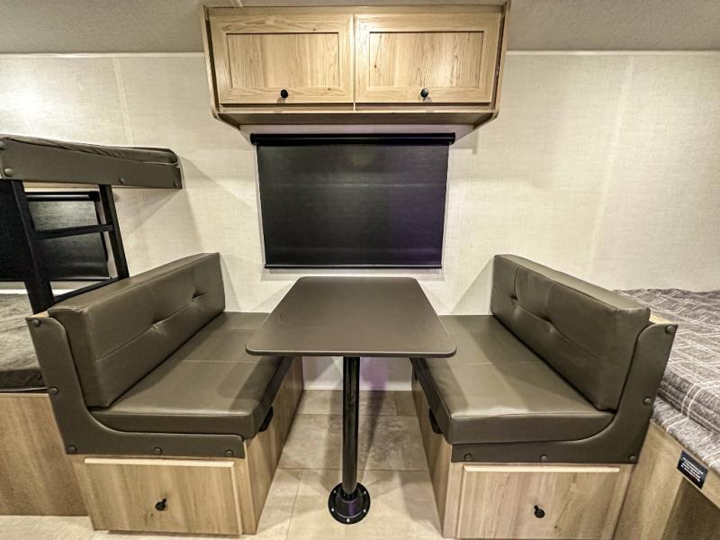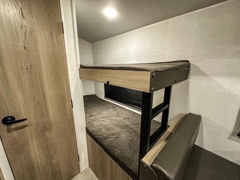This charming travel trailer is perfect for families or small groups. The front bedroom features a full bed, perfect for a restful night's sleep. Ample storage space ensures you stay organized and clutter-free. The booth dinette is a cozy spot for meals and conversation, while the kitchen area is equipped with a microwave, fridge, and overhead cabinets. Prepare delicious meals and snacks with ease. The bunk beds provide a fun and practical sleeping solution for kids or additional guests. Perfect for sleepovers or family gatherings! The full bathroom is a convenient and refreshing space, with all the essentials for a comfortable stay.
