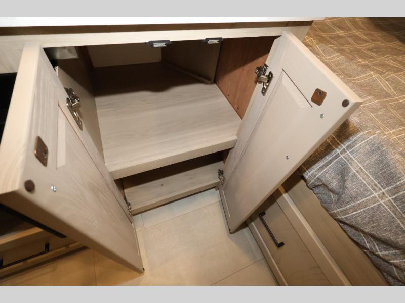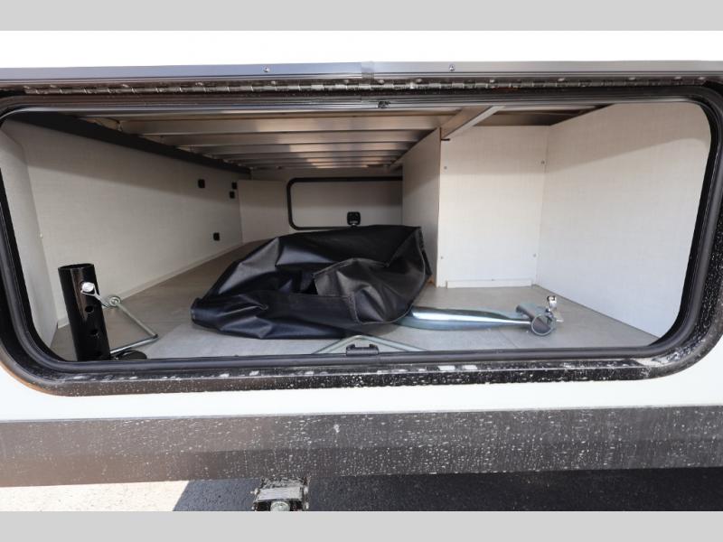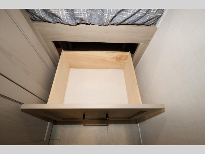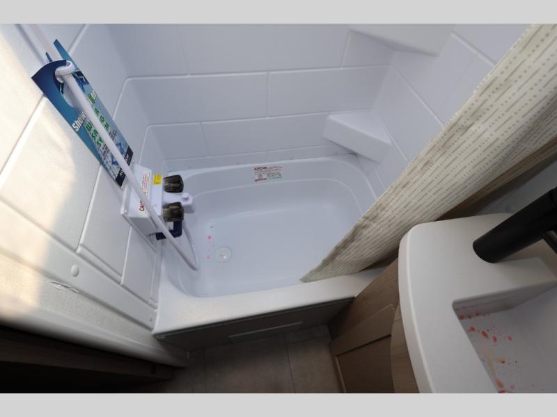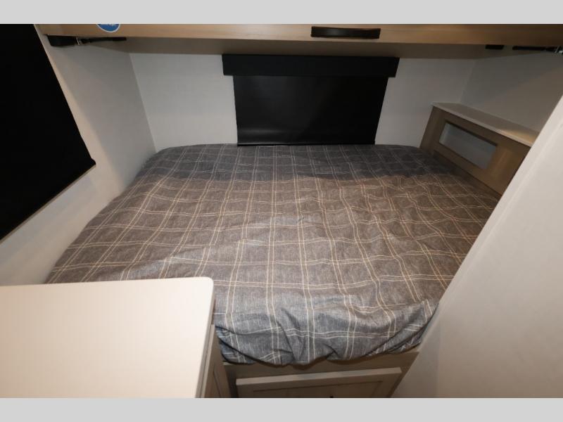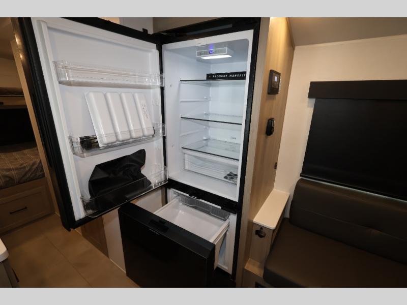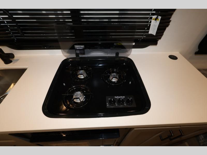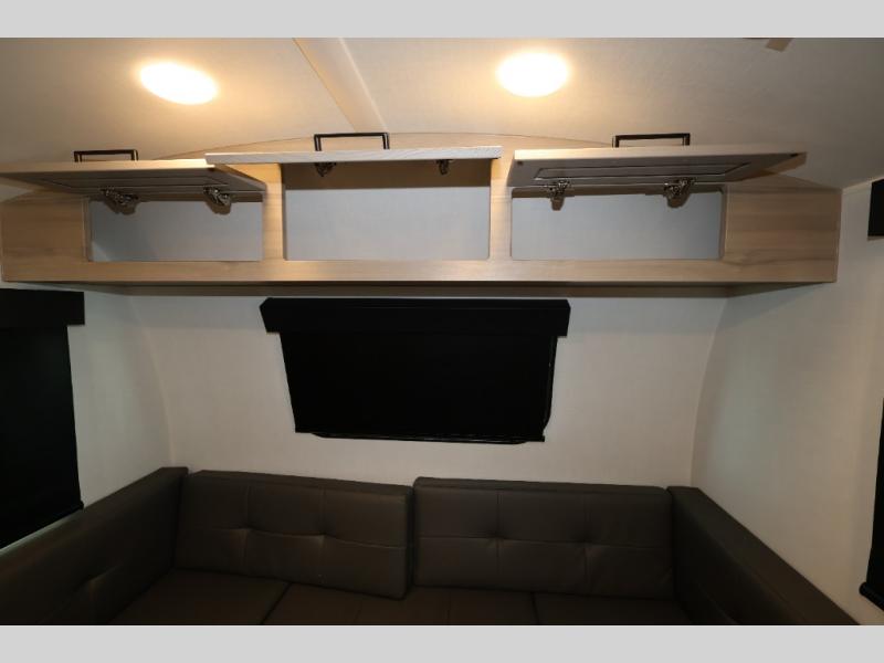 Your small family will enjoy camping in this travel trailer! The 26" x 80" flip-up bunk provides a comfortable place to sleep above the 54" x 74" full bed, as well as the front 54" x 81" U-shaped dinette once converted. You even have a 32" TV nearby to watch your favorite movies. Freshen up in the full bathroom each morning and warm up a cinnamon roll in the microwave or grab some eggs from the 12V refrigerator then fry them up on the recessed three burner cooktop. There is also an outside griddle underneath the 15' power awning, and the pass-thru storage will be perfect for fishing poles!