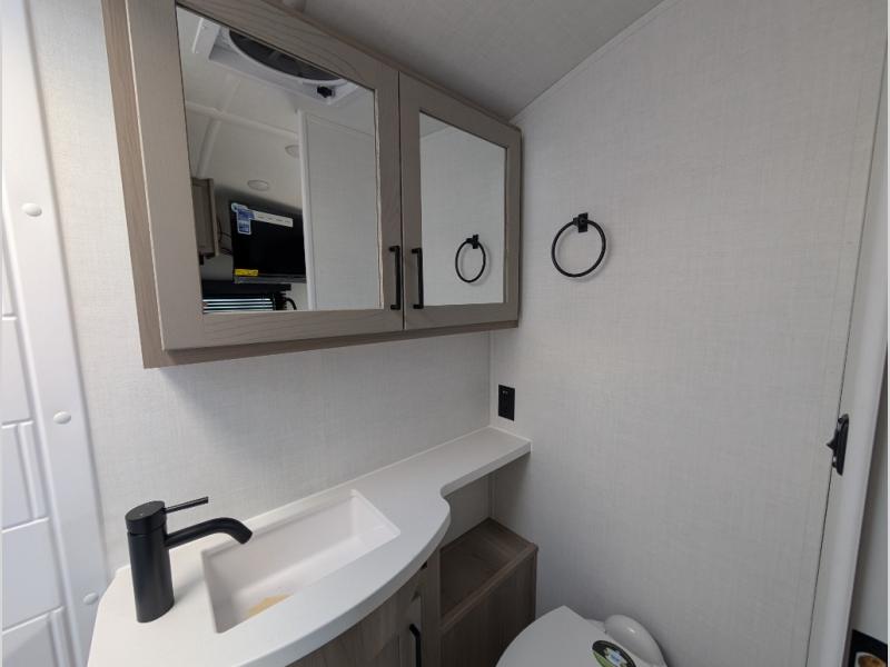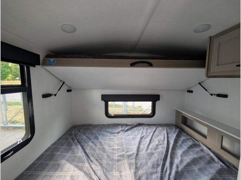 Your small family will enjoy camping in this travel trailer! The 26" x 80" flip-up bunk provides a comfortable place to sleep above the 54" x 74" full bed, as well as the front 54" x 81" U-shaped dinette once converted. You even have a 32" TV nearby to watch your favorite movies. Freshen up in the full bathroom each morning and warm up a cinnamon roll in the microwave or grab some eggs from the 12V refrigerator then fry them up on the recessed three burner cooktop. There is also an outside griddle underneath the 15' power awning, and the pass-thru storage will be perfect for fishing poles!