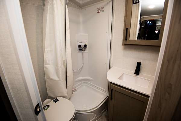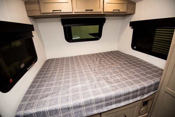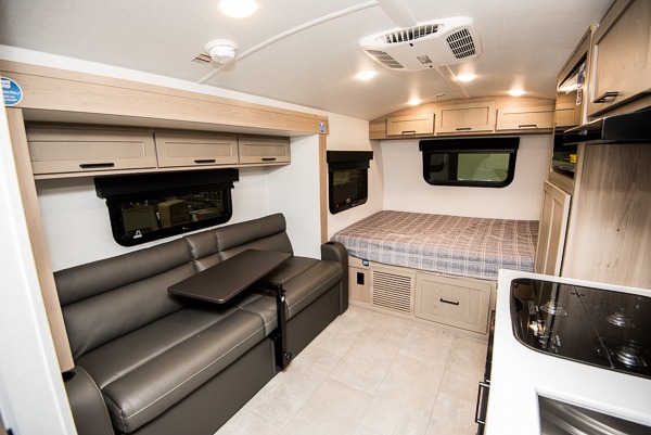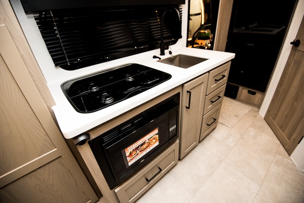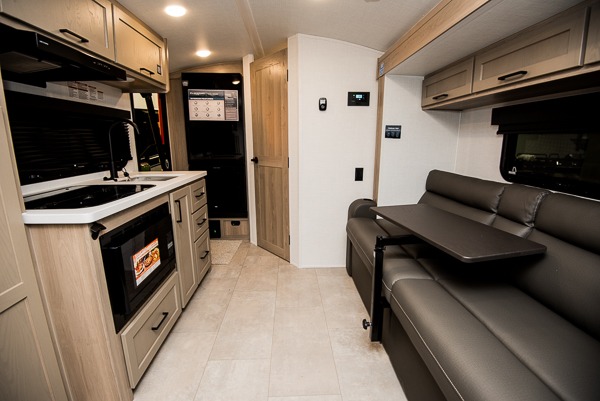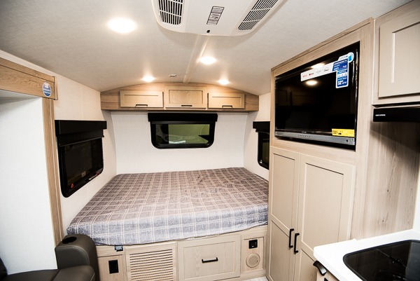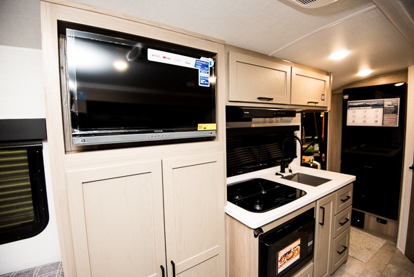 This can be the perfect couples trailer for you or your own RV with more floor space to move around thanks to the slide out sofa with a 30" x 15" table which offers sleeping space for friends. You will have a queen bed to lay your head up front, and everyone can watch the 12V TV. The wardrobe and overhead cabinets give you clothing storage, and the kitchen cooktop and microwave allow the cook to make warm meals. And the 12V refrigerator is conveniently next to the entry so you can grab a drink on your way out to relax under the 11' power awning.