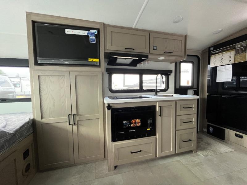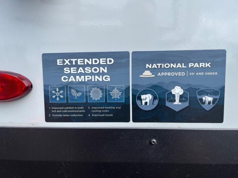 This can be the perfect couples trailer for you or your own RV with more floor space to move around thanks to the slide out sofa with a 30" x 15" table which offers sleeping space for friends. You will have a queen bed to lay your head up front, and everyone can watch the 32" TV. The wardrobe and overhead cabinets give you clothing storage, and the kitchen cooktop and microwave allow the cook to make warm meals. And the 12V refrigerator is conveniently next to the entry so you can grab a drink on your way out to relax under the 11' power awning.