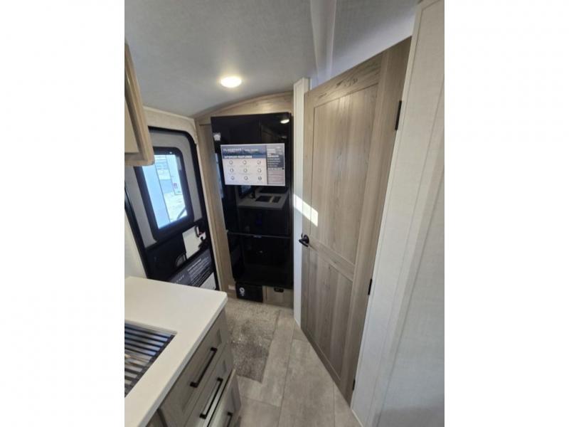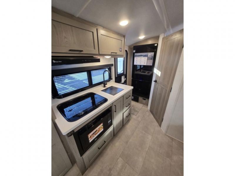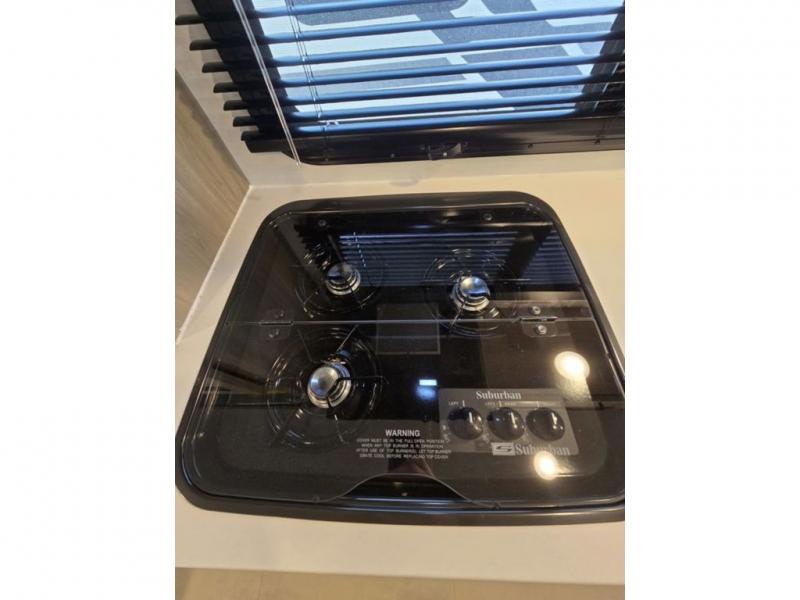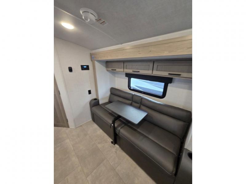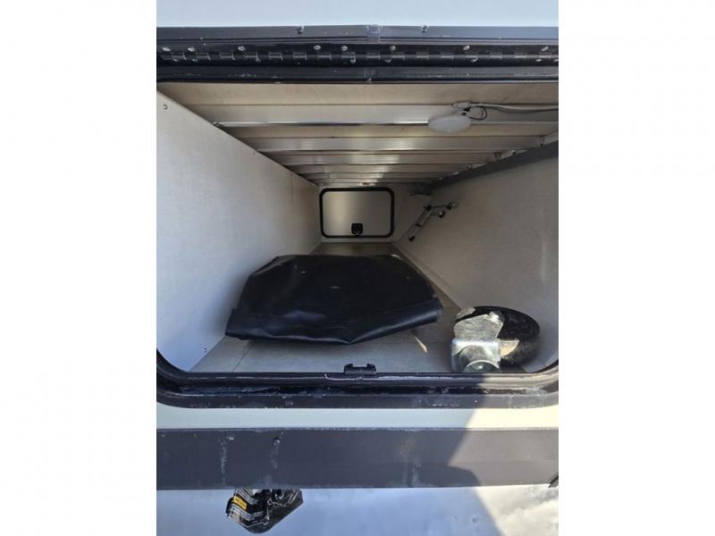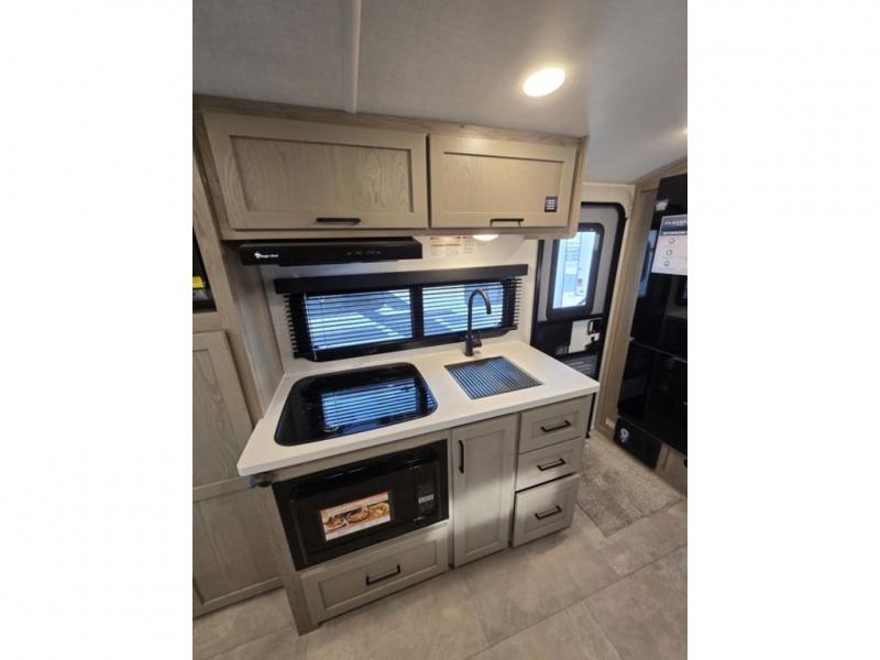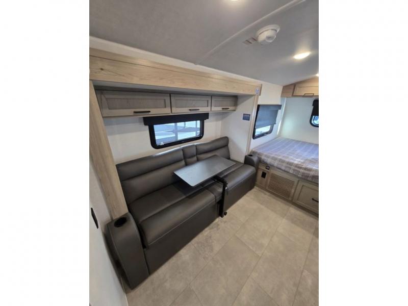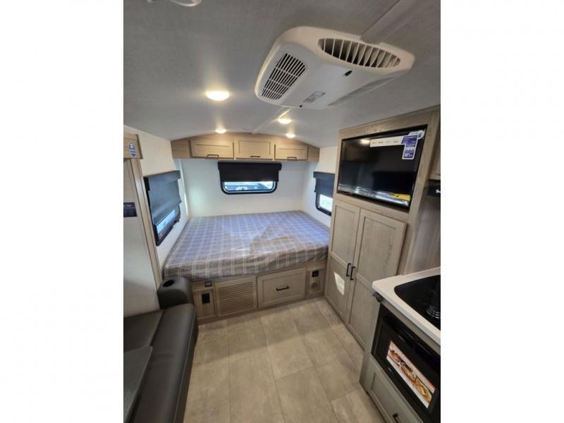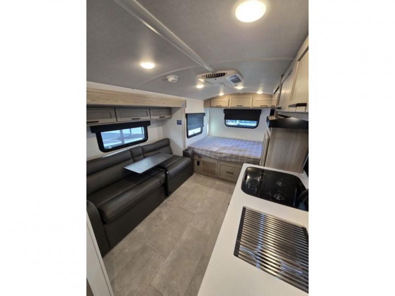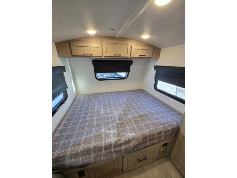 This can be the perfect couples trailer for you or your own RV with more floor space to move around thanks to the slide out sofa with a 30" x 15" table which offers sleeping space for friends. You will have a queen bed to lay your head up front, and everyone can watch the 12V TV. The wardrobe and overhead cabinets give you clothing storage, and the kitchen cooktop and microwave allow the cook to make warm meals. And the 12V refrigerator is conveniently next to the entry so you can grab a drink on your way out to relax under the 11' power awning.