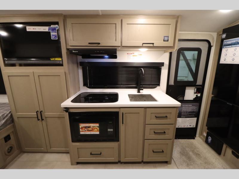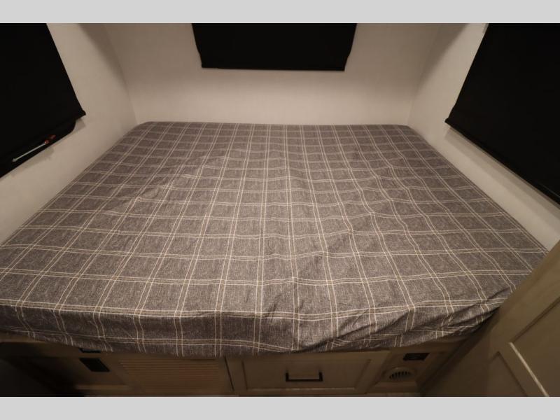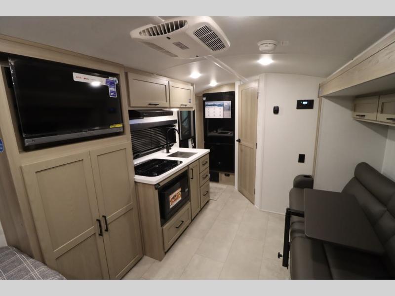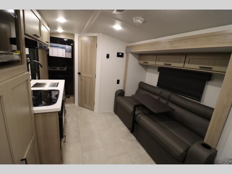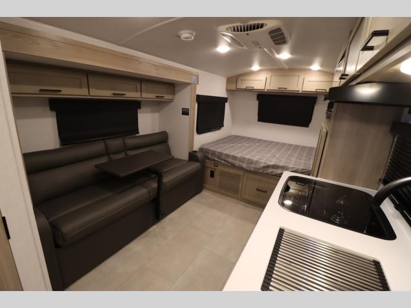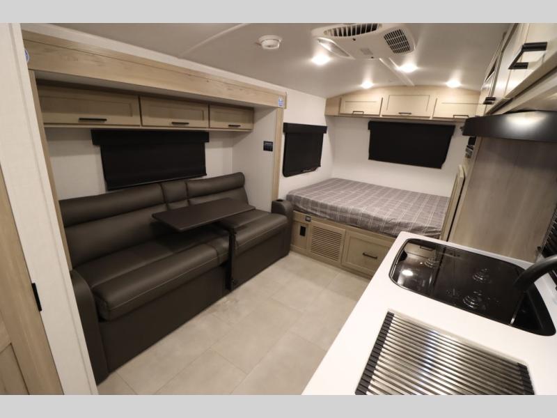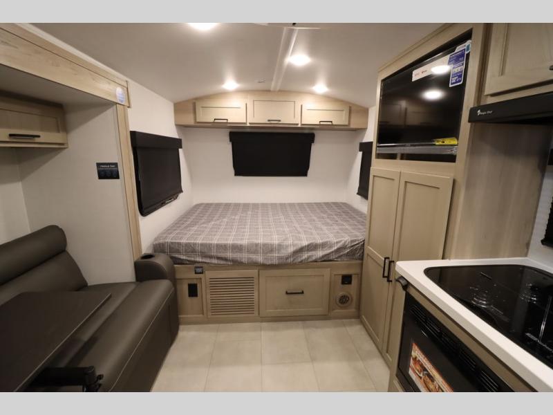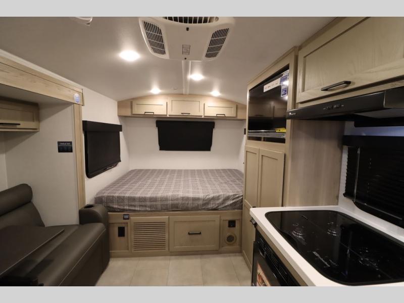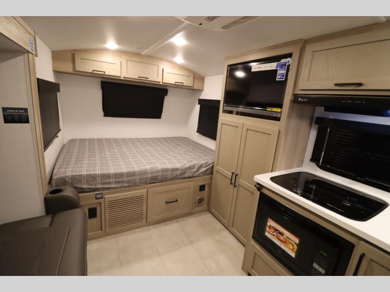 This can be the perfect couples trailer for you or your own RV with more floor space to move around thanks to the slide out sofa with a 30" x 15" table which offers sleeping space for friends. You will have a queen bed to lay your head up front, and everyone can watch the 12V TV. The wardrobe and overhead cabinets give you clothing storage, and the kitchen cooktop and microwave allow the cook to make warm meals. And the 12V refrigerator is conveniently next to the entry so you can grab a drink on your way out to relax under the 11' power awning.