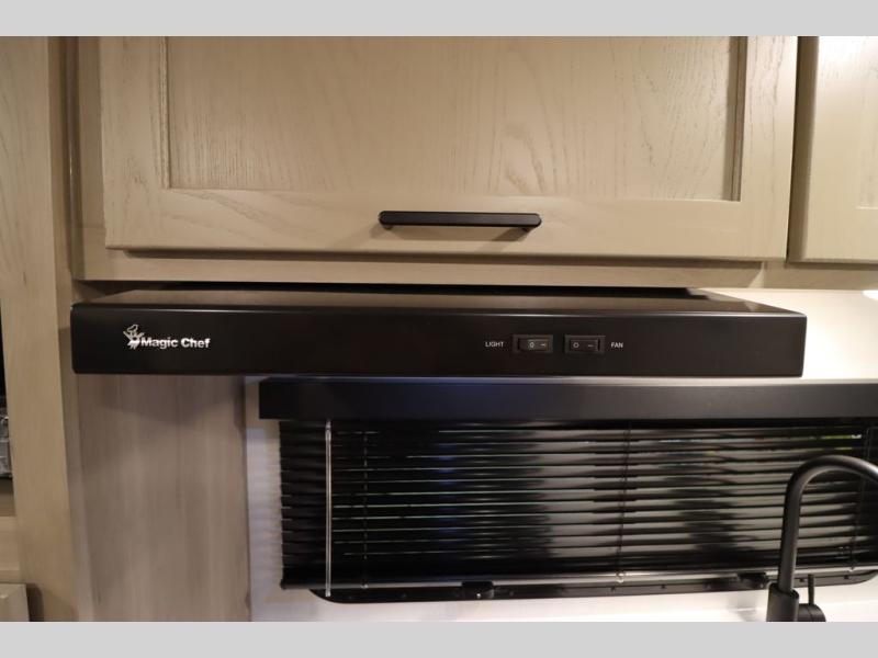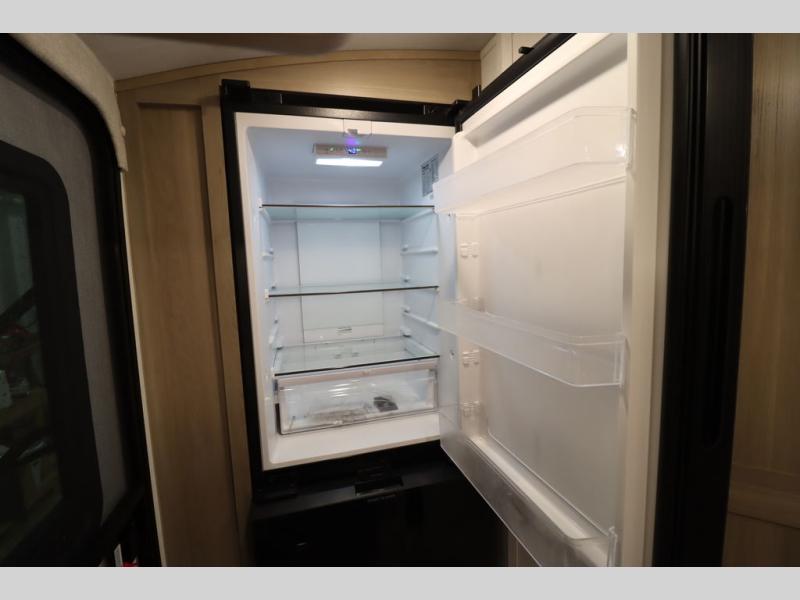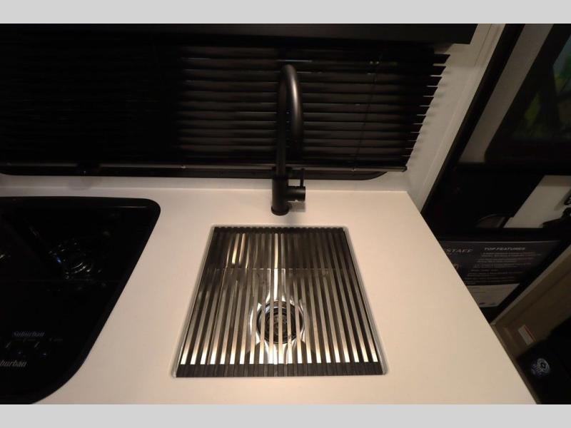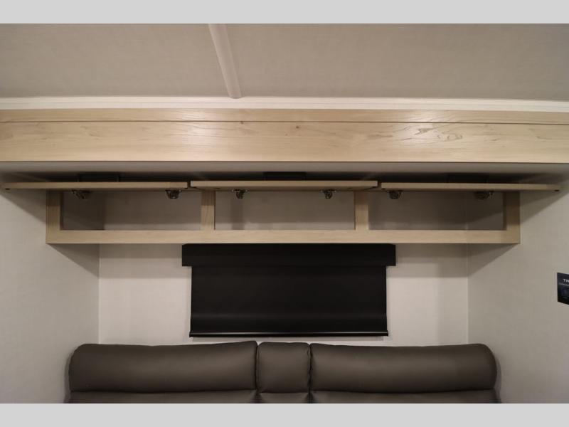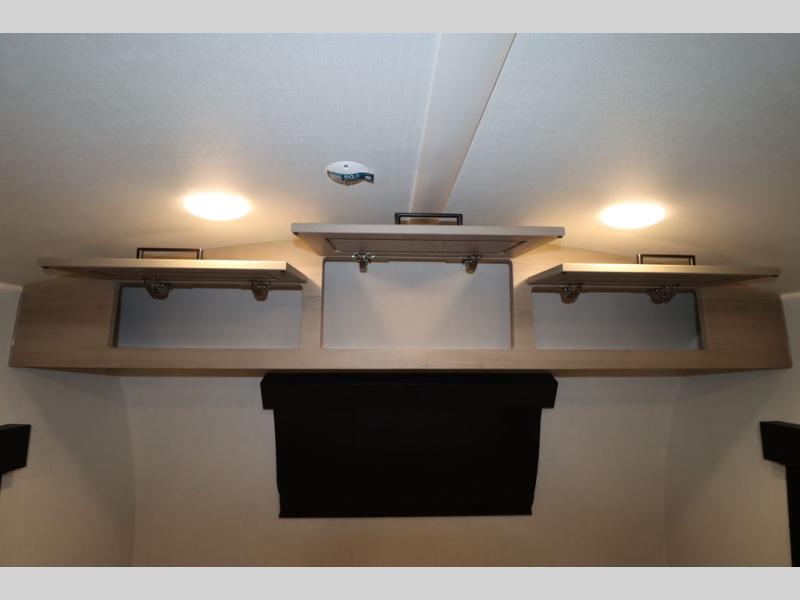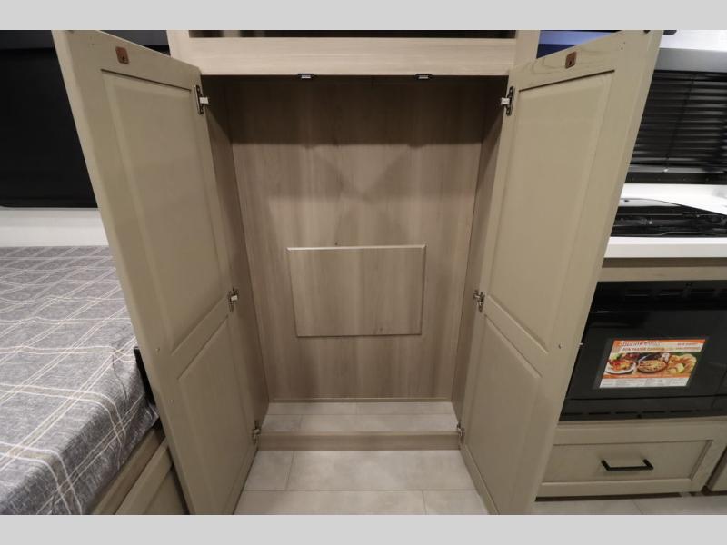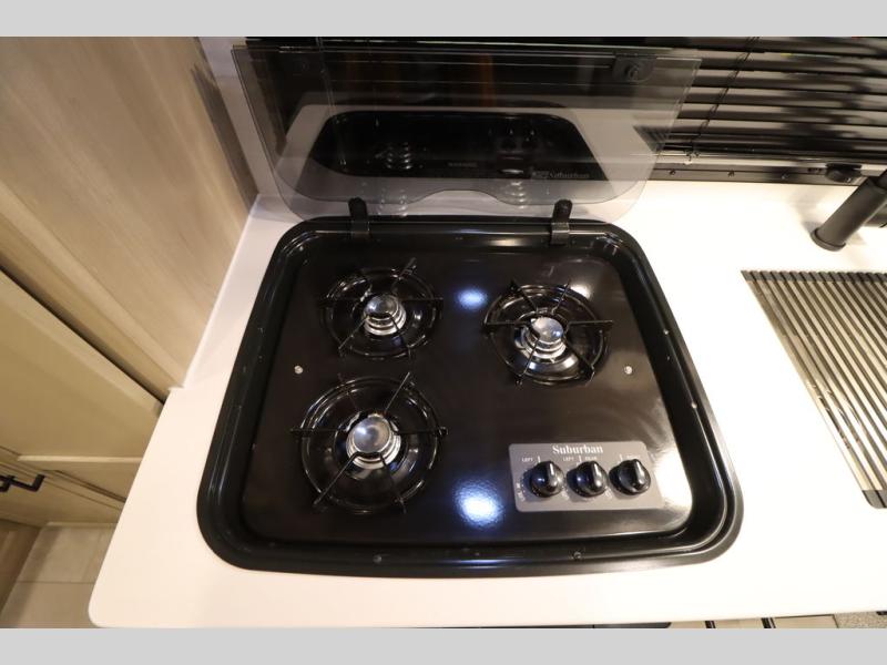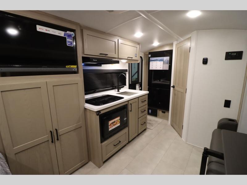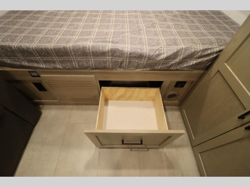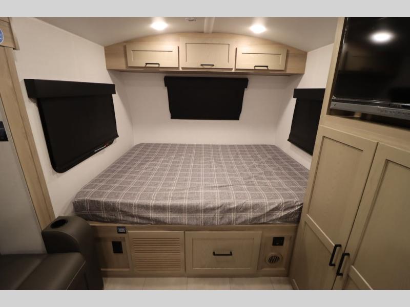 This can be the perfect couples trailer for you or your own RV with more floor space to move around thanks to the slide out sofa with a 30" x 15" table which offers sleeping space for friends. You will have a queen bed to lay your head up front, and everyone can watch the 12V TV. The wardrobe and overhead cabinets give you clothing storage, and the kitchen cooktop and microwave allow the cook to make warm meals. And the 12V refrigerator is conveniently next to the entry so you can grab a drink on your way out to relax under the 11' power awning.