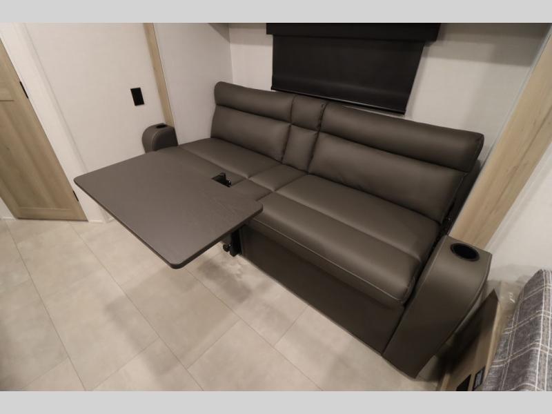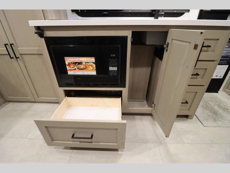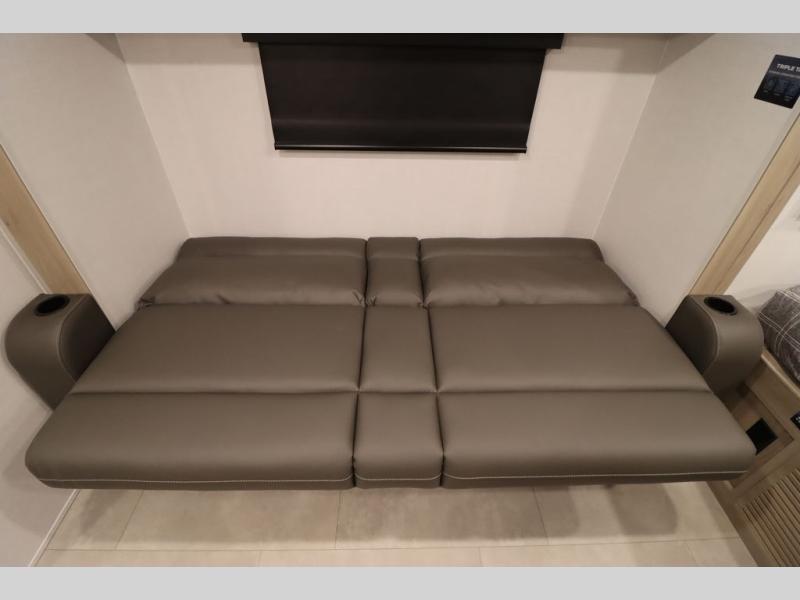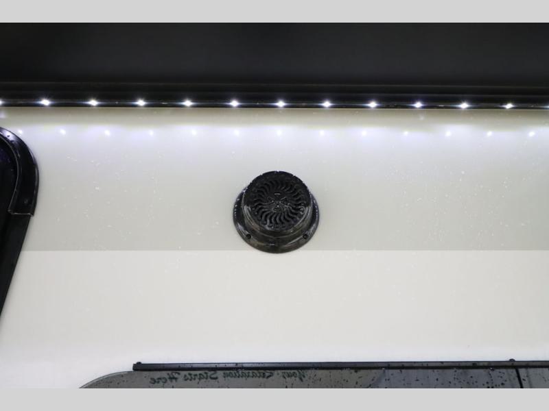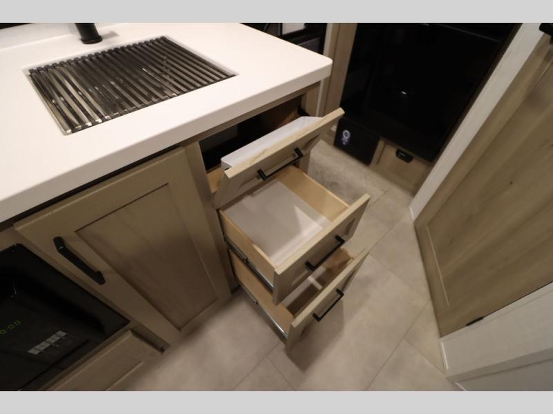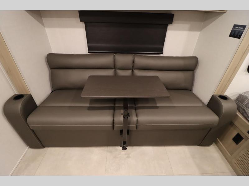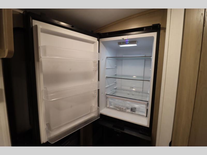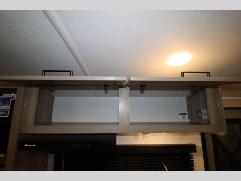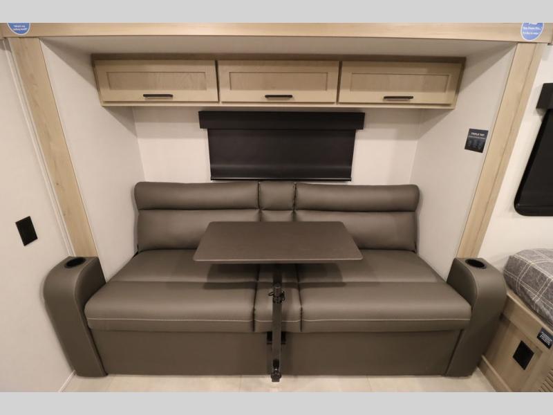 This can be the perfect couples trailer for you or your own RV with more floor space to move around thanks to the slide out sofa with a 30" x 15" table which offers sleeping space for friends. You will have a queen bed to lay your head up front, and everyone can watch the 12V TV. The wardrobe and overhead cabinets give you clothing storage, and the kitchen cooktop and microwave allow the cook to make warm meals. And the 12V refrigerator is conveniently next to the entry so you can grab a drink on your way out to relax under the 11' power awning.