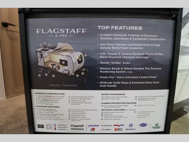 With any Flagstaff E-Pro travel trailer by Forest River, you will experience lightweight towing, style and features that will meet your needs, plus amenities that give you more than you expected! Built with interior and exterior composite sidewall construction for added strength and durability, a fully laminated roof for weather-tight protection, and aluminum truss roof bracing for enhanced stability. These trailers are equipped with Dexter leaf-spring axles for smooth towing and durable performance. The interior features an aluminum dinette, bed, and bunk, providing a strong and lightweight framework for comfortable living. Additionally, the backup camera prep ensures a safe and stress-free reversing experience. Make your selection today!