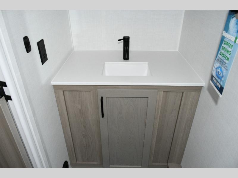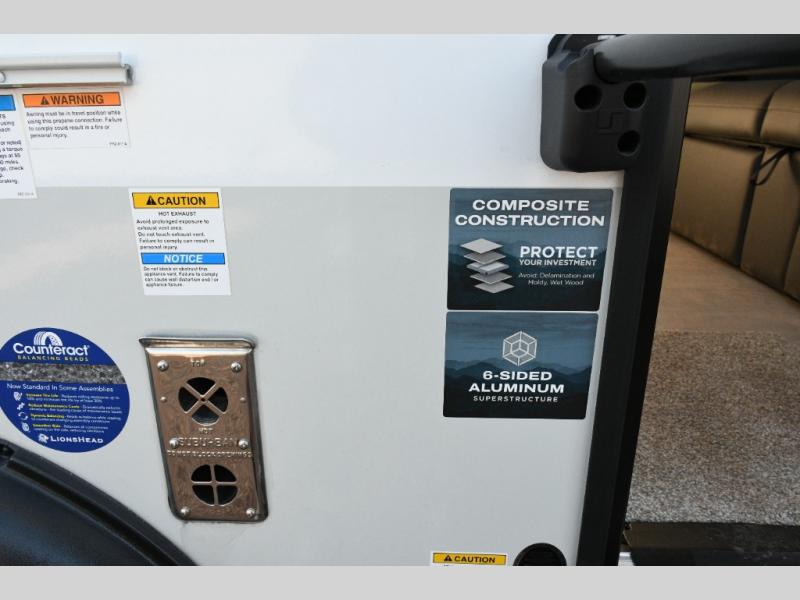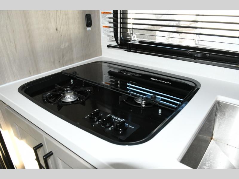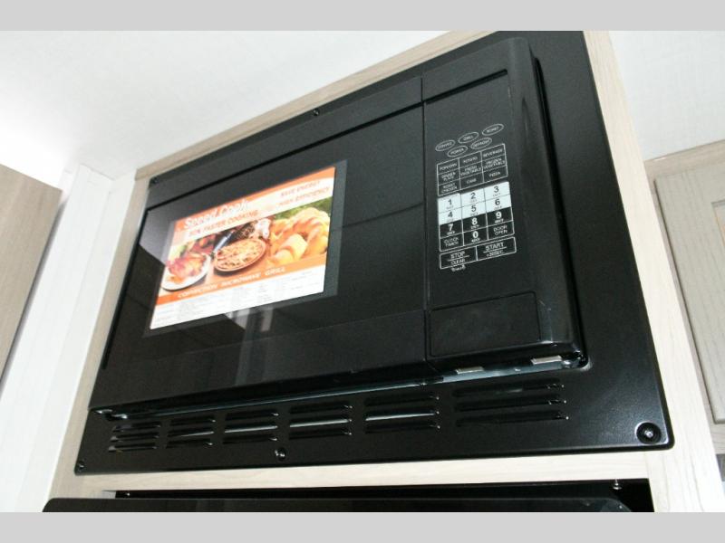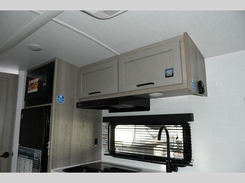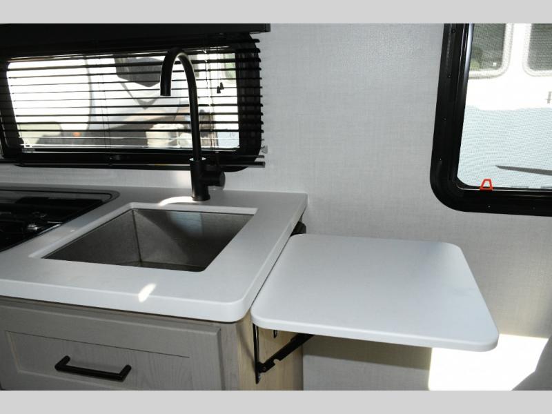 Full Kitchen with a View! Kitchen slide-out includes cooktop, microwave, fridge, and sink with cover