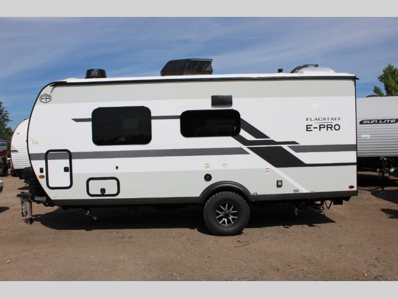 With any Flagstaff E-Pro travel trailer by Forest River, you will experience lightweight towing, style and features that will meet your needs, plus amenities that give you more than you expected! Built with interior and exterior composite sidewall construction, tongue and grove plywood flooring, and a vacuum laminated roof and walls, plus torsion axle, Rubber-Ryde suspension, and a tire pressure monitoring system for safety while traveling. And the 200 watt roof mount solar panel with 1,800-watt inverter will allow you to stay off-grid if you like. The interior offers a comfortable environment with the choice to use the air conditioner or furnace, and a 12V entertainment TV with a stereo to stay up to date on your favorite movies. Make your selection today!