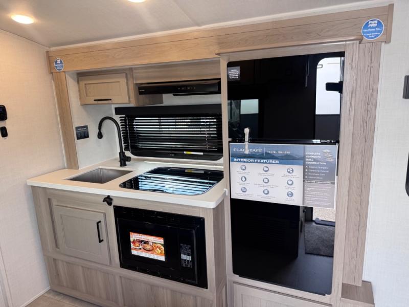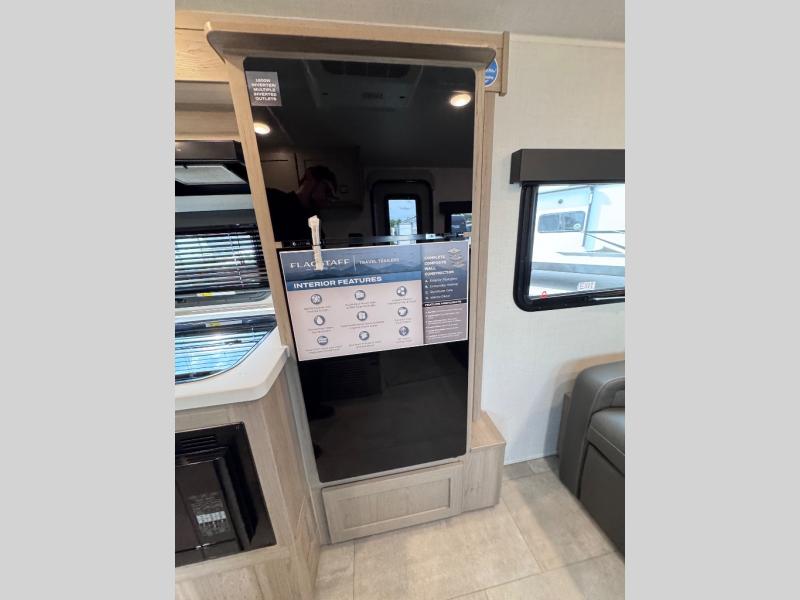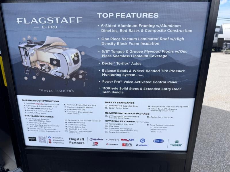 With any Flagstaff E-Pro travel trailer by Forest River, you will experience lightweight towing, style and features that will meet your needs, plus amenities that give you more than you expected! Built with interior and exterior composite sidewall construction, tongue and grove plywood flooring, and a vacuum laminated roof and walls, plus torsion axle, Rubber-Ryde suspension, and a tire pressure monitoring system for safety while traveling. And the 200 watt roof mount solar panel with 1,800-watt inverter will allow you to stay off-grid if you like. The interior offers a comfortable environment with the choice to use the air conditioner or furnace, and a 12V entertainment TV with a stereo to stay up to date on your favorite movies. Make your selection today!