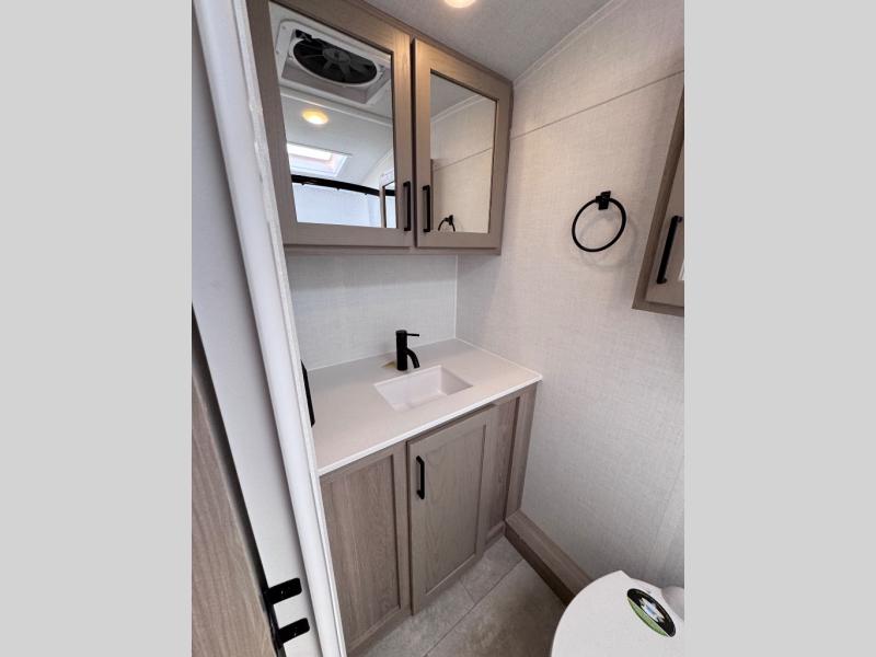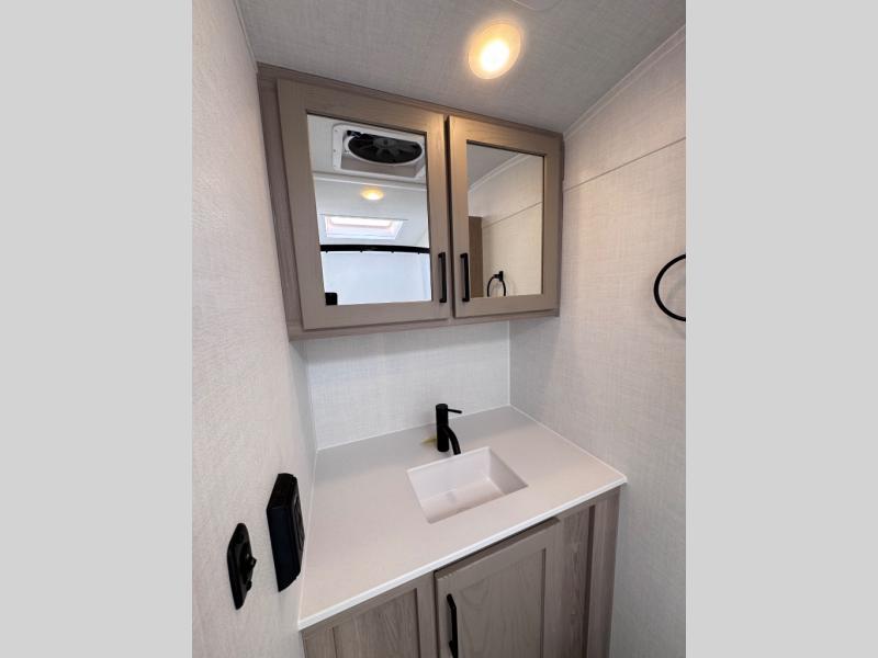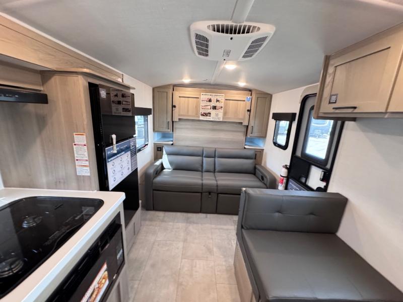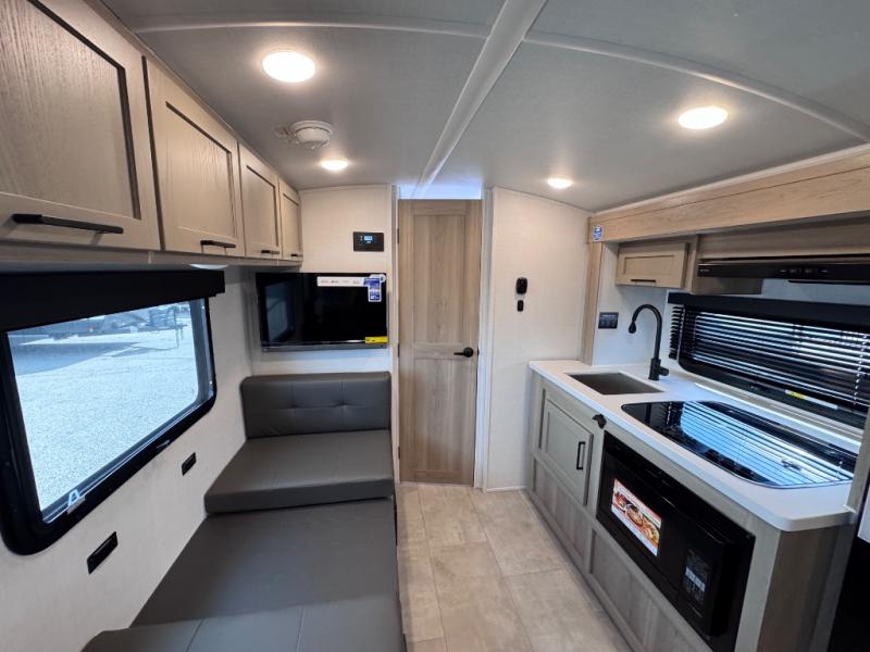 Camp with your favorite person in this trailer with the versatile Murphy bed/sofa combo up front giving you both a living area and a bedroom when you so choose. If you need sleeping space for one more, the dinette will provide that once easily setup. The large window gives you great views while dining or playing games. There is extra floor space in this trailer with the kitchen slide out that offers full amenities plus a sink to keep everything clean. And the full-length rear bathroom offers a spacious area to change your clothes in privacy and get cleaned up in the large shower.