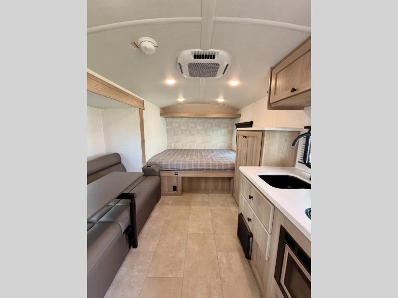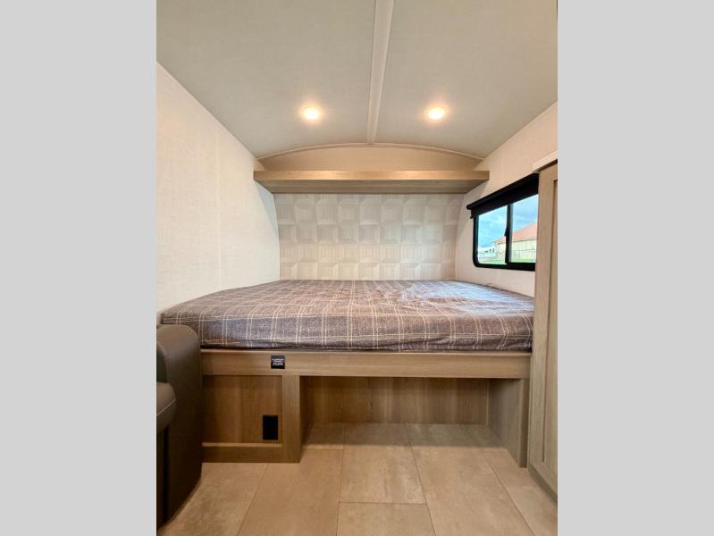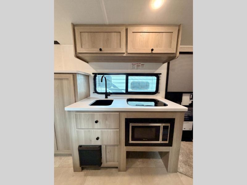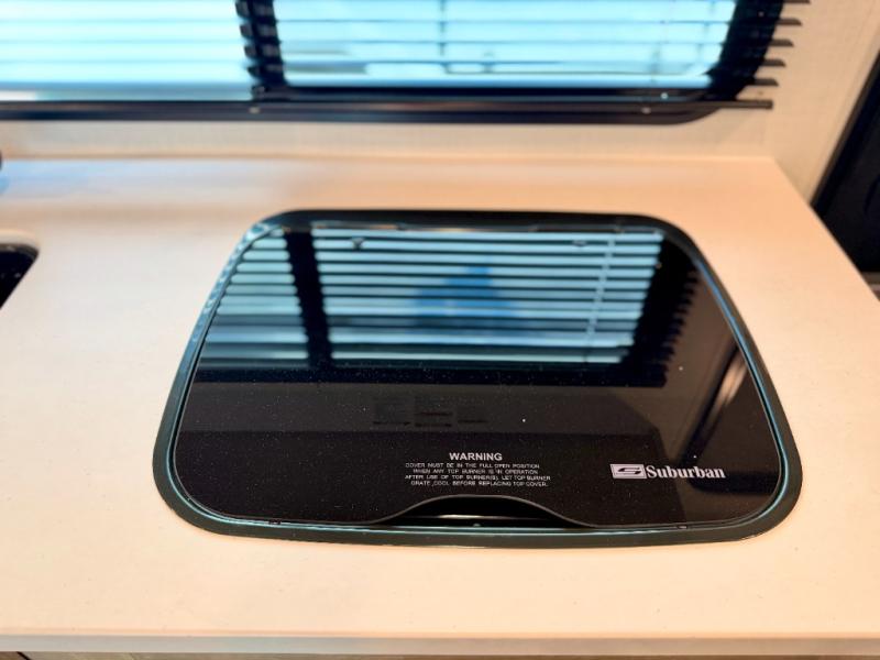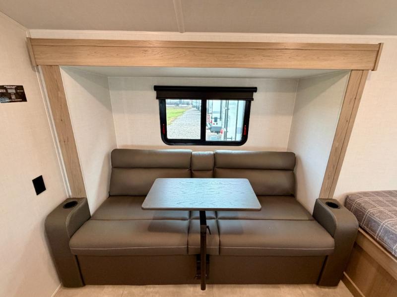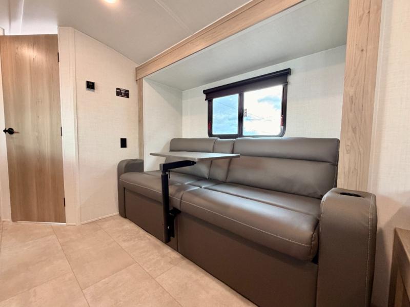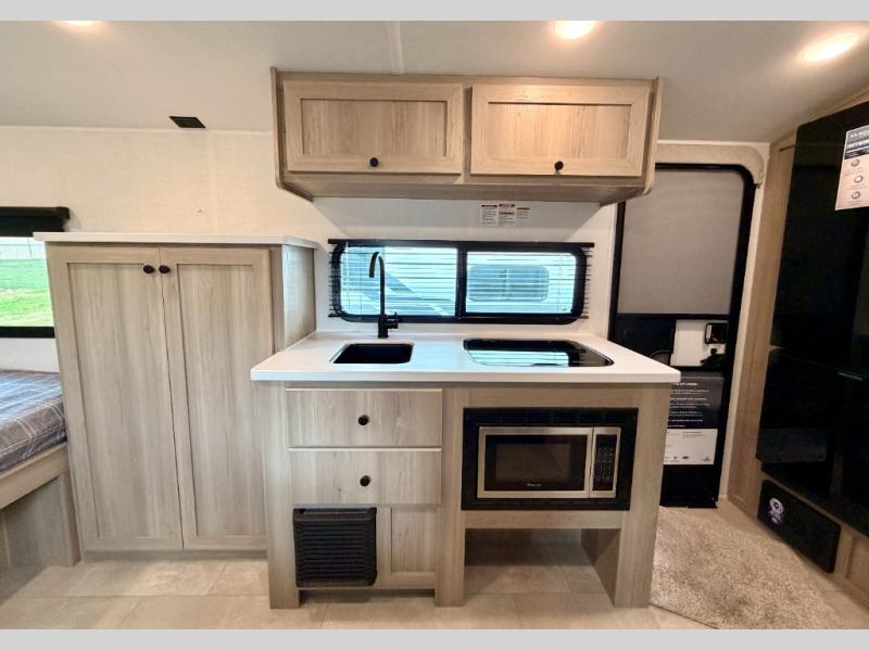 Time spent in this spacious travel trailer will be time well spent! You can wake up each morning on the front queen bed that includes an overhead shelf and a wardrobe close by, allowing you to grab some clean clothes. There is also a rear corner full dry bath, which is a comfort you won't want to camp without. A full kitchen is complete with a two-burner cooktop, microwave oven and a refrigerator, allowing you to cook and store your favorite meals. And don't overlook the sofa with a 30" x 15" table within the slide out for dining or card game space!