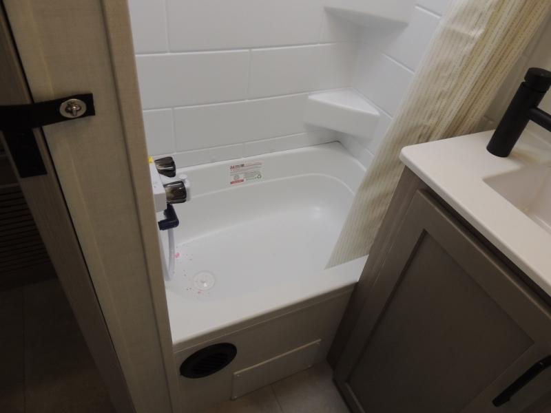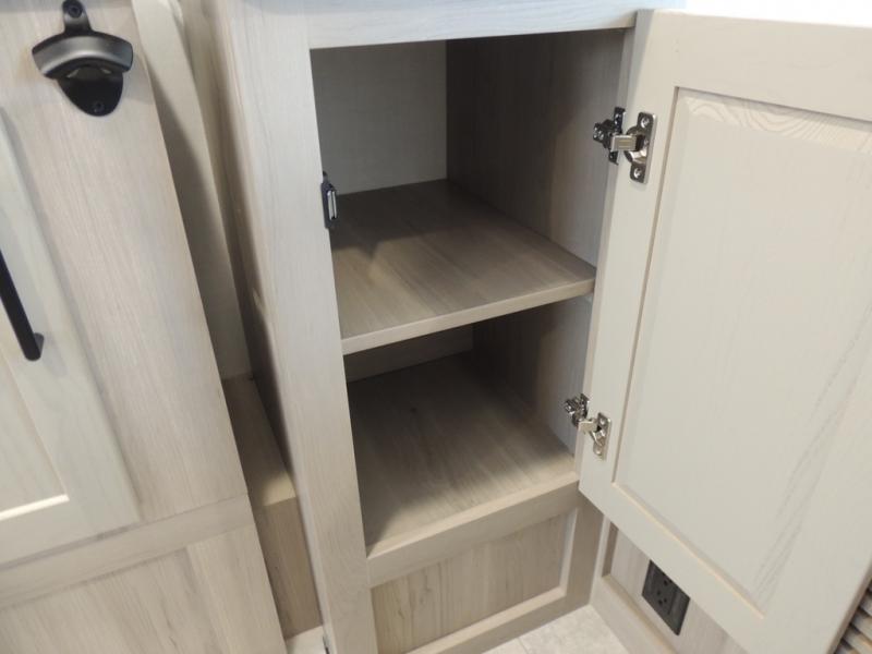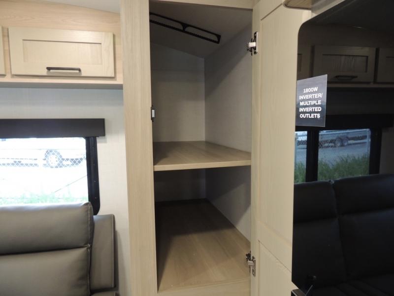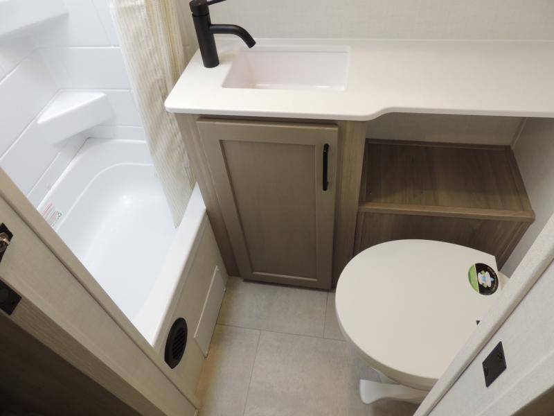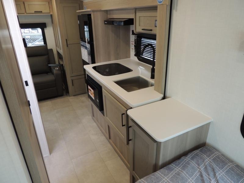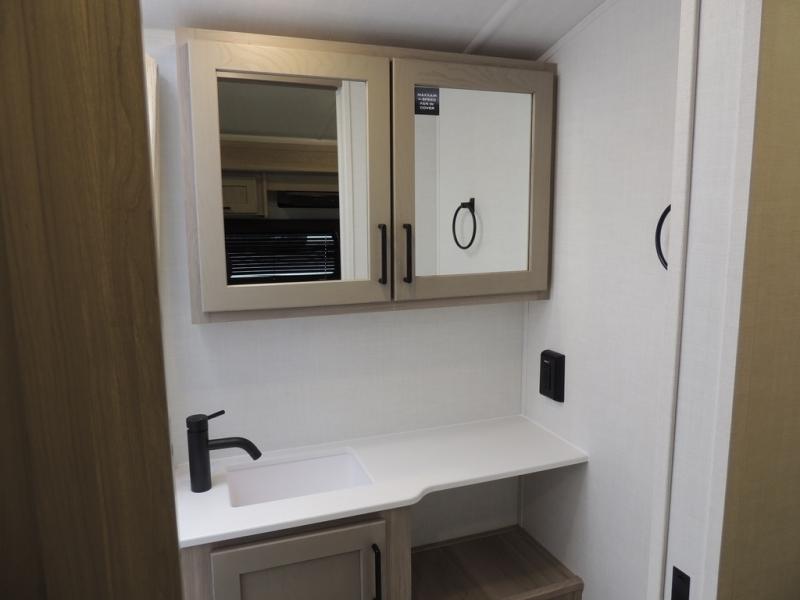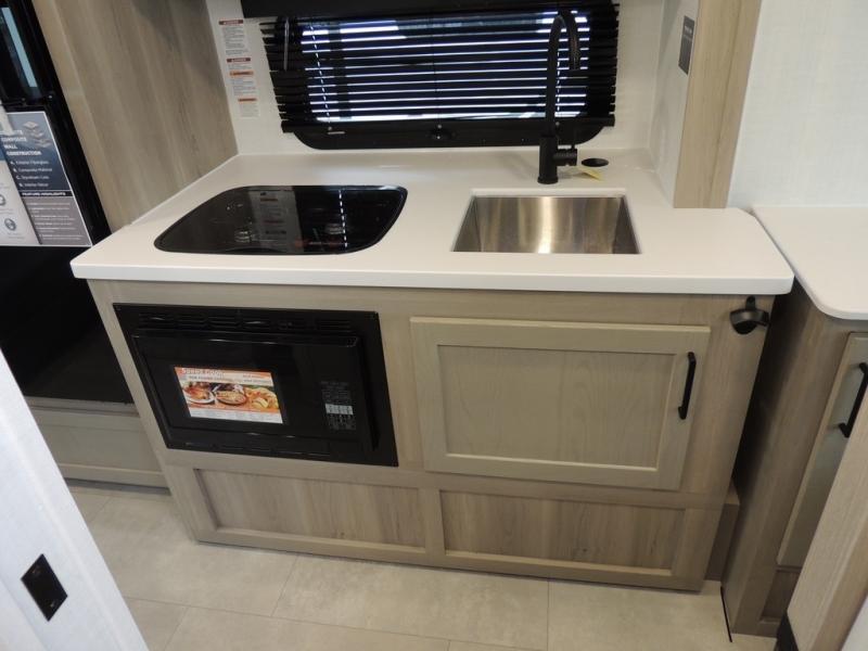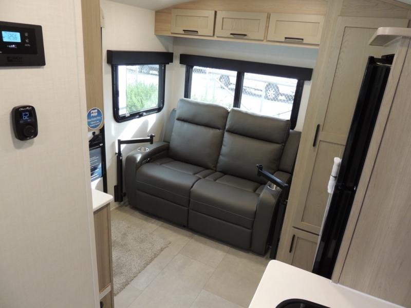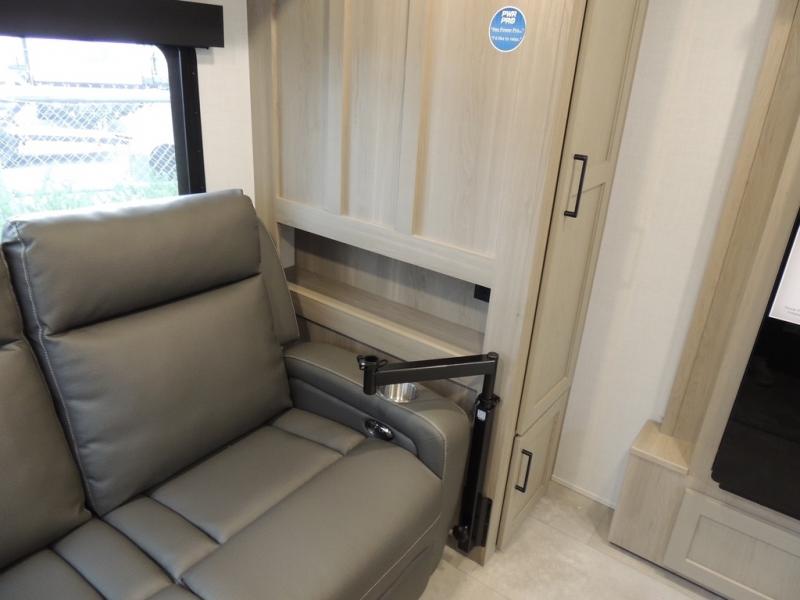 Start having unforgettable adventures with this amazing travel trailer! The queen-sized bed is the perfect spot to unwind and recharge after a day of exploring, offering a restful sleeping space that's sure to leave you feeling refreshed. The full bathroom has everything you need to refresh and rejuvenate in private. In the kitchen-living room combined area, you will find a three-burner cooktop for gourmet meals, a convection microwave for quick and easy cooking, and a spacious fridge to keep your ingredients fresh, plus overhead cabinets and a pantry/closet provide ample storage for cookware, dishes, and food. In addition, you can have endless evenings of amusement in the theater seat, which is the perfect spot to relax and enjoy your favorite shows or movies on the TV. On the outside, the exterior awning provides a shaded spot to enjoy the outdoors, while the pass-through storage offers plenty of room for gear, luggage, and equipment.