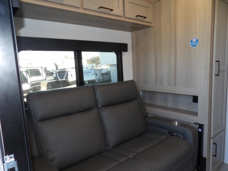 Start having unforgettable adventures with this amazing travel trailer! The queen-sized bed is the perfect spot to unwind and recharge after a day of exploring, offering a restful sleeping space that's sure to leave you feeling refreshed. The full bathroom has everything you need to refresh and rejuvenate in private. In the kitchen-living room combined area, you will find a three-burner cooktop for gourmet meals, a convection microwave for quick and easy cooking, and a spacious fridge to keep your ingredients fresh, plus overhead cabinets and a pantry/closet provide ample storage for cookware, dishes, and food. In addition, you can have endless evenings of amusement in the theater seat, which is the perfect spot to relax and enjoy your favorite shows or movies on the TV. On the outside, the exterior awning provides a shaded spot to enjoy the outdoors, while the pass-through storage offers plenty of room for gear, luggage, and equipment.