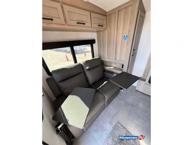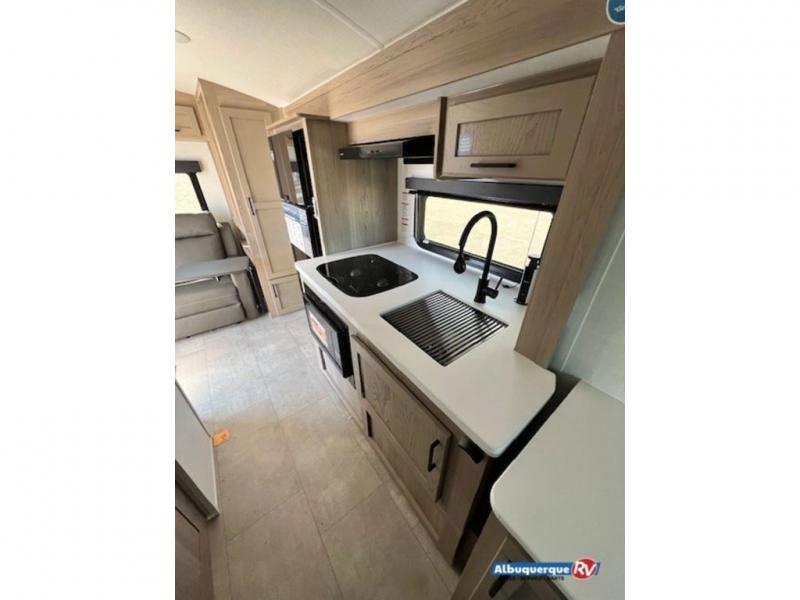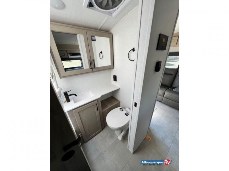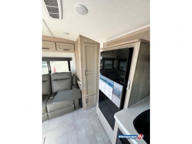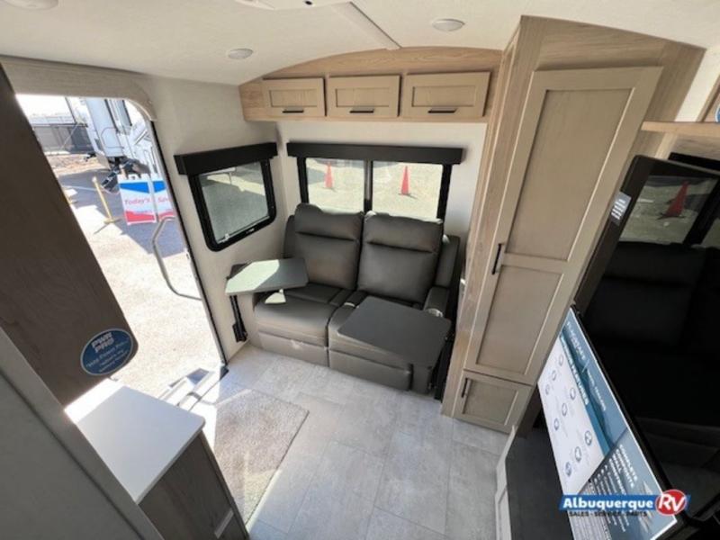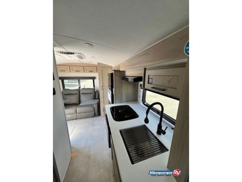 Start having unforgettable adventures with this amazing travel trailer! The queen-sized bed is the perfect spot to unwind and recharge after a day of exploring, offering a restful sleeping space that's sure to leave you feeling refreshed. The full bathroom has everything you need to refresh and rejuvenate in private. In the kitchen-living room combined area, you will find a three-burner cooktop for gourmet meals, a convection microwave for quick and easy cooking, and a spacious fridge to keep your ingredients fresh, plus overhead cabinets and a pantry/closet provide ample storage for cookware, dishes, and food. In addition, you can have endless evenings of amusement in the theater seat, which is the perfect spot to relax and enjoy your favorite shows or movies on the TV. On the outside, the exterior awning provides a shaded spot to enjoy the outdoors, while the pass-through storage offers plenty of room for gear, luggage, and equipment.
