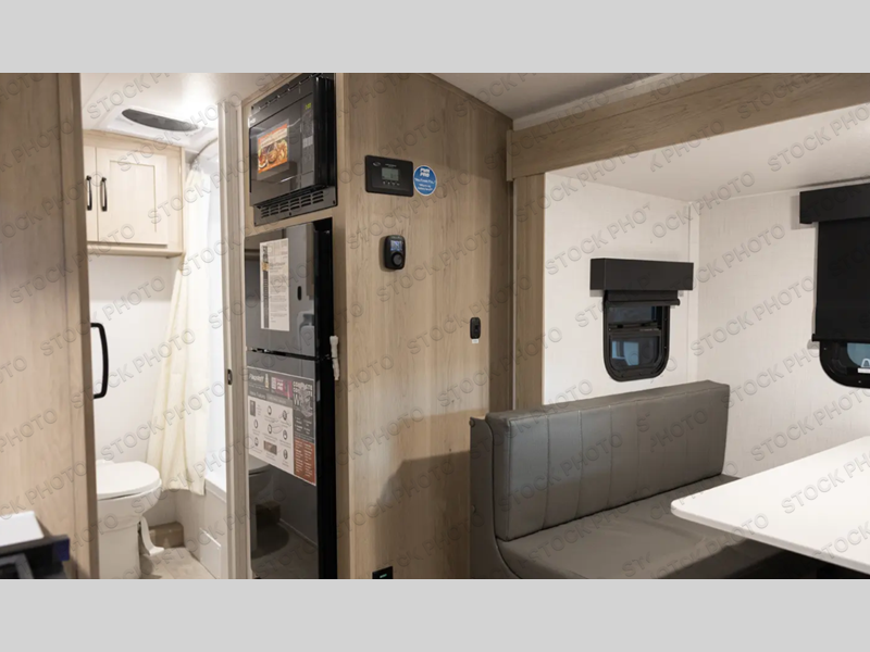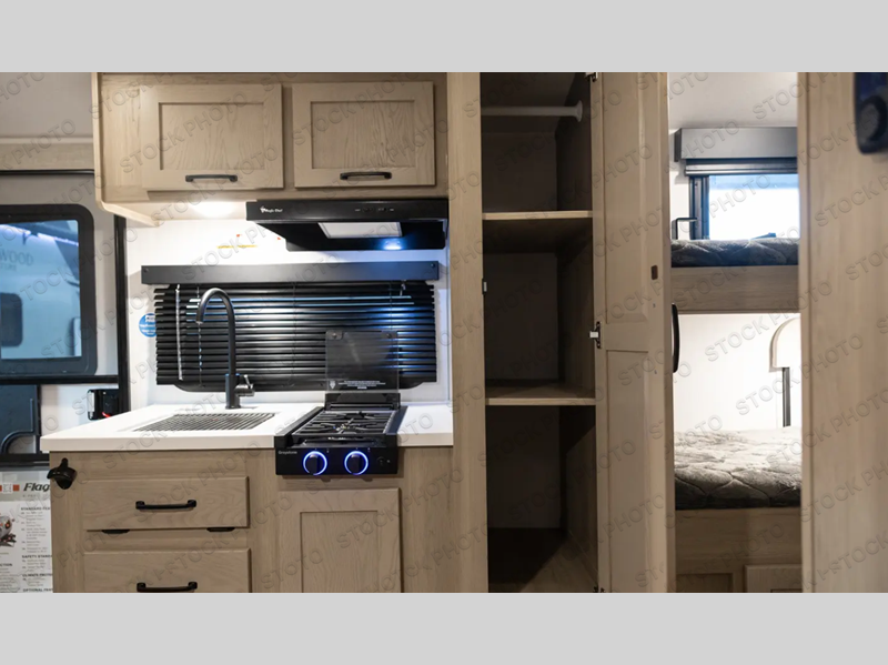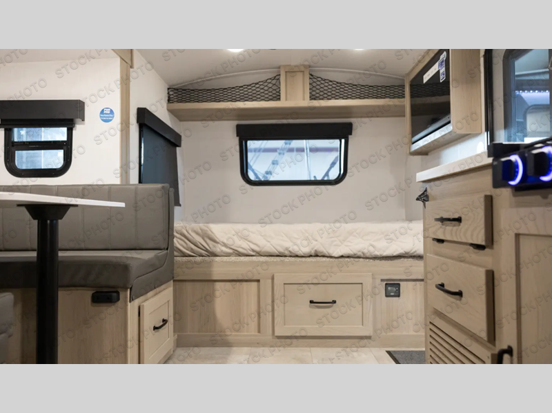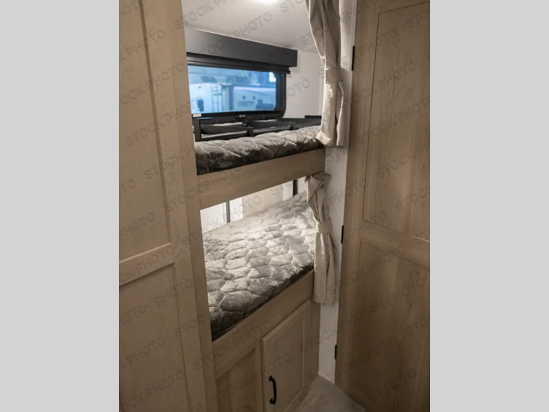 This spacious bunk trailer will work perfectly for a family or friend group that enjoys their own sleeping space, plus more floor space with the dinette slide out that can sleep one to two. The bottom bunk even flips up so you can stow away your bikes, totes and such through the bike door for secure travels. There is exterior storage for more outdoor gear, and interior storage found throughout. The cook will love having a pantry and overhead cabinets for snacks, canned goods, dishes and more. After making a warm meal, the 12V refrigerator can hold the leftovers. There is also a flip-down lavy sink in the full bath for added space when not in use!