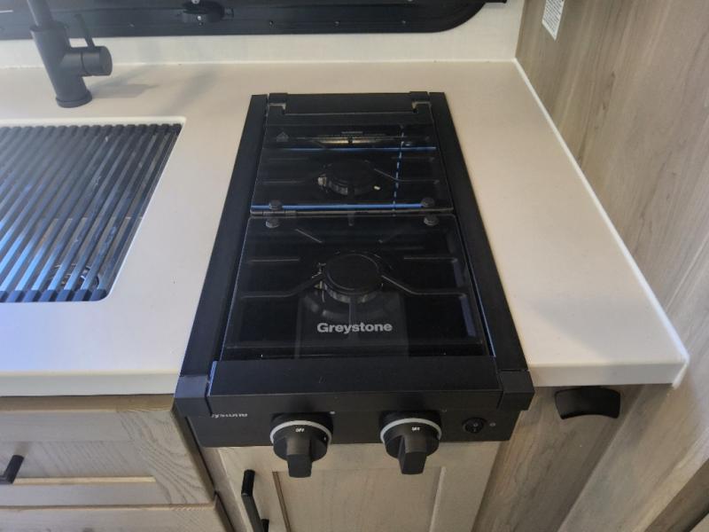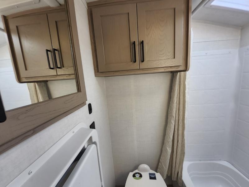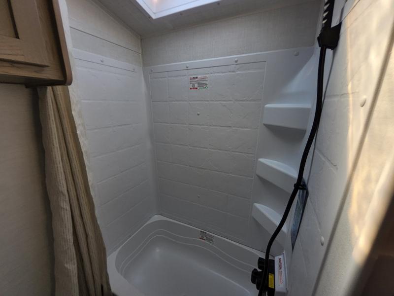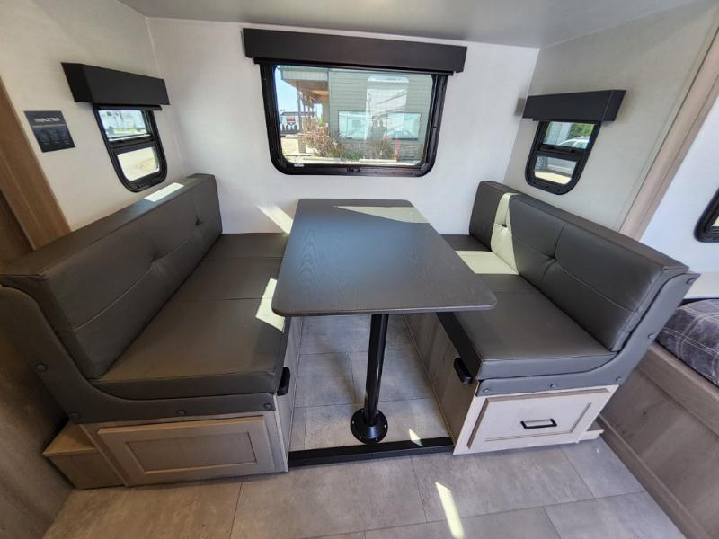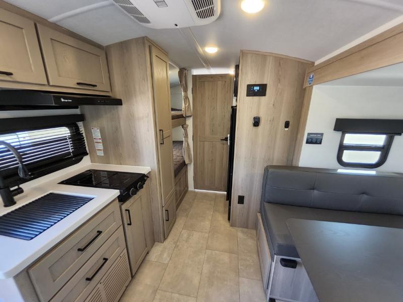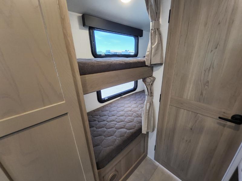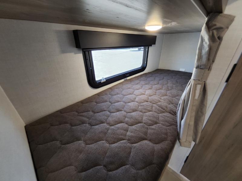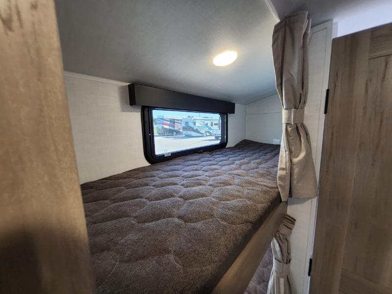 This spacious bunk trailer will work perfectly for a family or friend group that enjoys their own sleeping space, plus more floor space with the dinette slide out that can sleep one to two. There are two bunks so you or your kids can sleep. There is exterior storage for more outdoor gear, and interior storage found throughout. The cook will love having a pantry and overhead cabinets for snacks, canned goods, dishes and more. After making a warm meal, the 12V refrigerator can hold the leftovers. There is also a flip-down lavy sink in the full bath for added space when not in use!