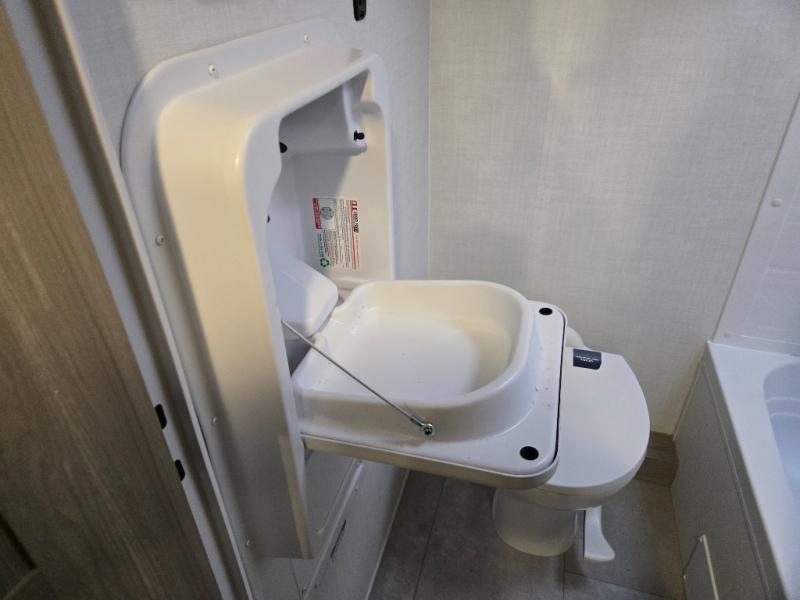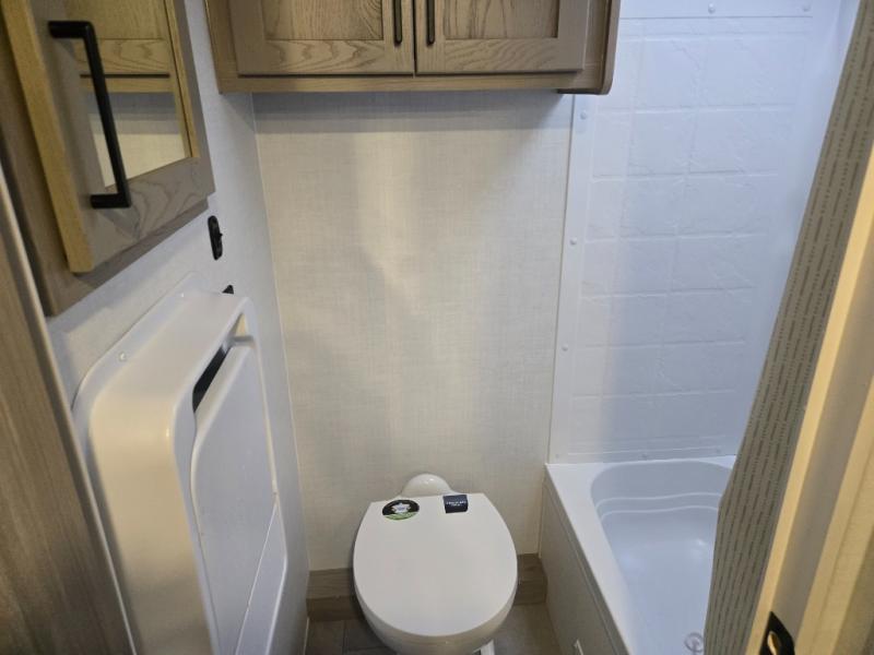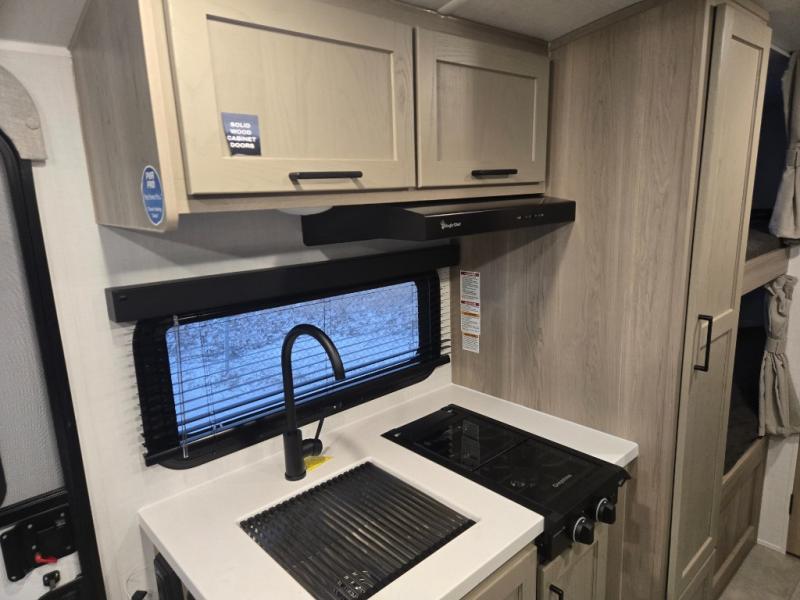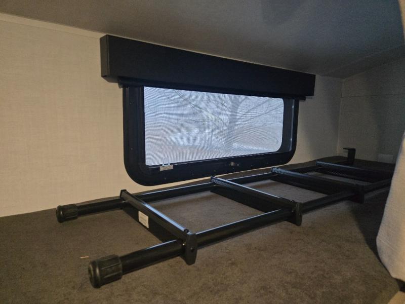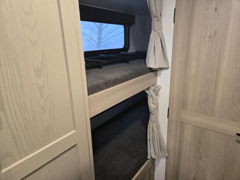 This spacious bunk trailer will work perfectly for a family or friend group that enjoys their own sleeping space, plus more floor space with the dinette slide out that can sleep one to two. There are two bunks so you or your kids can sleep. There is exterior storage for more outdoor gear, and interior storage found throughout. The cook will love having a pantry and overhead cabinets for snacks, canned goods, dishes and more. After making a warm meal, the 12V refrigerator can hold the leftovers. There is also a flip-down lavy sink in the full bath for added space when not in use!