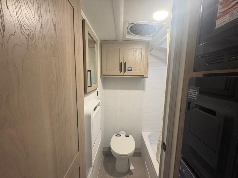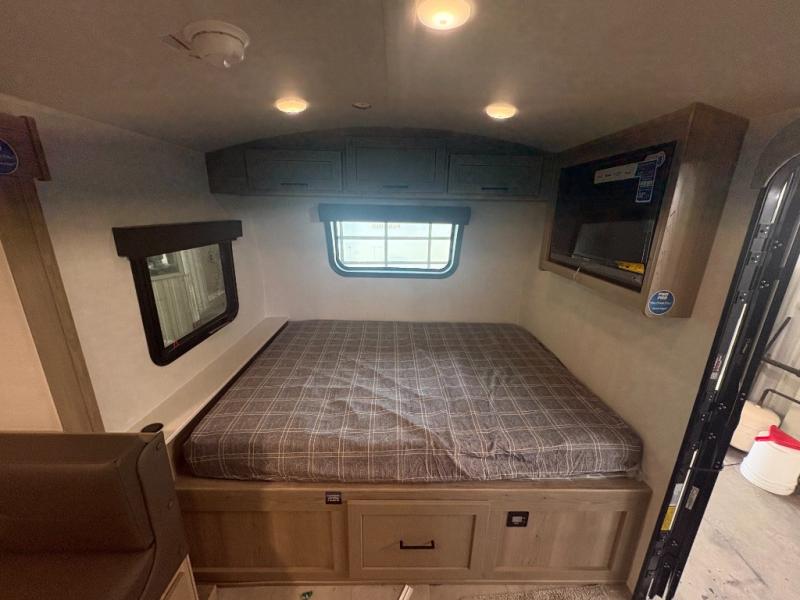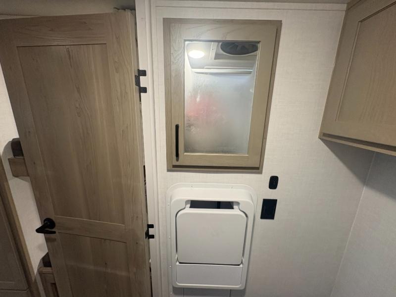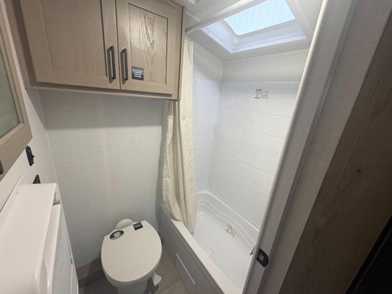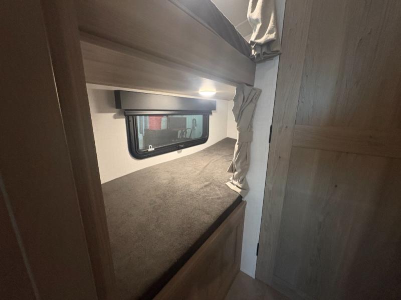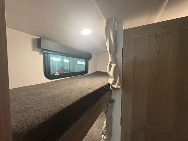 This spacious bunk trailer will work perfectly for a family or friend group that enjoys their own sleeping space, plus more floor space with the dinette slide out that can sleep one to two. There are two bunks so you or your kids can sleep. There is exterior storage for more outdoor gear, and interior storage found throughout. The cook will love having a pantry and overhead cabinets for snacks, canned goods, dishes and more. After making a warm meal, the 12V refrigerator can hold the leftovers. There is also a flip-down lavy sink in the full bath for added space when not in use!