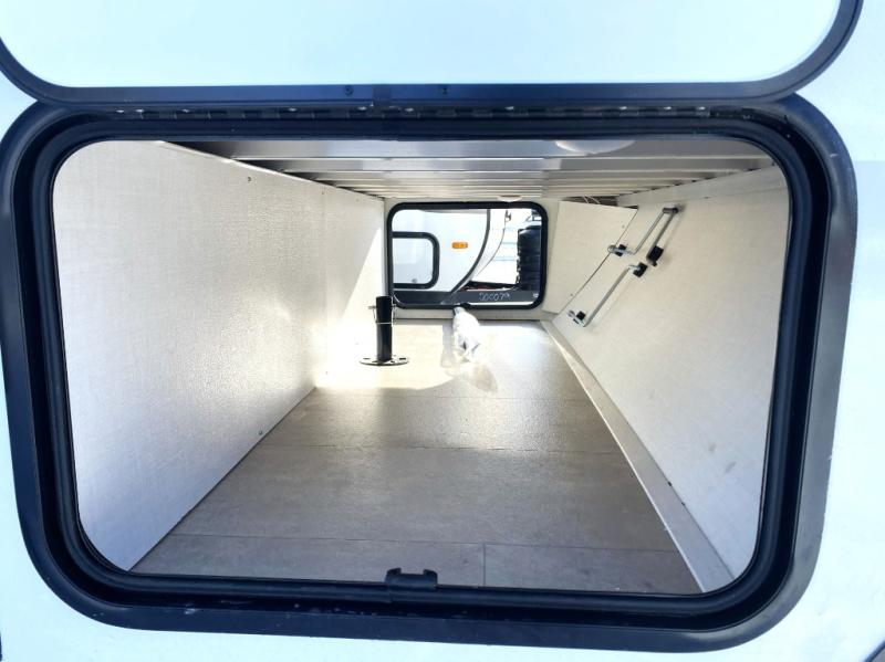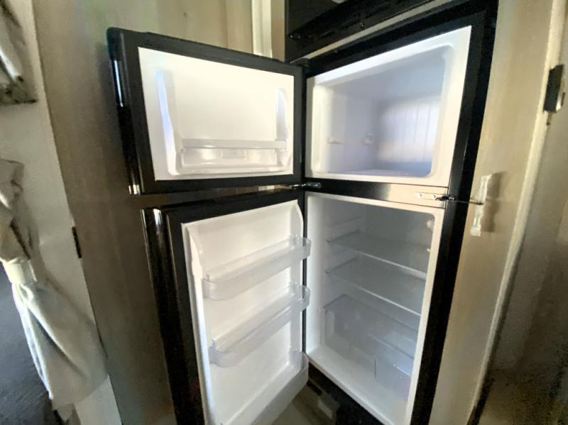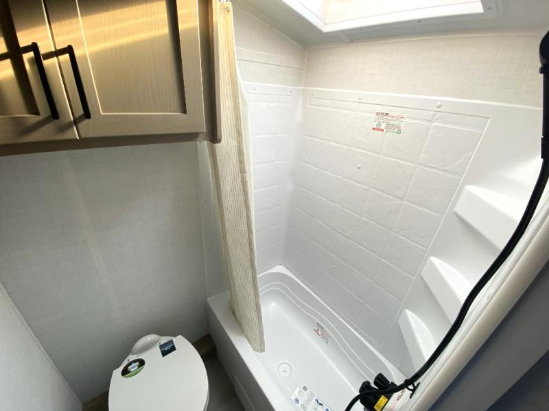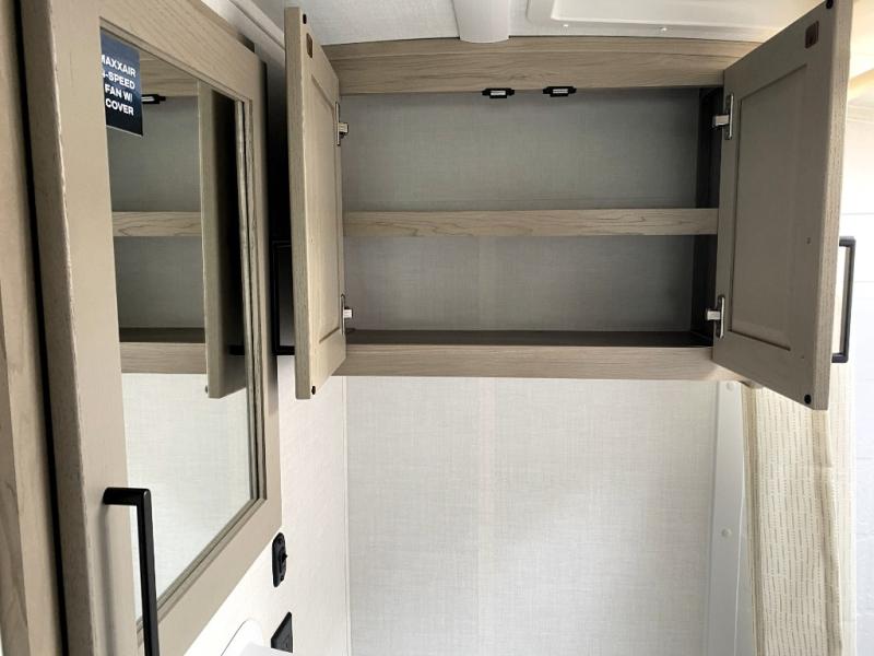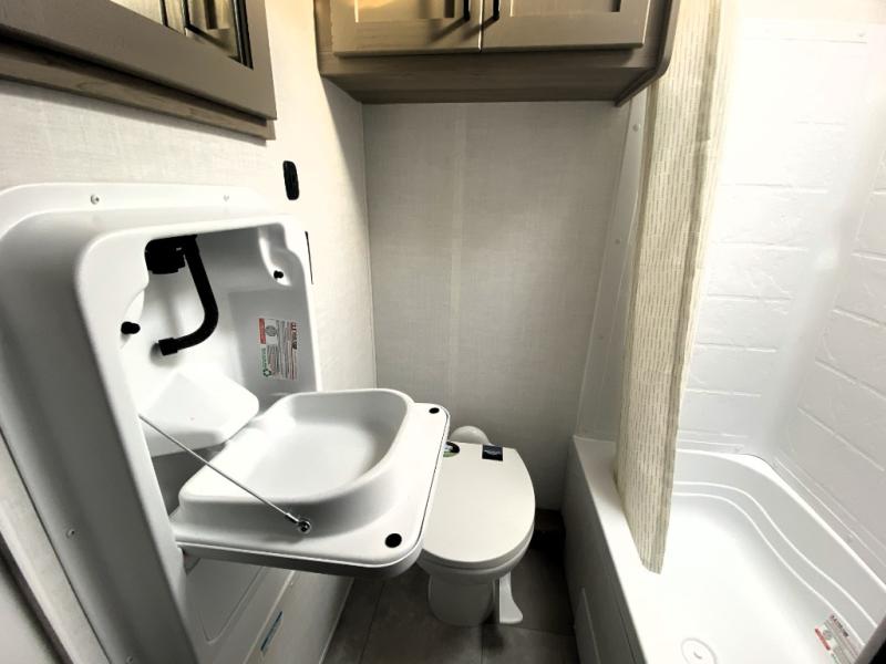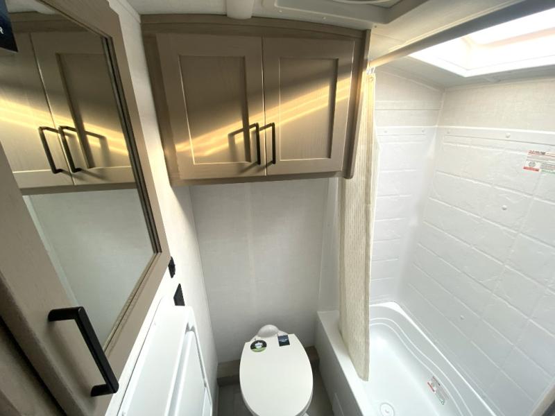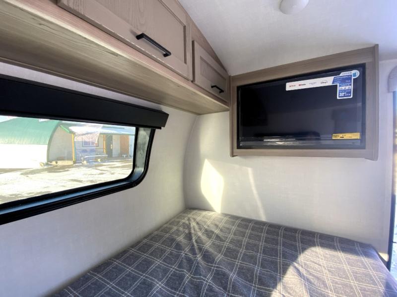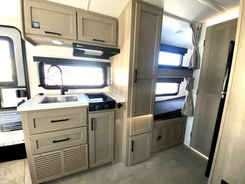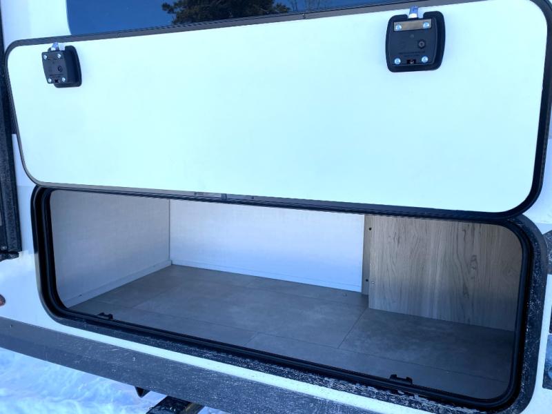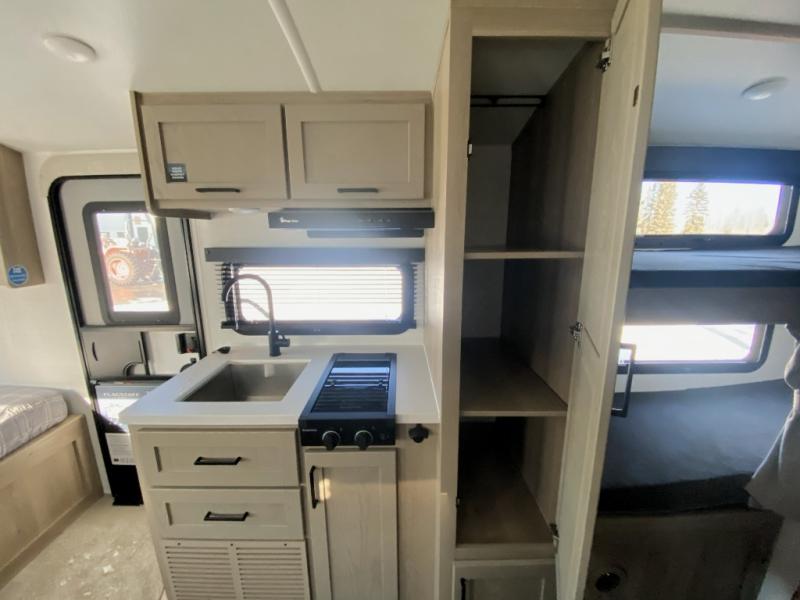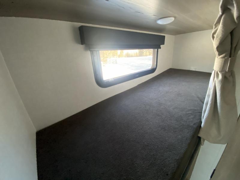 This spacious bunk trailer will work perfectly for a family or friend group that enjoys their own sleeping space, plus more floor space with the dinette slide out that can sleep one to two. There are two bunks so you or your kids can sleep. There is exterior storage for more outdoor gear, and interior storage found throughout. The cook will love having a pantry and overhead cabinets for snacks, canned goods, dishes and more. After making a warm meal, the 12V refrigerator can hold the leftovers. There is also a flip-down lavy sink in the full bath for added space when not in use!
