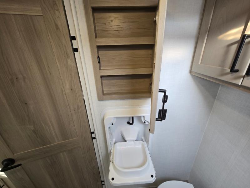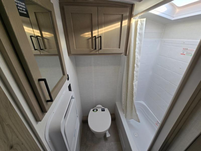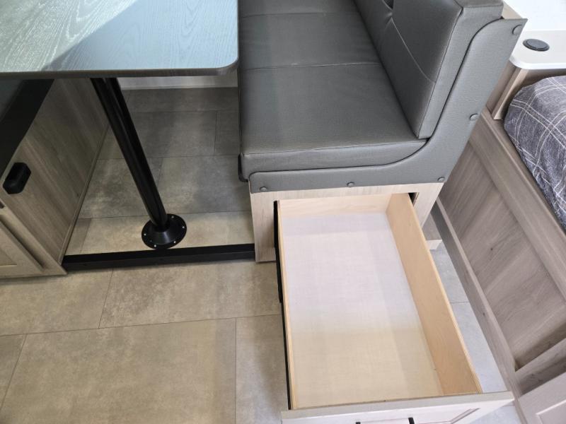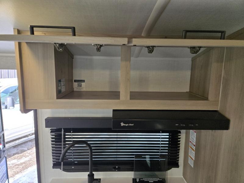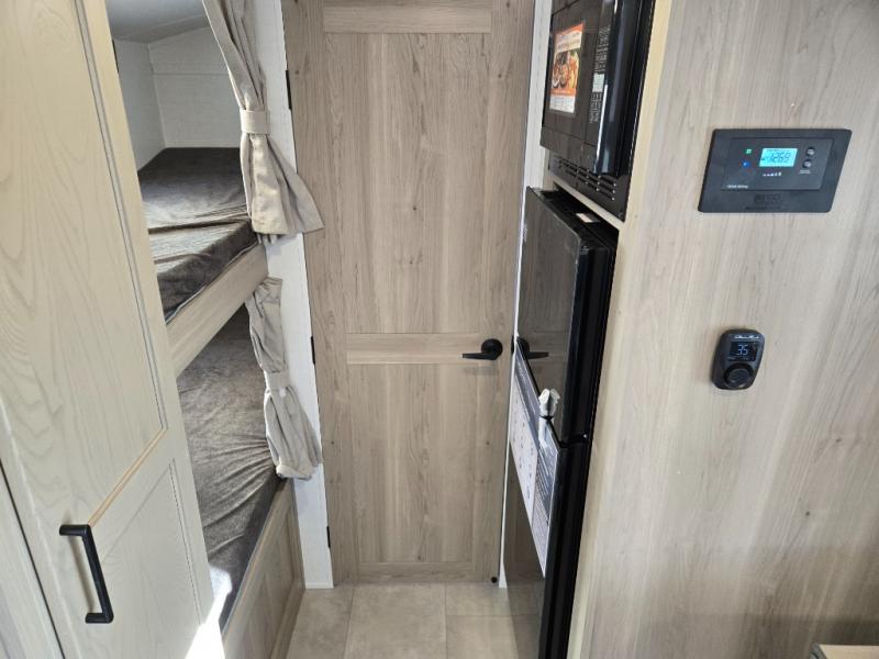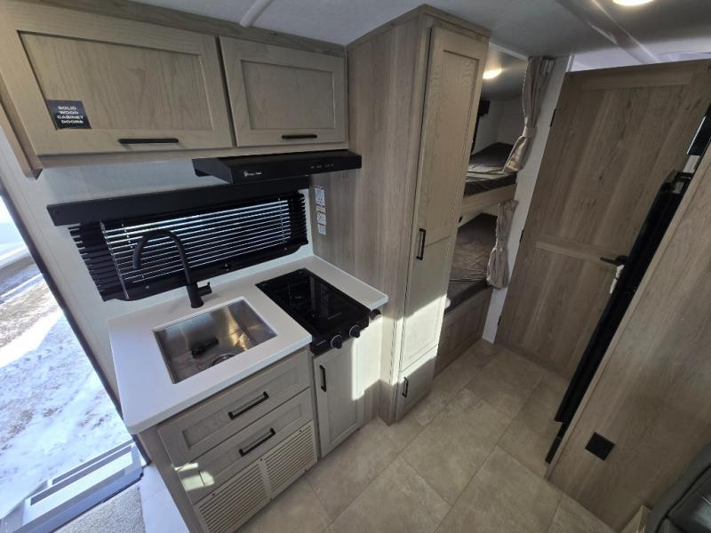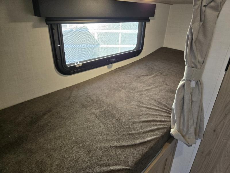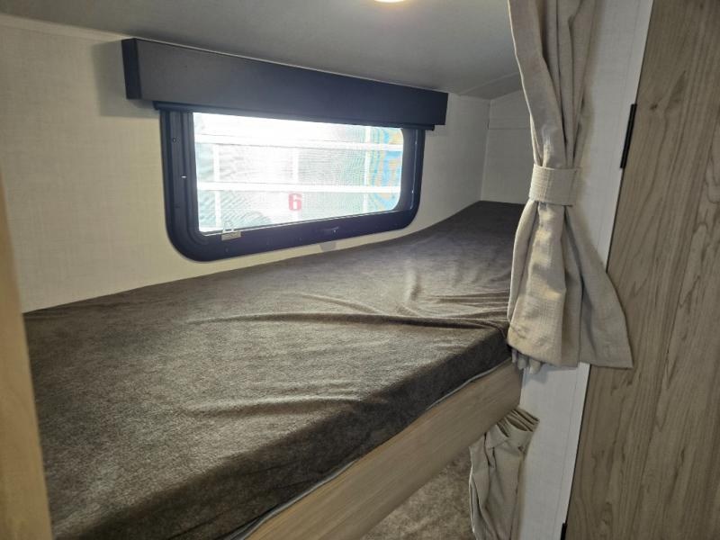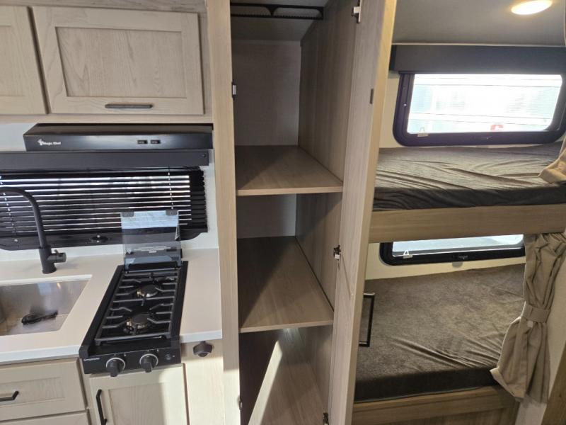 This spacious bunk trailer will work perfectly for a family or friend group that enjoys their own sleeping space, plus more floor space with the dinette slide out that can sleep one to two. There are two bunks so you or your kids can sleep. There is exterior storage for more outdoor gear, and interior storage found throughout. The cook will love having a pantry and overhead cabinets for snacks, canned goods, dishes and more. After making a warm meal, the 12V refrigerator can hold the leftovers. There is also a flip-down lavy sink in the full bath for added space when not in use!