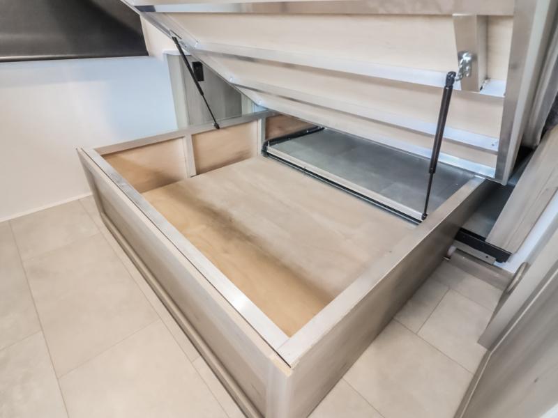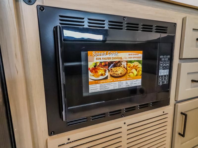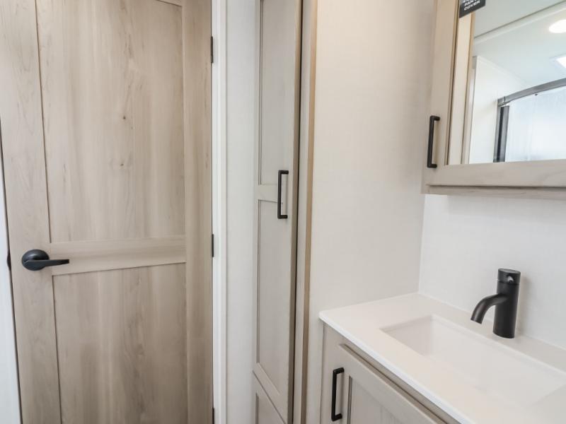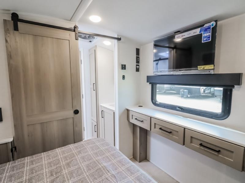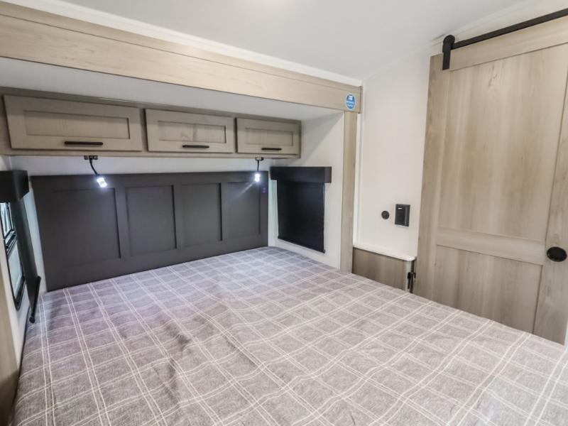 Unwind and relax in style, with plenty of storage space to keep you organized. The rear bedroom is a peaceful retreat, featuring a queen bed, spacious wardrobe, desk, and TV. The walkthrough bathroom is a practical and refreshing space, with a linen closet to keep your towels and toiletries tidy. Plus, the kitchen is equipped with a fridge, convection microwave, dinette, sink, and overhead cabinets, so you can prepare delicious meals and snacks with ease and enjoy quality time with loved ones.
