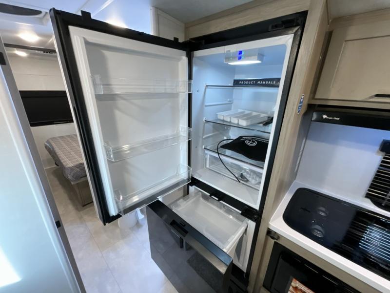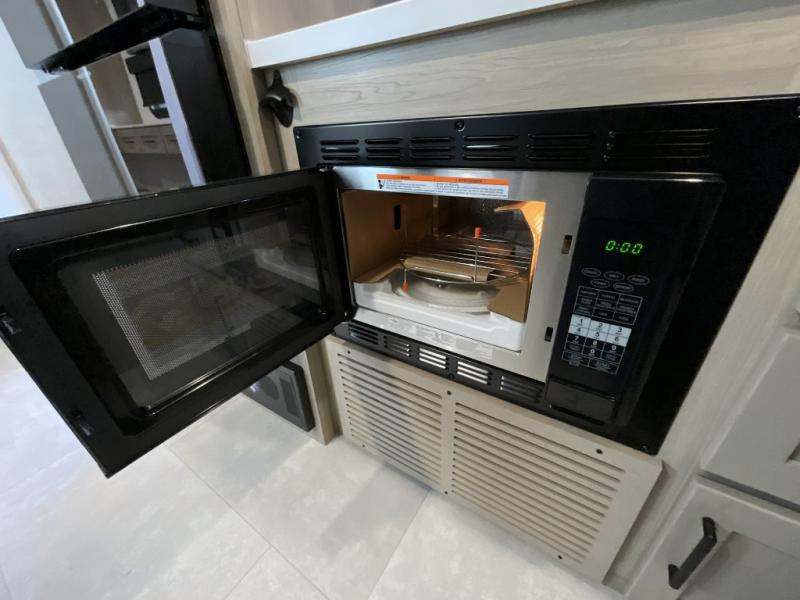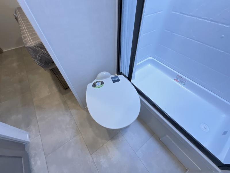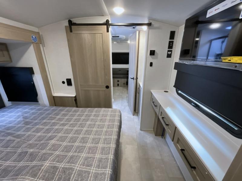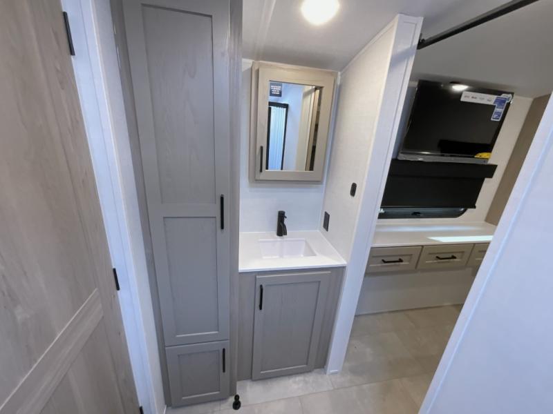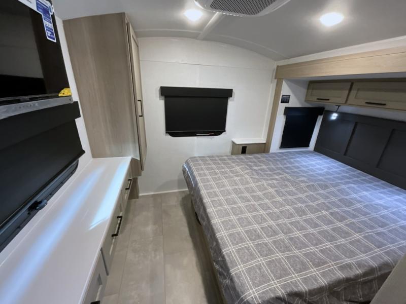 Unwind and relax in style, with plenty of storage space to keep you organized. The rear bedroom is a peaceful retreat, featuring a queen bed, spacious wardrobe, desk, and TV. The walkthrough bathroom is a practical and refreshing space, with a linen closet to keep your towels and toiletries tidy. Plus, the kitchen is equipped with a fridge, convection microwave, dinette, sink, and overhead cabinets, so you can prepare delicious meals and snacks with ease and enjoy quality time with loved ones.