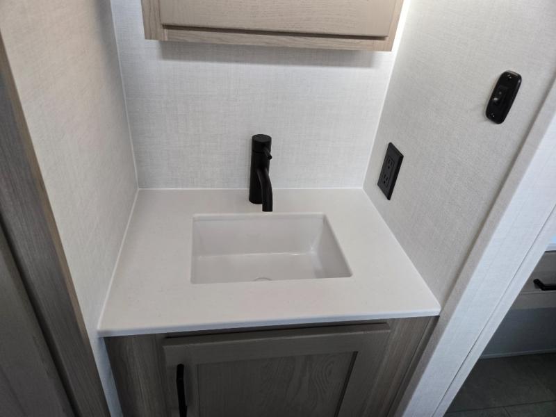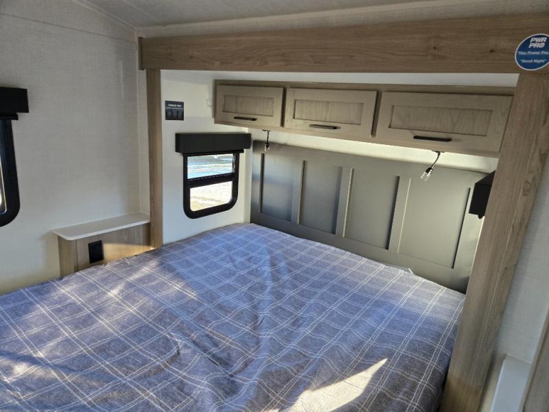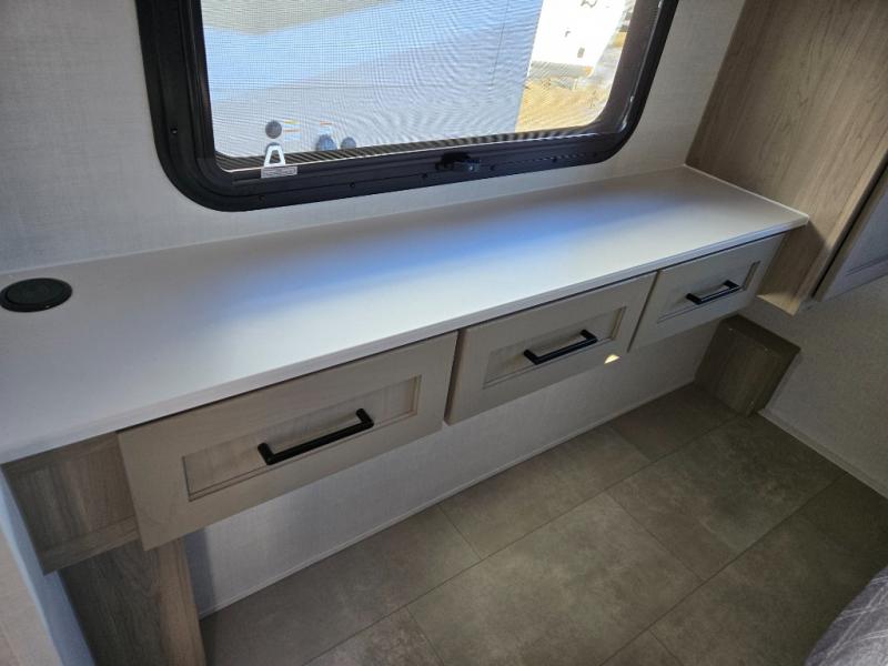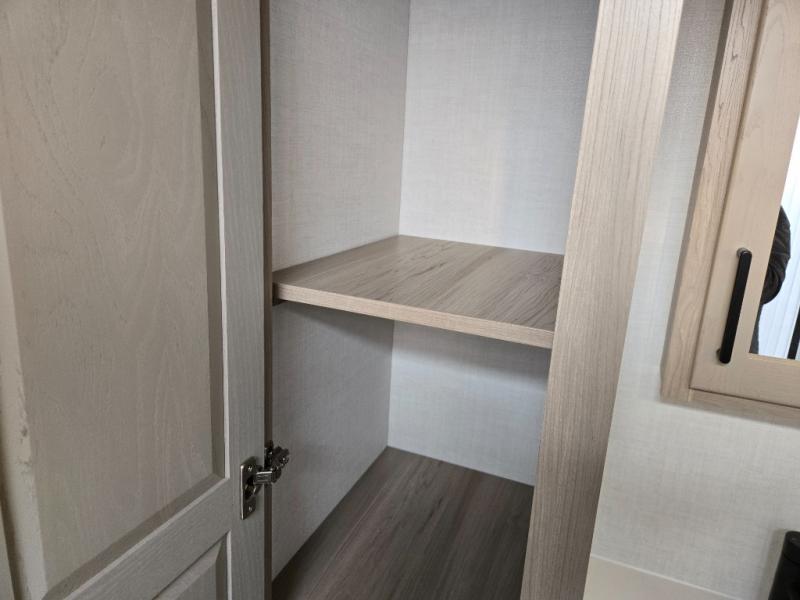 Unwind and relax in style, with plenty of storage space to keep you organized. The rear bedroom is a peaceful retreat, featuring a queen bed, spacious wardrobe, desk, and TV. The walkthrough bathroom is a practical and refreshing space, with a linen closet to keep your towels and toiletries tidy. Plus, the kitchen is equipped with a fridge, convection microwave, dinette, sink, and overhead cabinets, so you can prepare delicious meals and snacks with ease and enjoy quality time with loved ones.