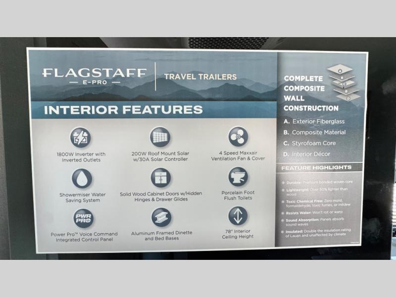 With any Flagstaff E-Pro travel trailer by Forest River, you will experience lightweight towing, style and features that will meet your needs, plus amenities that give you more than you expected! Built with interior and exterior composite sidewall construction for added strength and durability, a fully laminated roof for weather-tight protection, and aluminum truss roof bracing for enhanced stability. These trailers are equipped with Dexter leaf-spring axles for smooth towing and durable performance. The interior features an aluminum dinette, bed, and bunk, providing a strong and lightweight framework for comfortable living. Additionally, the backup camera prep ensures a safe and stress-free reversing experience. Make your selection today!
