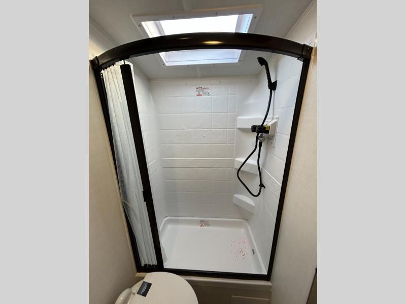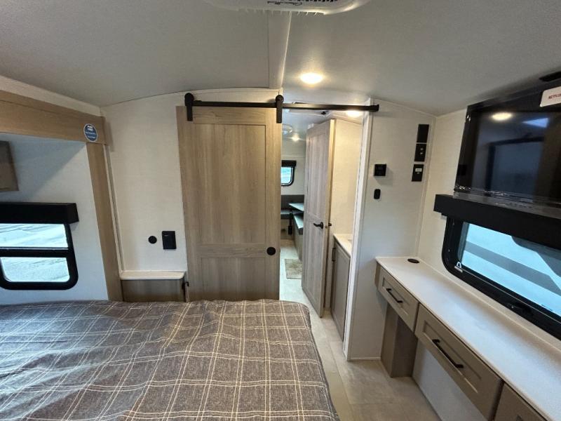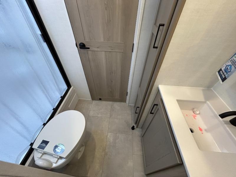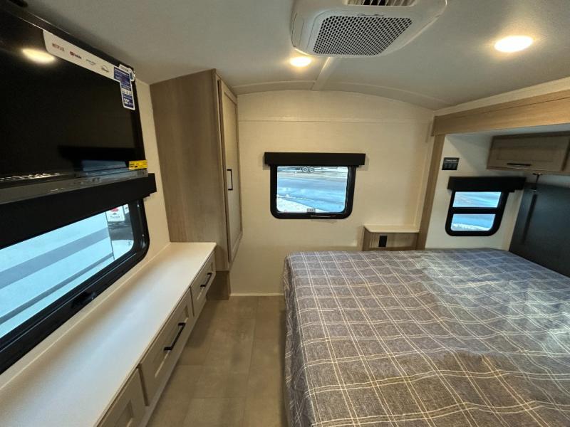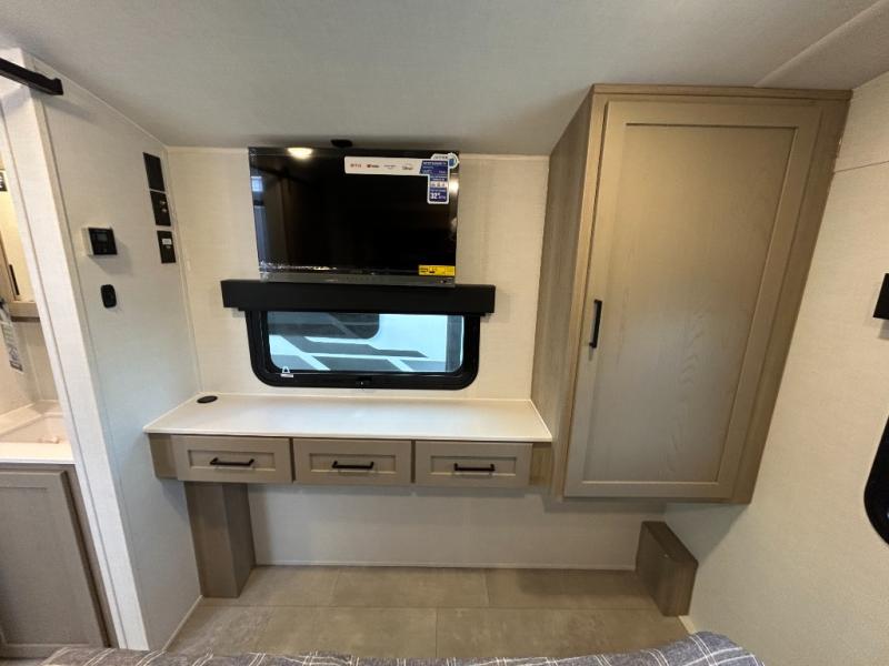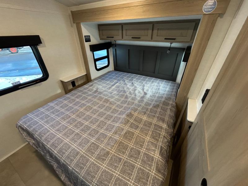 Unwind and relax in style, with plenty of storage space to keep you organized. The rear bedroom is a peaceful retreat, featuring a queen bed, spacious wardrobe, desk, and TV. The walkthrough bathroom is a practical and refreshing space, with a linen closet to keep your towels and toiletries tidy. Plus, the kitchen is equipped with a fridge, convection microwave, dinette, sink, and overhead cabinets, so you can prepare delicious meals and snacks with ease and enjoy quality time with loved ones.
