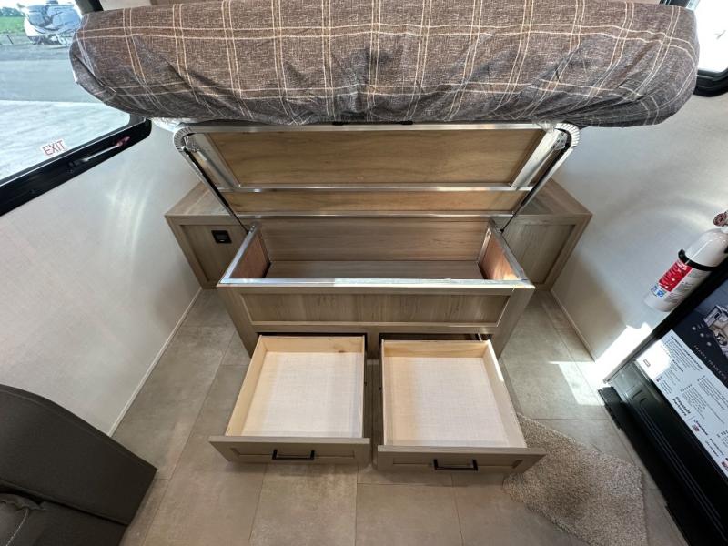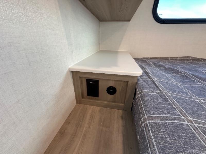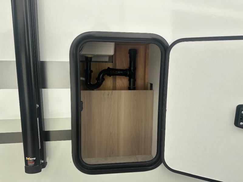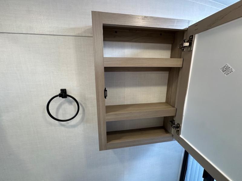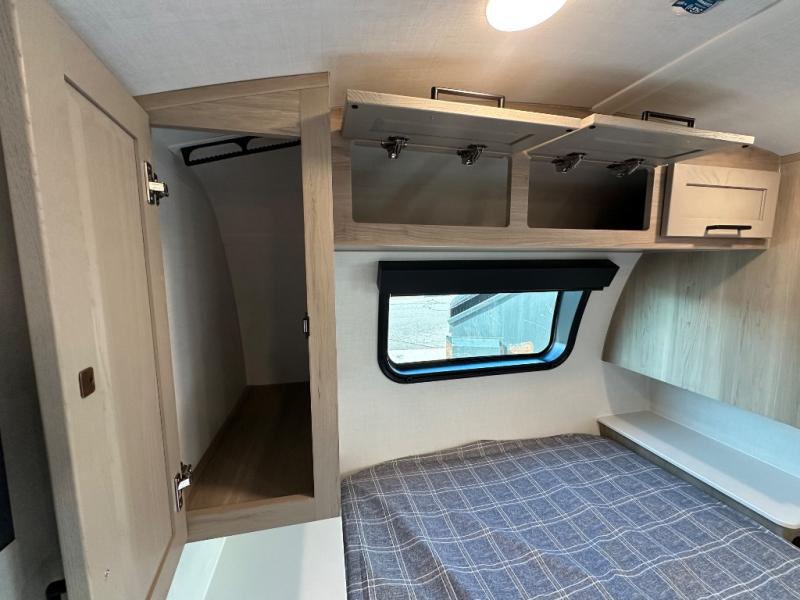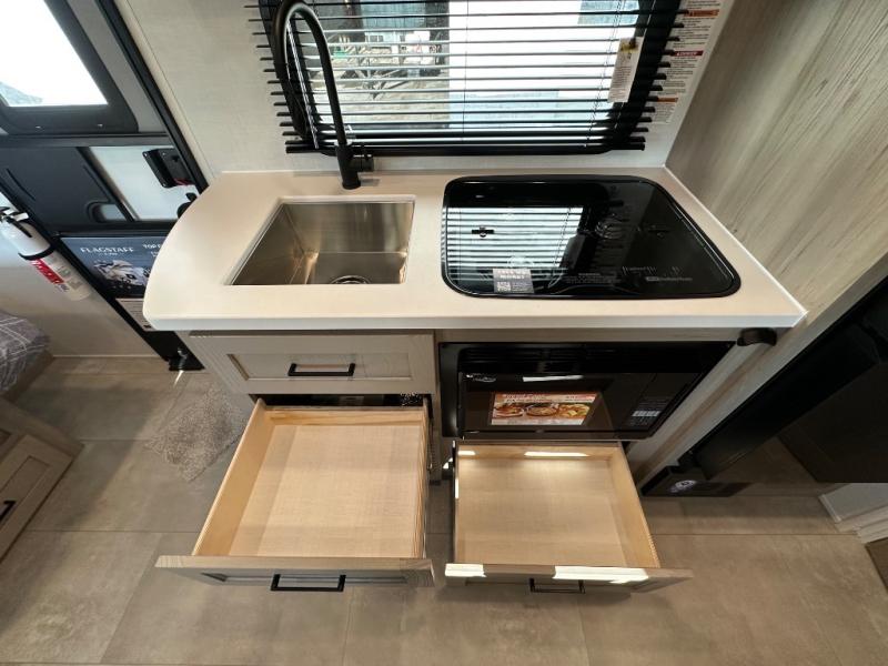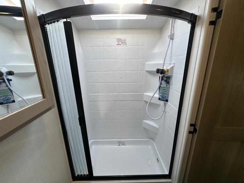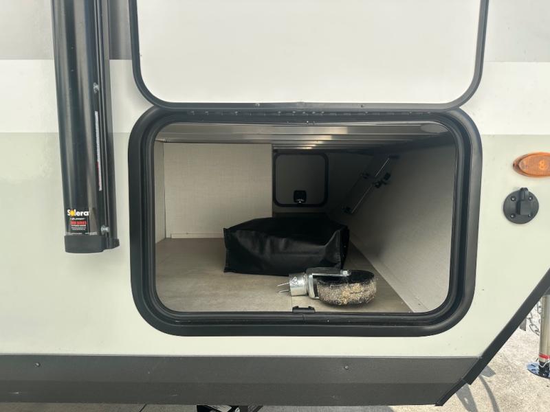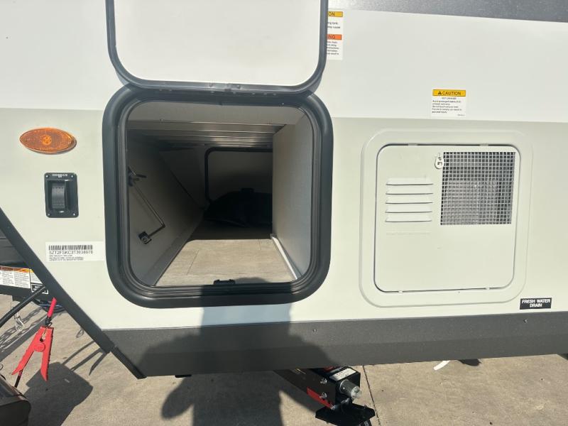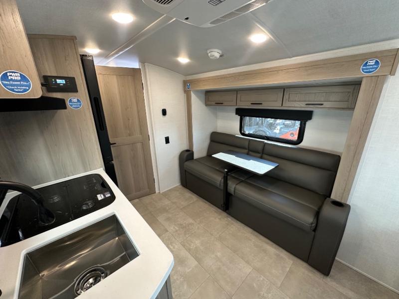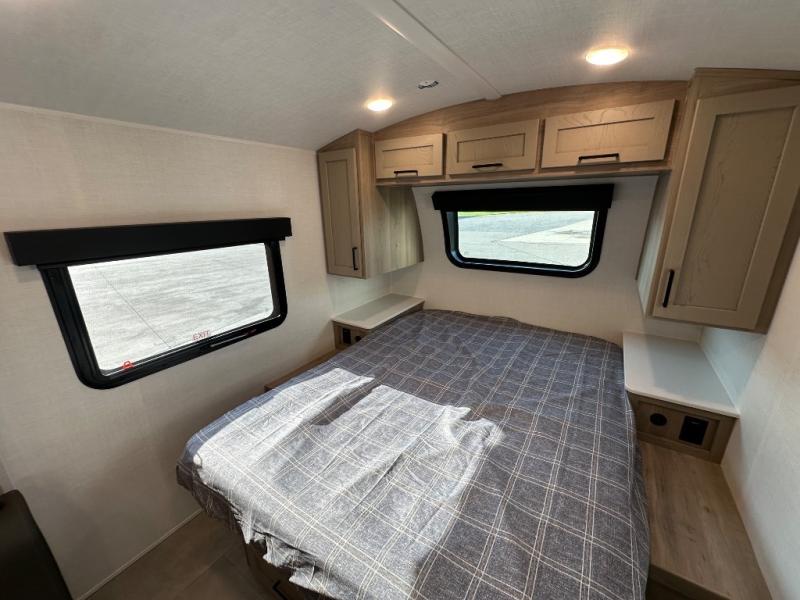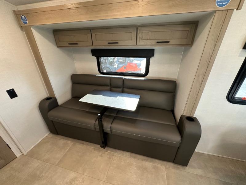 Get ready for a spacious and comfortable trip in this trailer, plus you will have a convenient rear full bathroom with an oversized shower and linen storage to utilize instead of using the campground's facilities. The walk-around full bed gives you two sides with wardrobes to claim as your own. And the kitchen offers full amenities to make meals, and the outside griddle gives you even more choices when cooking. You can relax, dine, or even work from the slide out sofa with a 30" x 15" table and watch the 32" TV. You will find storage along the exterior for your outdoor gear, plus a 14' power awning.