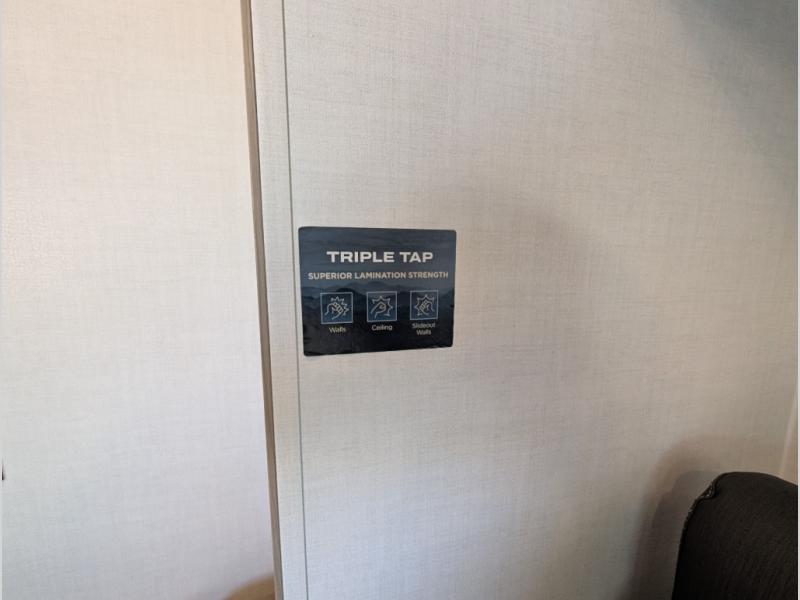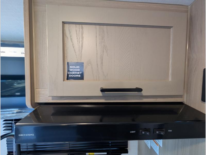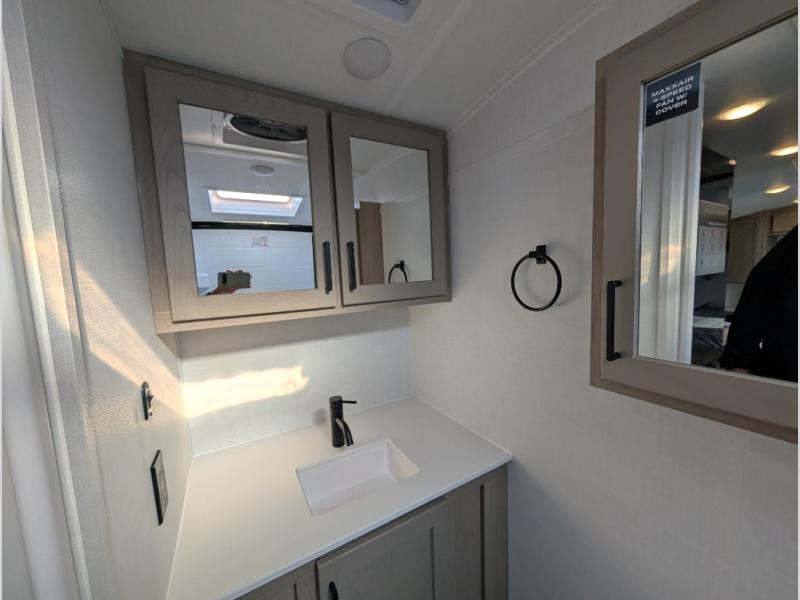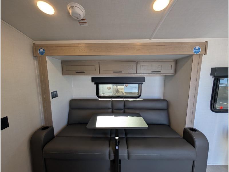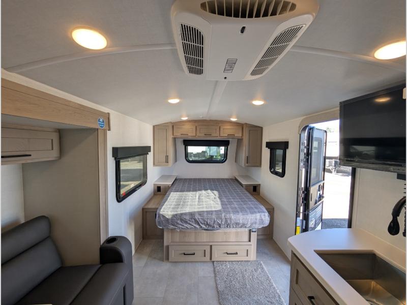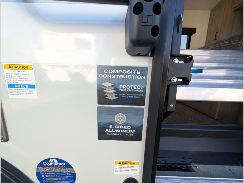 Get ready for a spacious and comfortable trip in this trailer, plus you will have a convenient rear full bathroom with an oversized shower and linen storage to utilize instead of using the campground's facilities. The walk-around full bed gives you two sides with wardrobes to claim as your own. And the kitchen offers full amenities to make meals. You can relax, dine, or even work from the slide out sofa with a 30" x 15" table and watch the TV. You will find storage along the exterior for your outdoor gear, plus a 14' power awning.