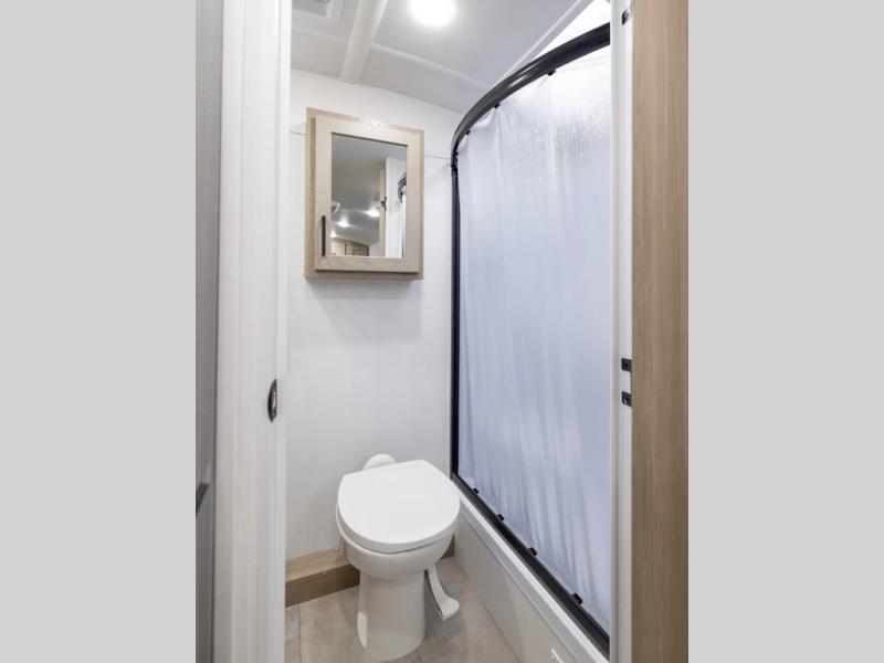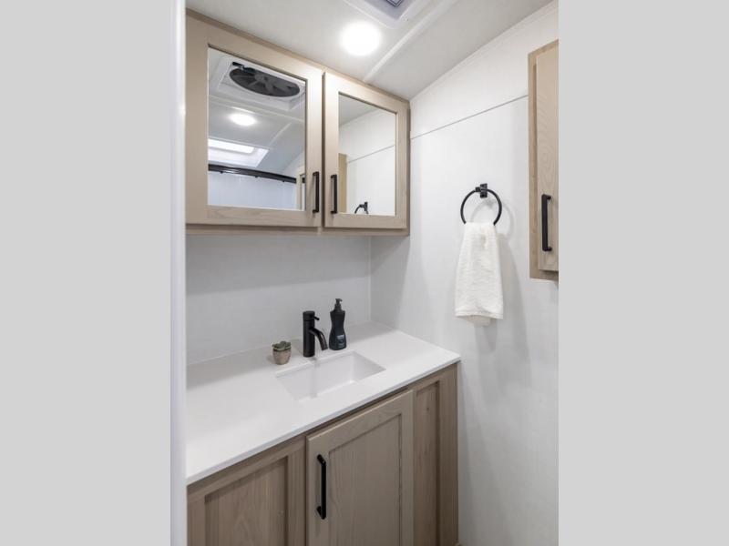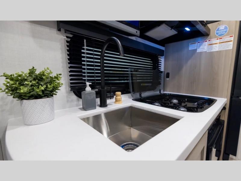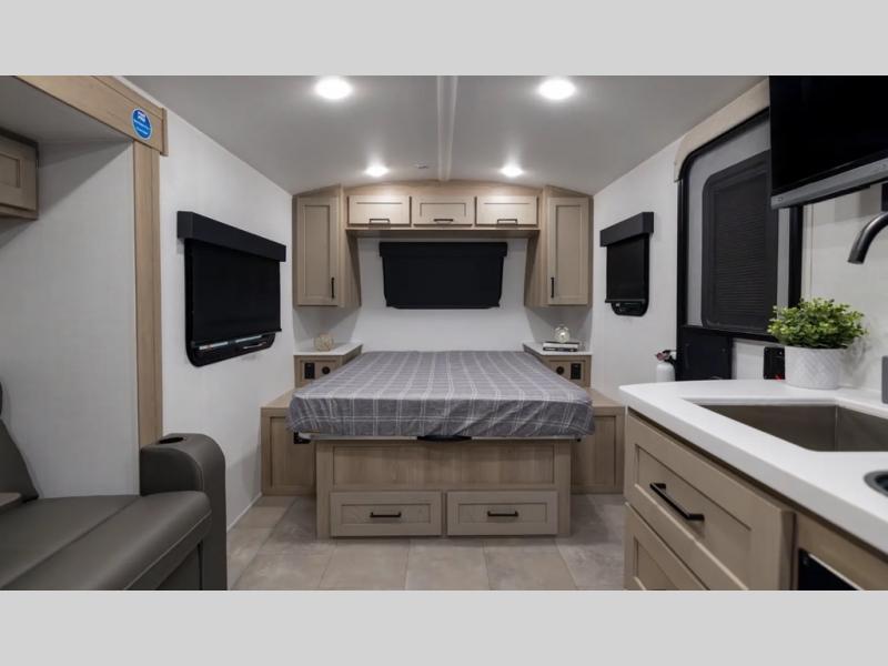 Get ready for a spacious and comfortable trip in this trailer, plus you will have a convenient rear full bathroom with an oversized shower and linen storage to utilize instead of using the campground's facilities. The walk-around full bed gives you two sides with wardrobes to claim as your own. And the kitchen offers full amenities to make meals, and the outside griddle gives you even more choices when cooking. You can relax, dine, or even work from the slide out sofa with a 30" x 15" table and watch the 32" TV. You will find storage along the exterior for your outdoor gear, plus a 14' power awning.