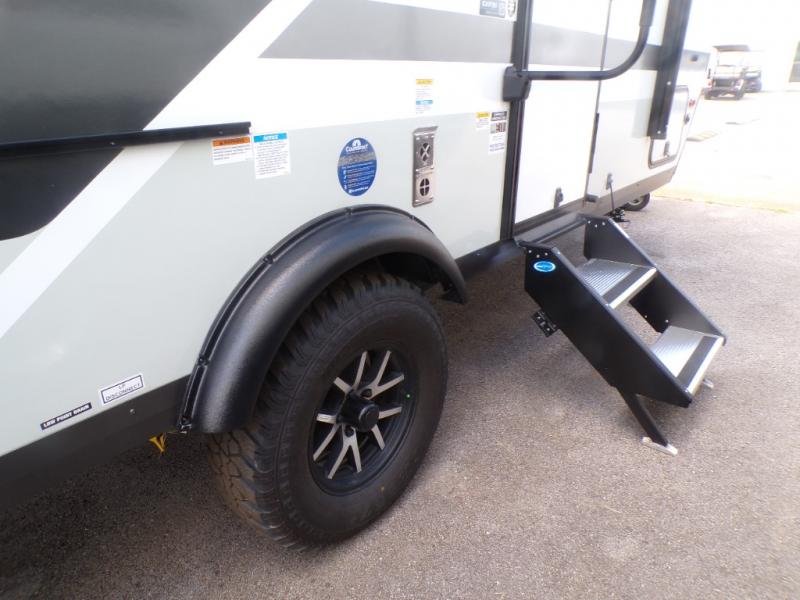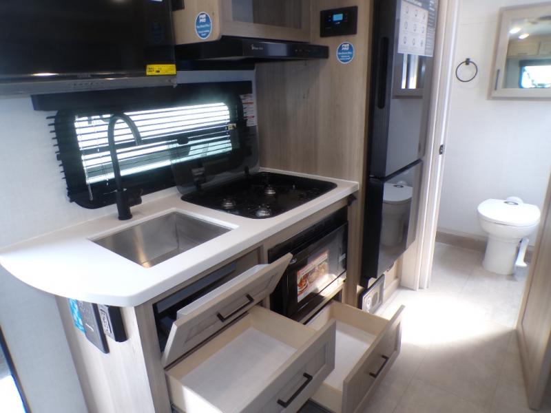 Get ready for a spacious and comfortable trip in this trailer, plus you will have a convenient rear full bathroom with an oversized shower and linen storage to utilize instead of using the campground's facilities. The walk-around full bed gives you two sides with wardrobes to claim as your own. And the kitchen offers full amenities to make meals, and the outside griddle gives you even more choices when cooking. You can relax, dine, or even work from the slide out sofa with a 30" x 15" table and watch the 32" TV. You will find storage along the exterior for your outdoor gear, plus a 14' power awning.