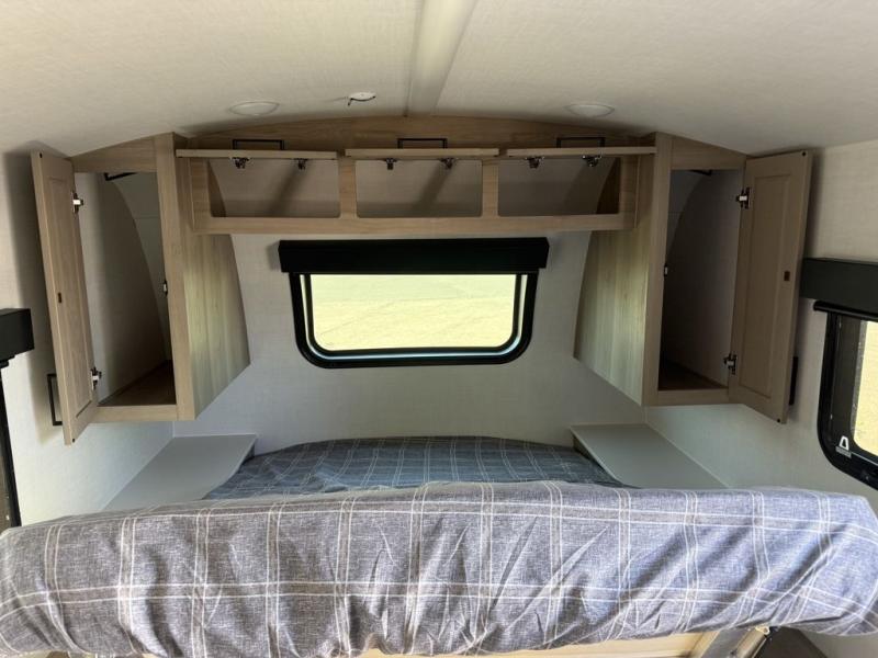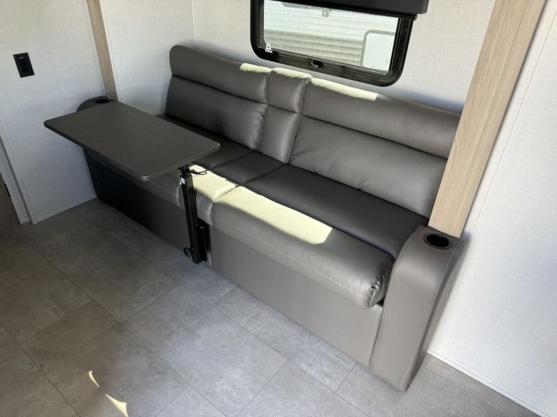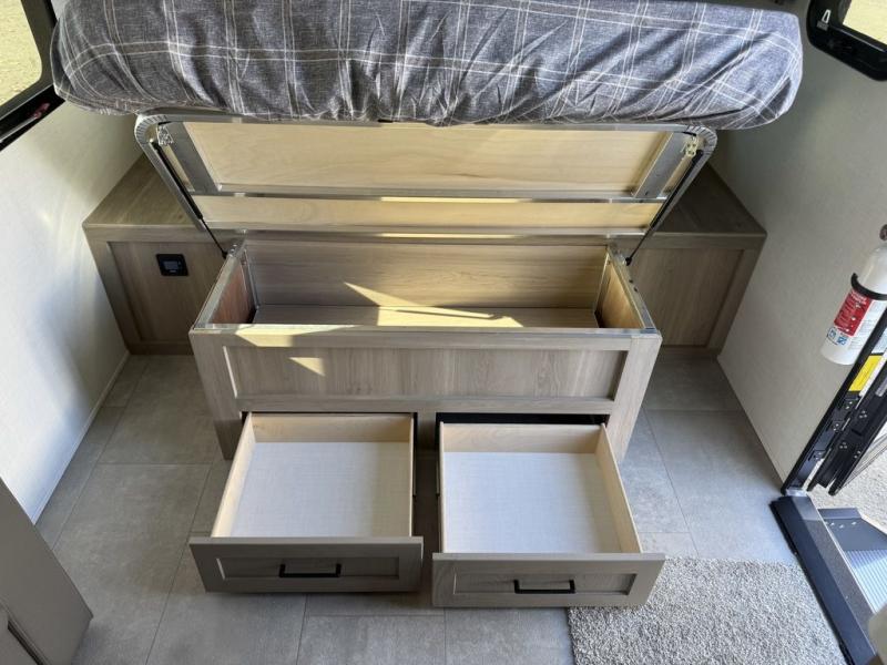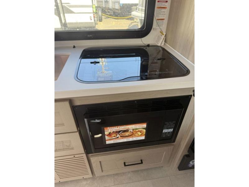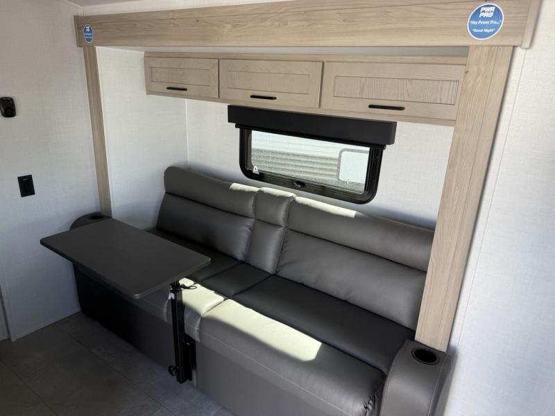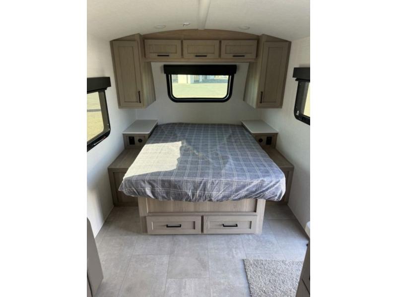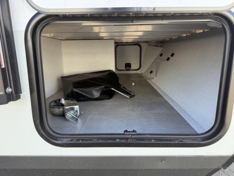 Get ready for a spacious and comfortable trip in this trailer, plus you will have a convenient rear full bathroom with an oversized shower and linen storage to utilize instead of using the campground's facilities. The walk-around full bed gives you two sides with wardrobes to claim as your own. And the kitchen offers full amenities to make meals, and the outside griddle gives you even more choices when cooking. You can relax, dine, or even work from the slide out sofa with a 30" x 15" table and watch the 32" TV. You will find storage along the exterior for your outdoor gear, plus a 14' power awning.