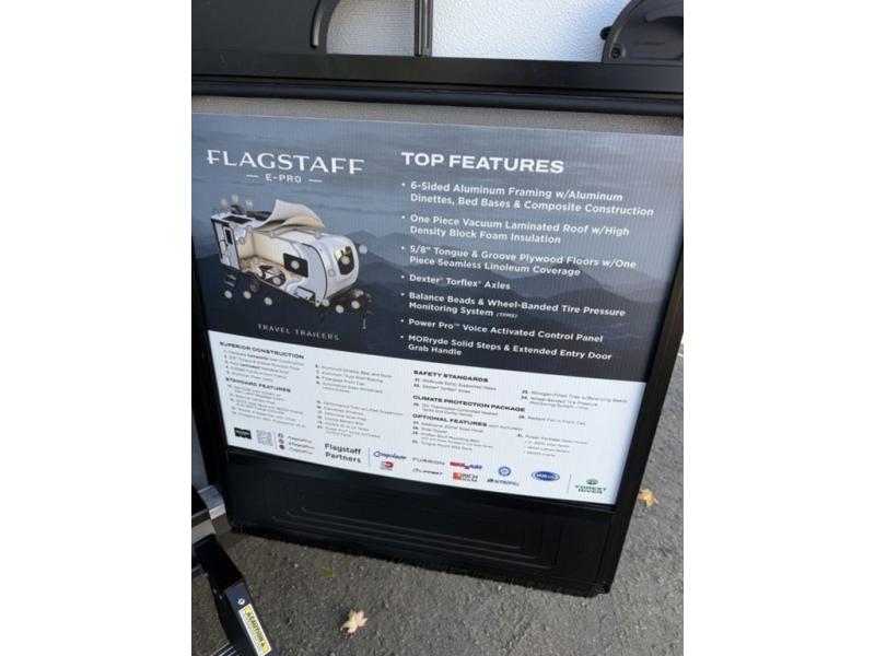 With any Flagstaff E-Pro travel trailer by Forest River, you will experience lightweight towing, style and features that will meet your needs, plus amenities that give you more than you expected! Built with interior and exterior composite sidewall construction, tongue and grove plywood flooring, and a vacuum laminated roof and walls, plus torsion axle, Rubber-Ryde suspension, and a tire pressure monitoring system for safety while traveling. And the 200 watt roof mount solar panel with 1,800-watt inverter will allow you to stay off-grid if you like. The interior offers a comfortable environment with the choice to use the air conditioner or furnace, and a 12V entertainment TV with a stereo to stay up to date on your favorite movies. Make your selection today!