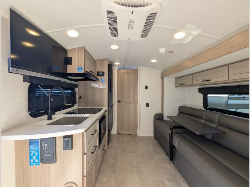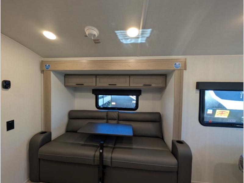 Get ready for a spacious and comfortable trip in this trailer, plus you will have a convenient rear full bathroom with an oversized shower and linen storage to utilize instead of using the campground's facilities. The walk-around full bed gives you two sides with wardrobes to claim as your own. And the kitchen offers full amenities to make meals. You can relax, dine, or even work from the slide out sofa with a 30" x 15" table and watch the TV. You will find storage along the exterior for your outdoor gear, plus a 14' power awning.