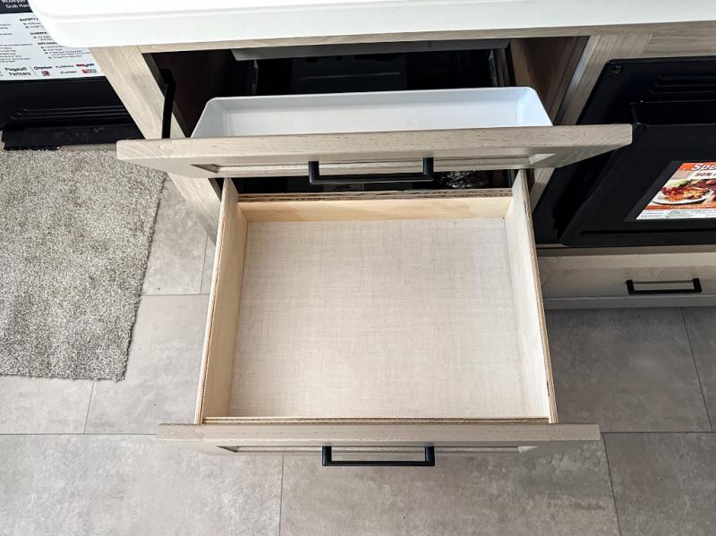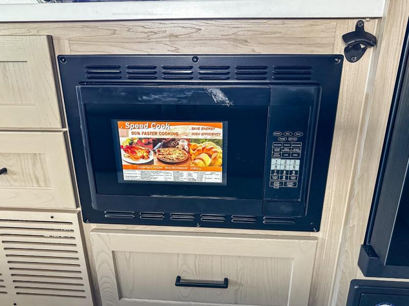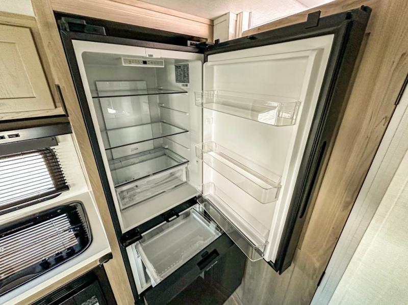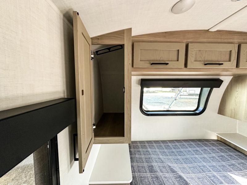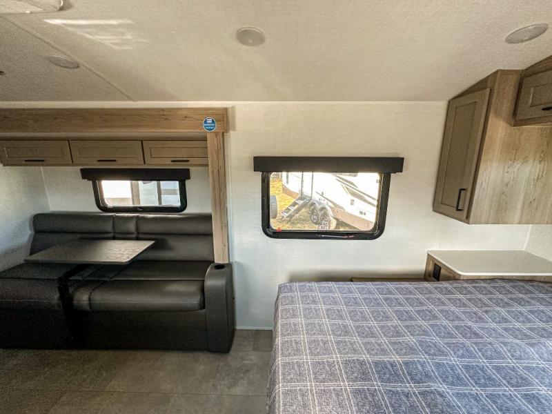 Get ready for a spacious and comfortable trip in this trailer, plus you will have a convenient rear full bathroom with an oversized shower and linen storage to utilize instead of using the campground's facilities. The walk-around full bed gives you two sides with wardrobes to claim as your own. And the kitchen offers full amenities to make meals. You can relax, dine, or even work from the slide out sofa with a 30" x 15" table and watch the TV. You will find storage along the exterior for your outdoor gear, plus a 14' power awning.