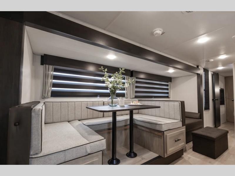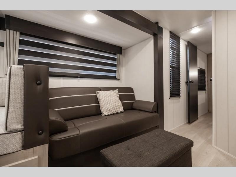 Get ready for a spacious and comfortable trip in this trailer, plus you will have a convenient rear full bathroom with an oversized shower and linen storage to utilize instead of using the campground's facilities. The walk-around full bed gives you two sides with wardrobes to claim as your own. And the kitchen offers full amenities to make meals. You can relax, dine, or even work from the slide out sofa with a 30" x 15" table and watch the TV. You will find storage along the exterior for your outdoor gear, plus a 14' power awning.