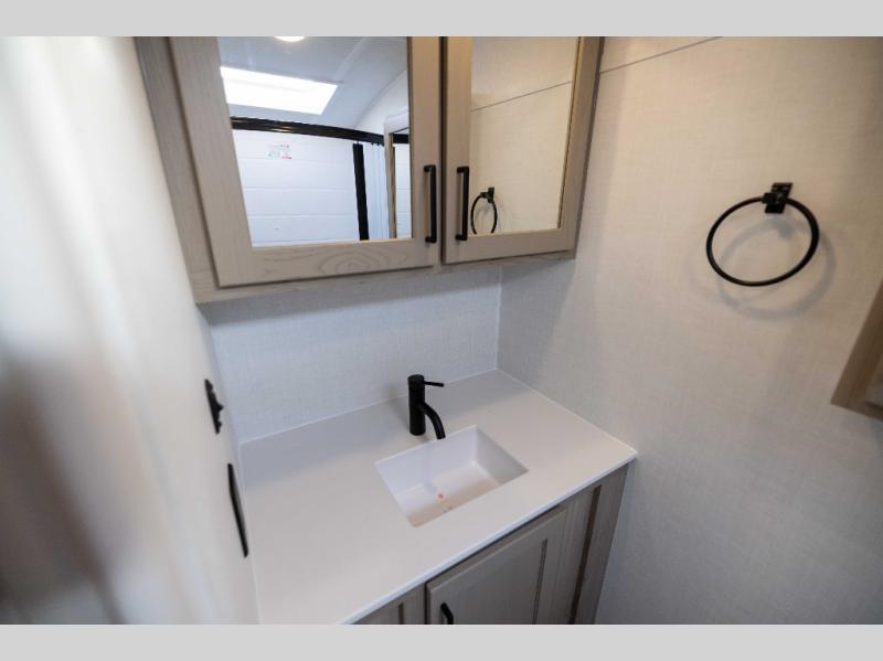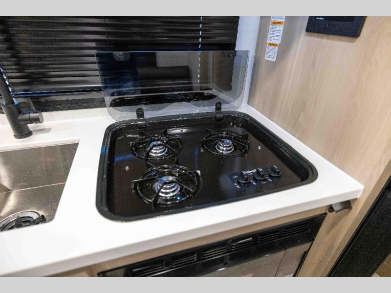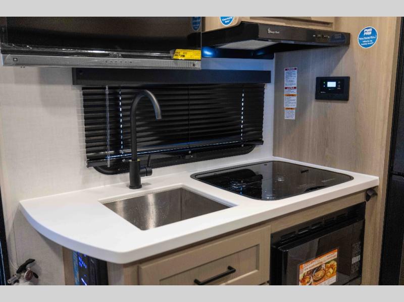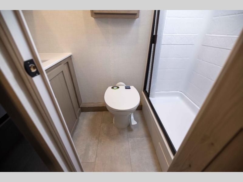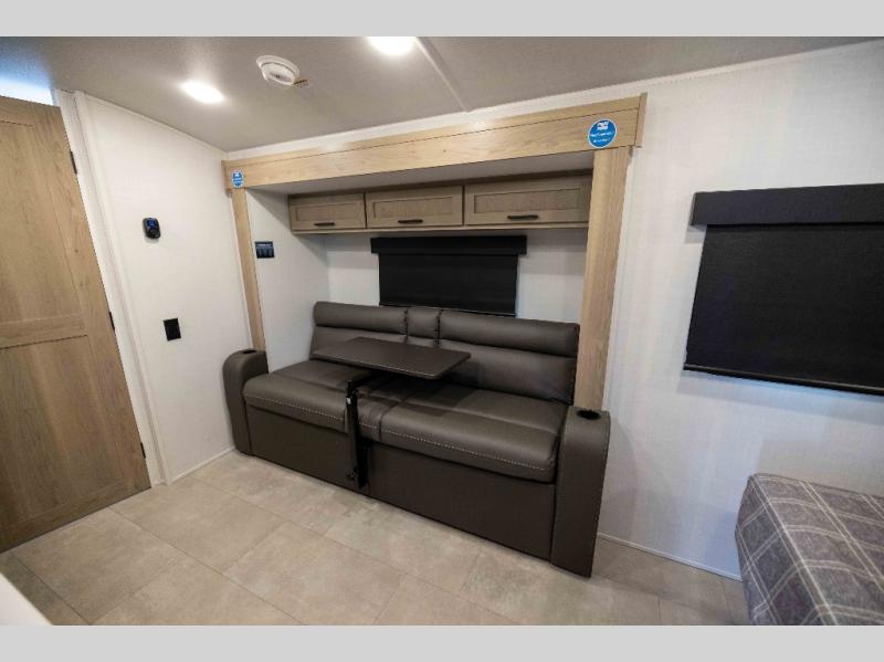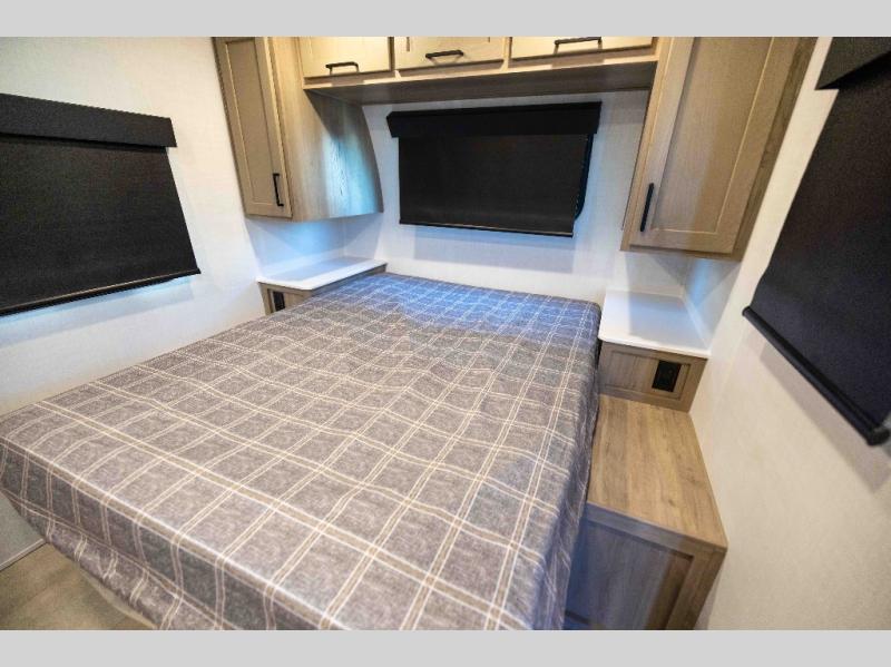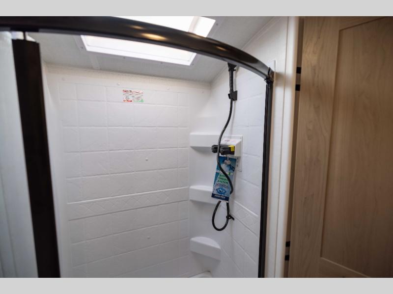 Get ready for a spacious and comfortable trip in this trailer, plus you will have a convenient rear full bathroom with an oversized shower and linen storage to utilize instead of using the campground's facilities. The walk-around full bed gives you two sides with wardrobes to claim as your own. And the kitchen offers full amenities to make meals. You can relax, dine, or even work from the slide out sofa with a 30" x 15" table and watch the TV. You will find storage along the exterior for your outdoor gear, plus a 14' power awning.