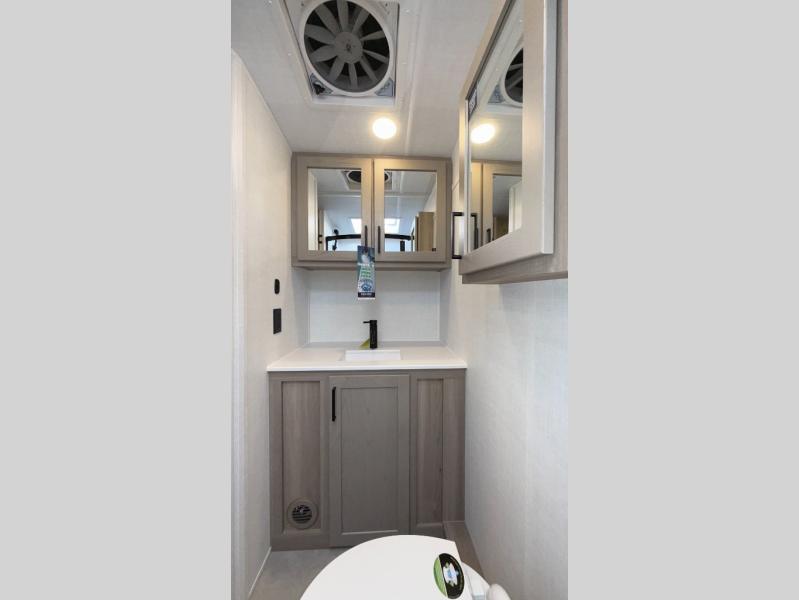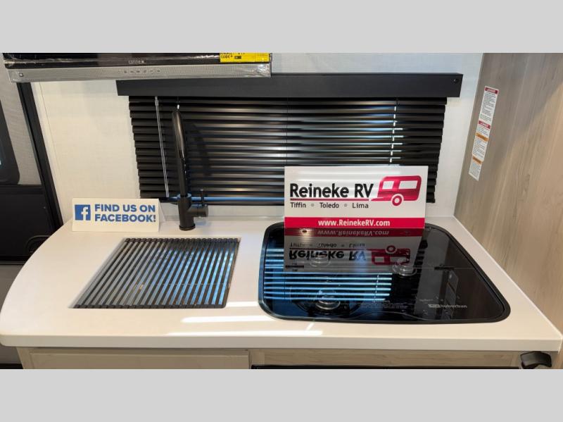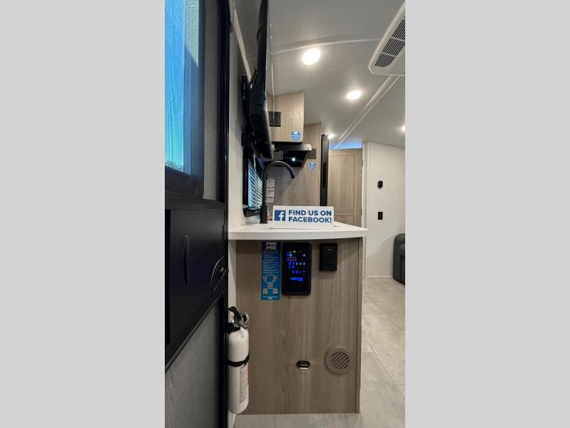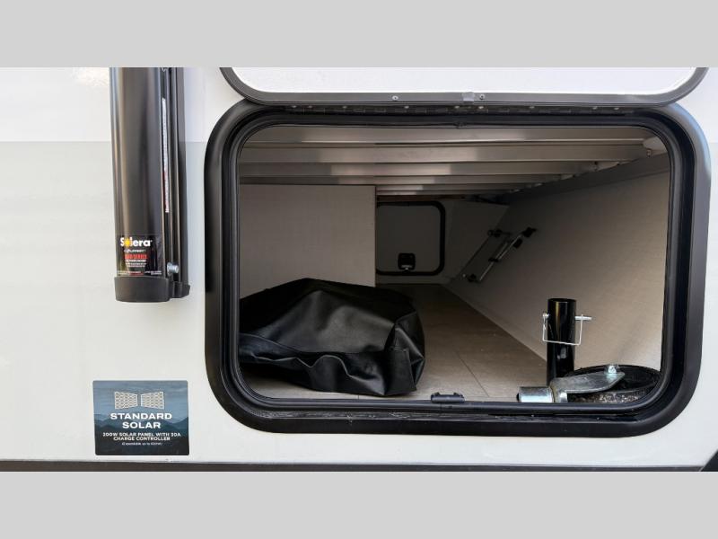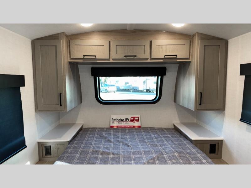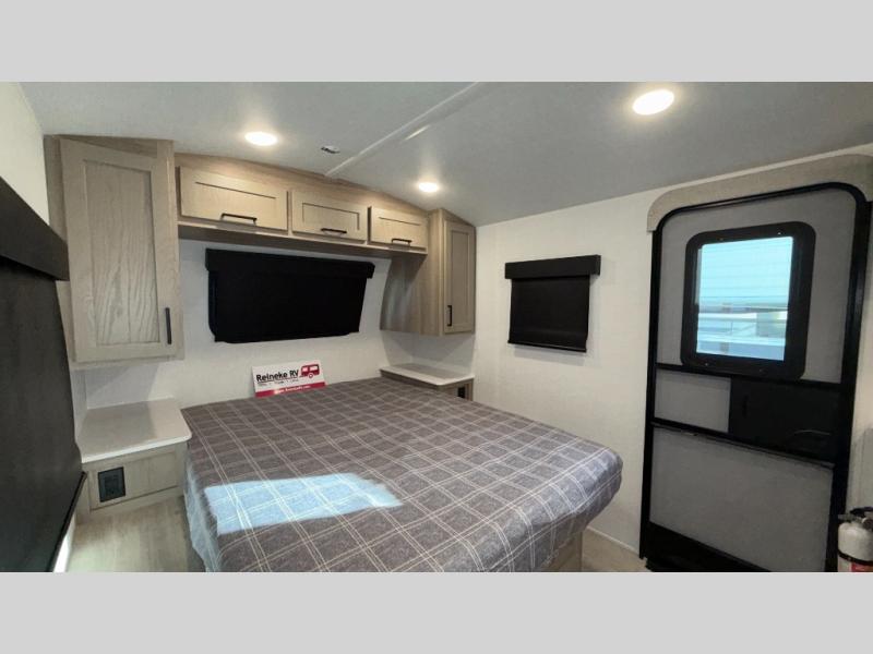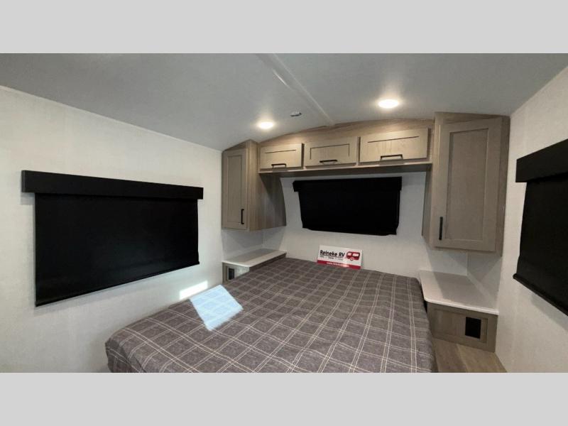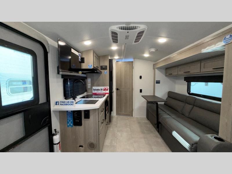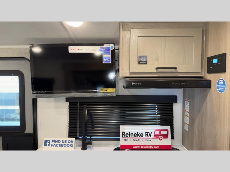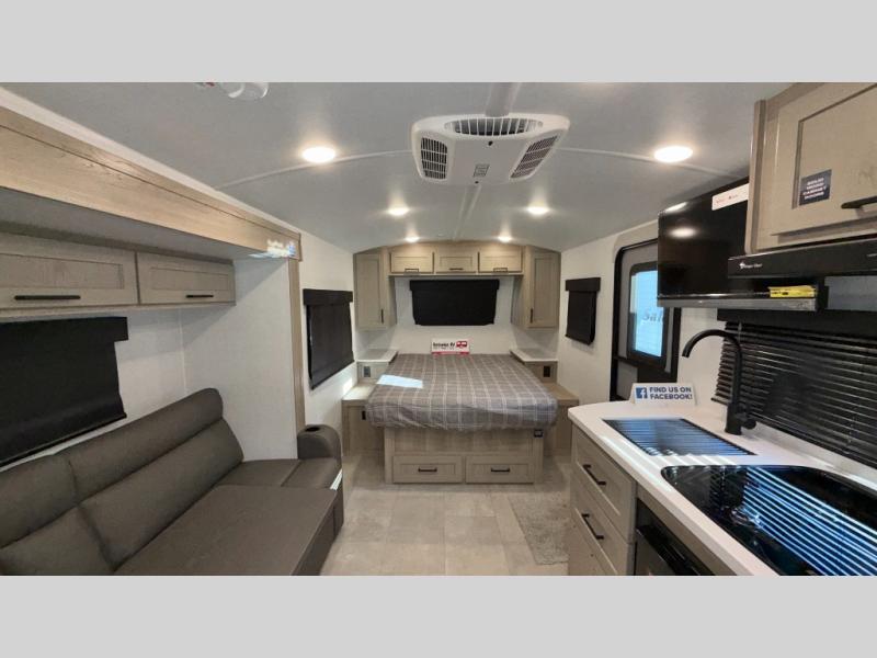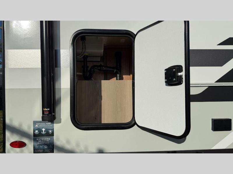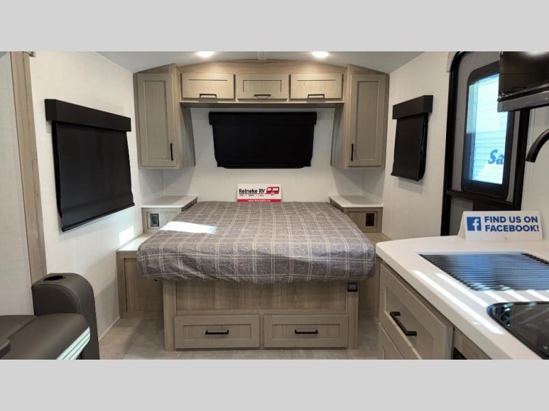 Get ready for a spacious and comfortable trip in this trailer, plus you will have a convenient rear full bathroom with an oversized shower and linen storage to utilize instead of using the campground's facilities. The walk-around full bed gives you two sides with wardrobes to claim as your own. And the kitchen offers full amenities to make meals. You can relax, dine, or even work from the slide out sofa with a 30" x 15" table and watch the TV. You will find storage along the exterior for your outdoor gear, plus a 14' power awning.