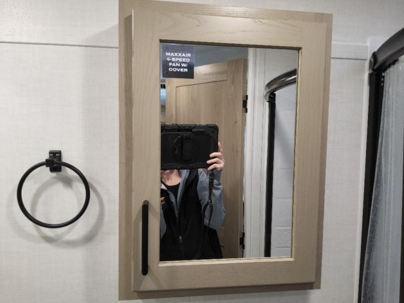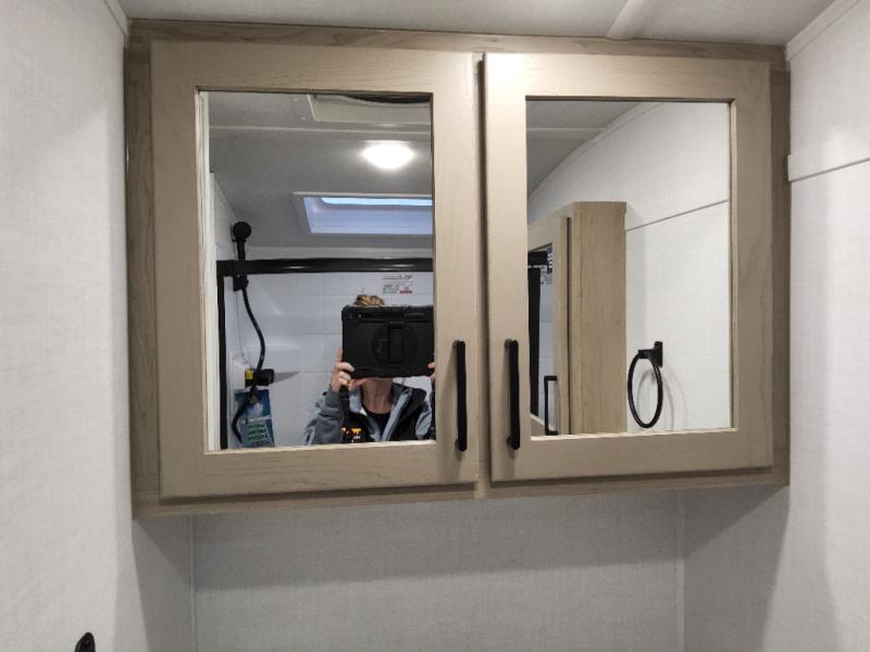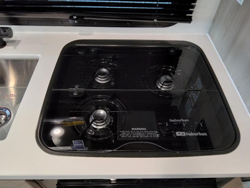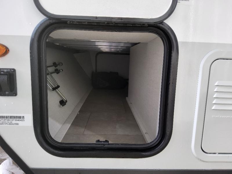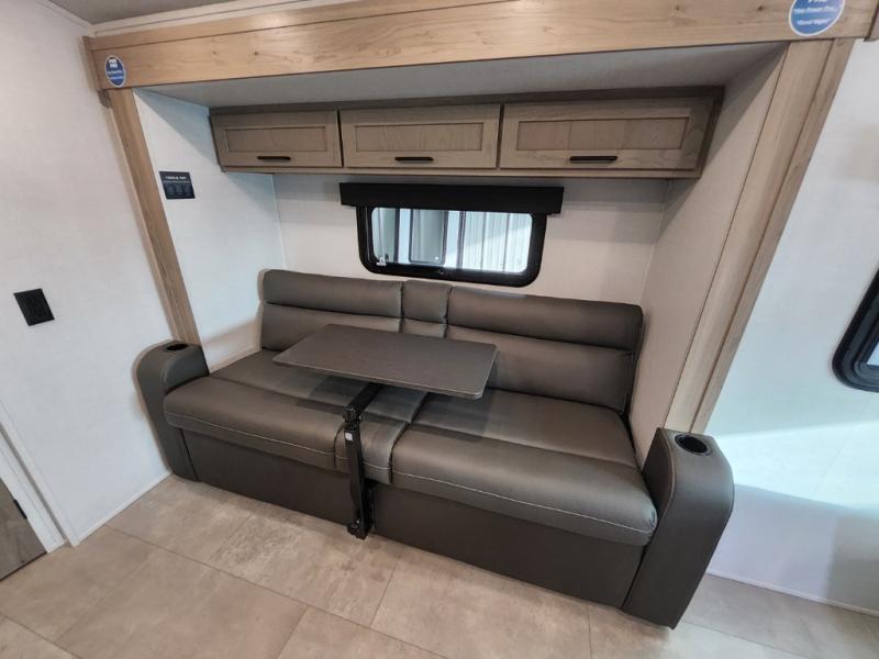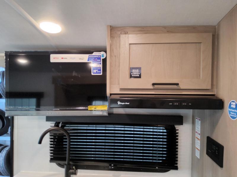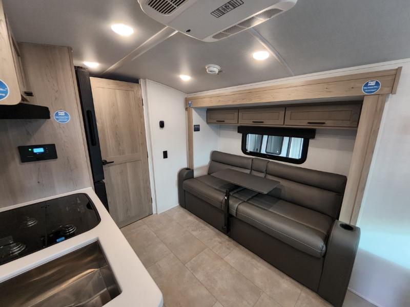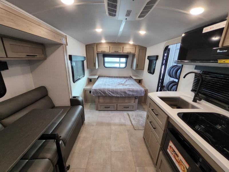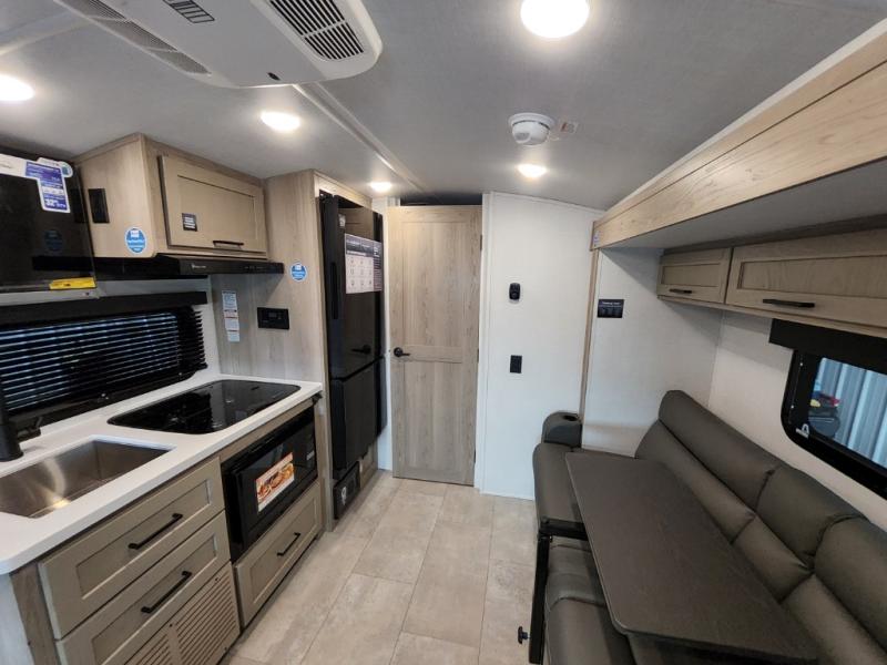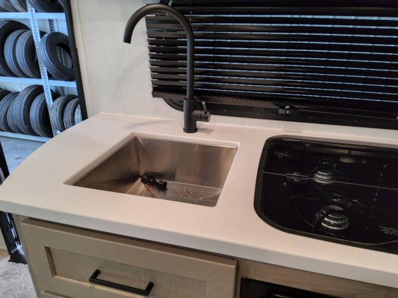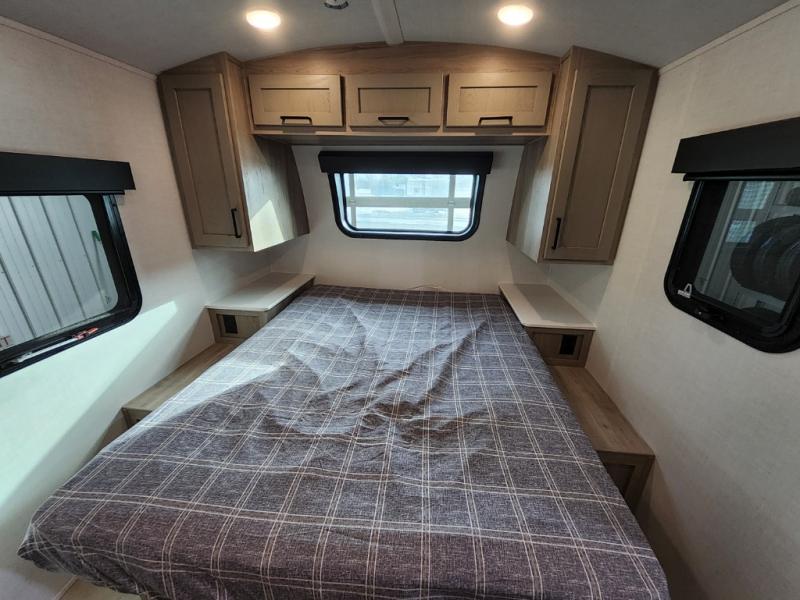 Get ready for a spacious and comfortable trip in this trailer, plus you will have a convenient rear full bathroom with an oversized shower and linen storage to utilize instead of using the campground's facilities. The walk-around full bed gives you two sides with wardrobes to claim as your own. And the kitchen offers full amenities to make meals. You can relax, dine, or even work from the slide out sofa with a 30" x 15" table and watch the TV. You will find storage along the exterior for your outdoor gear, plus a 14' power awning.