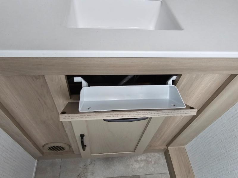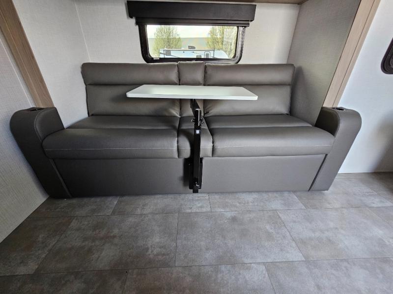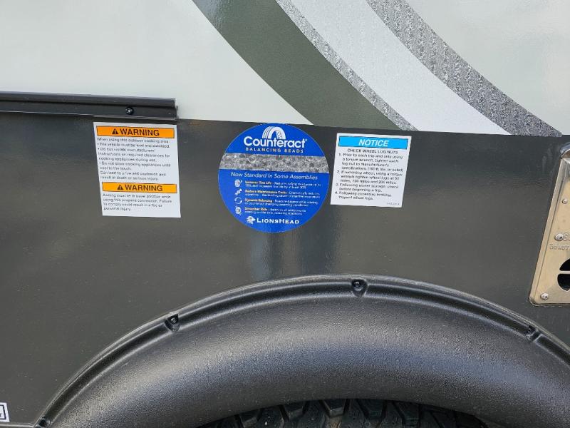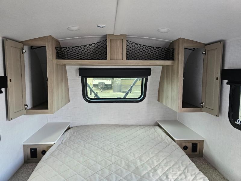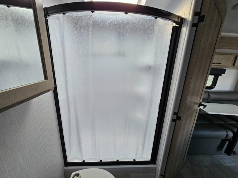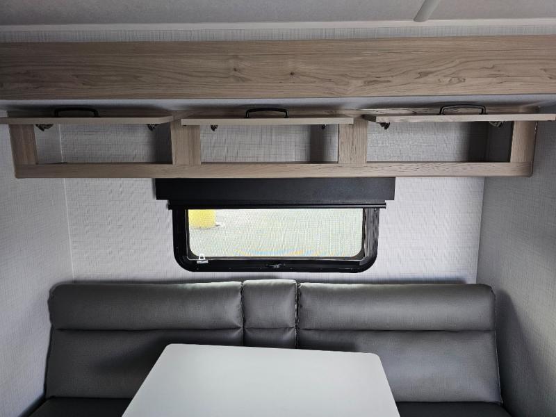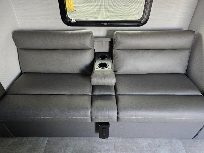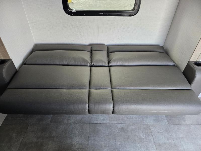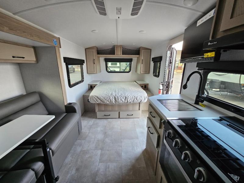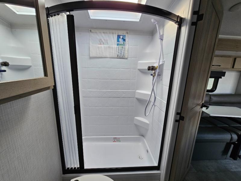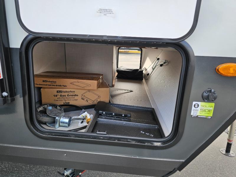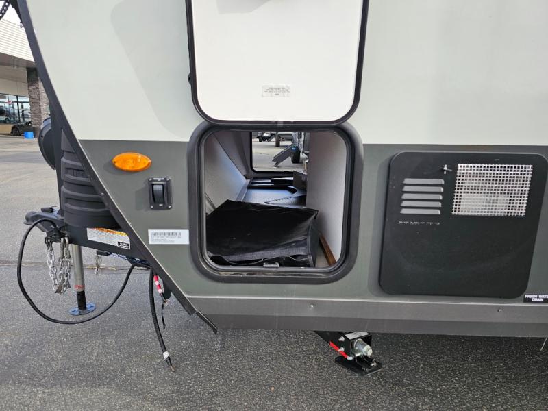 Get ready for a spacious and comfortable trip in this trailer, plus you will have a convenient rear full bathroom with an oversized shower and linen storage to utilize instead of using the campground's facilities. The walk-around full bed gives you two sides with wardrobes to claim as your own. And the kitchen offers full amenities to make meals. You can relax, dine, or even work from the slide out sofa with a 30" x 15" table and watch the TV. You will find storage along the exterior for your outdoor gear, plus a 14' power awning.