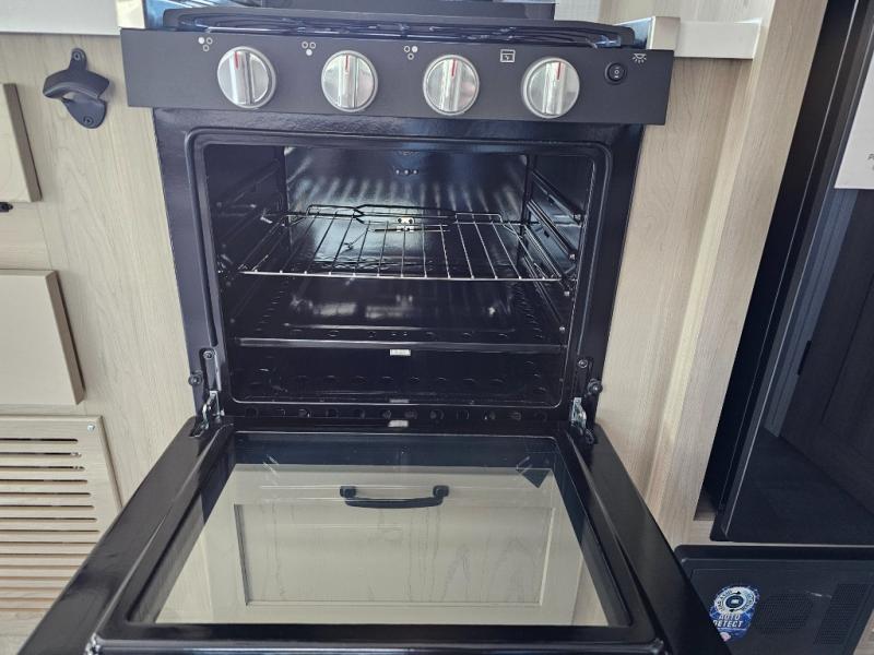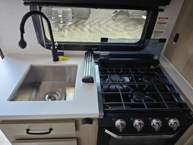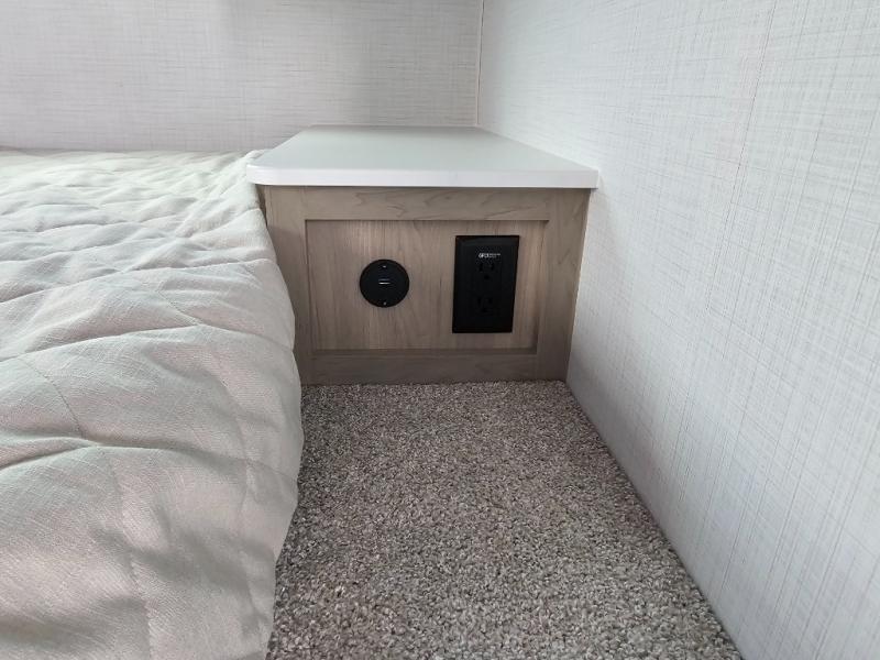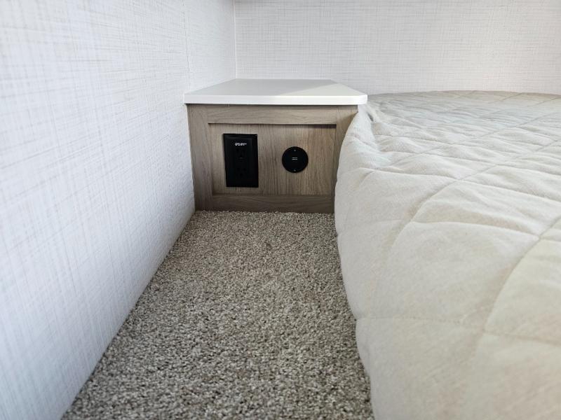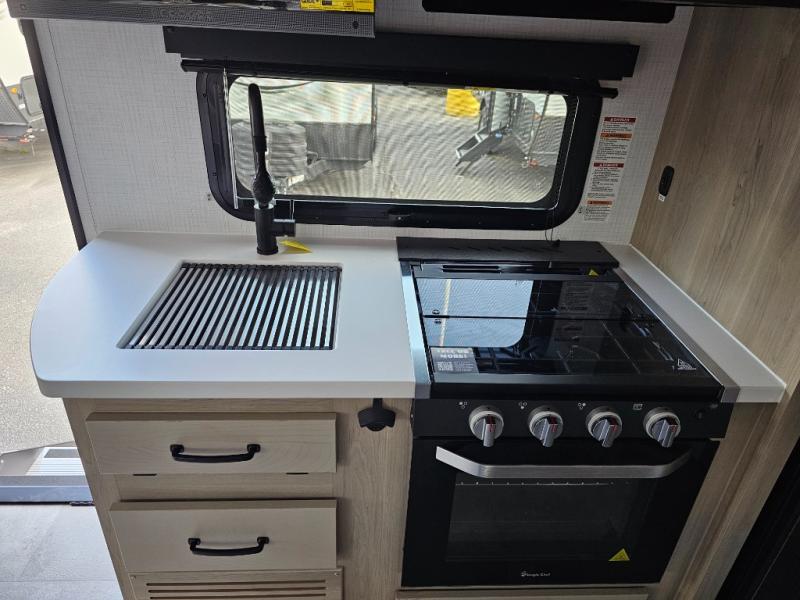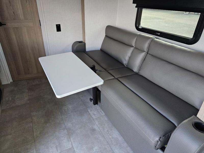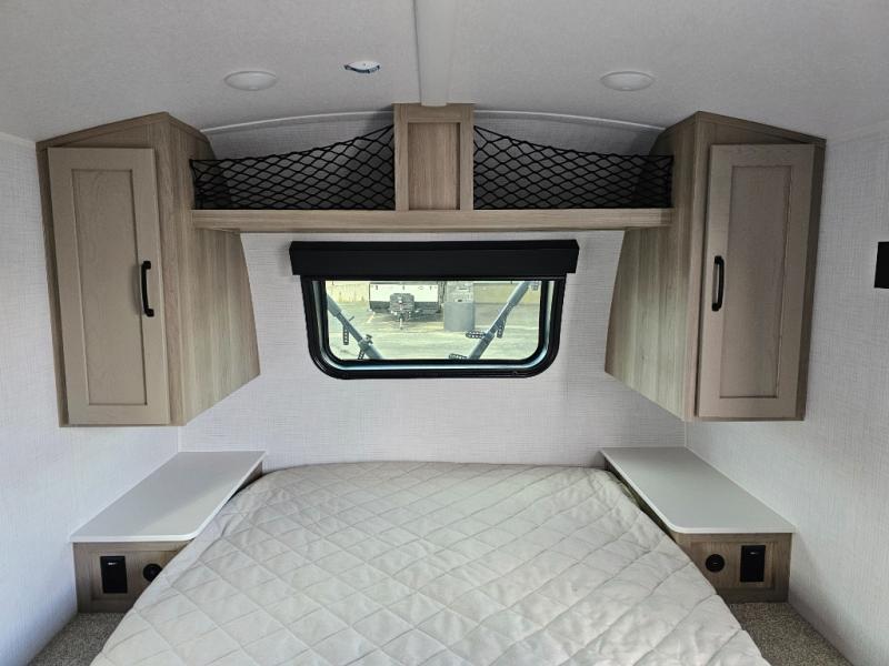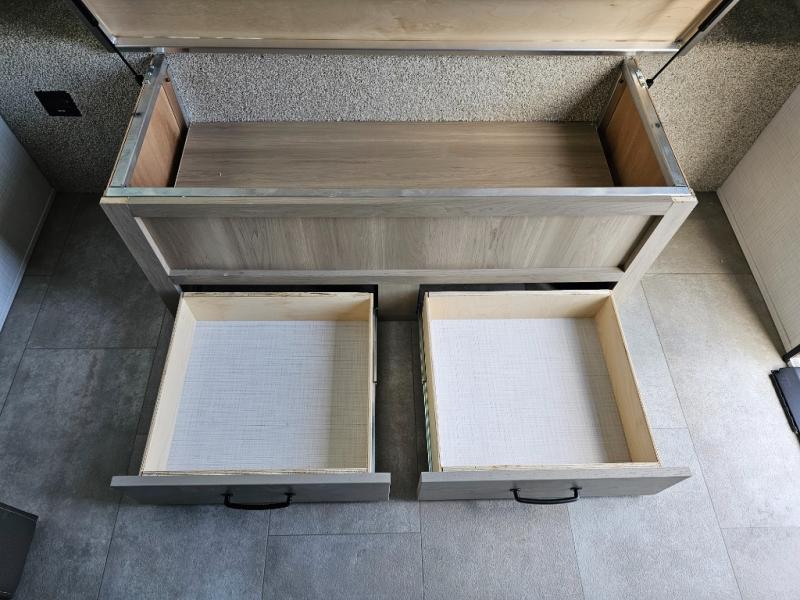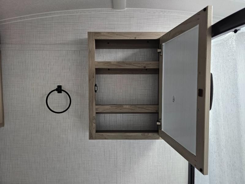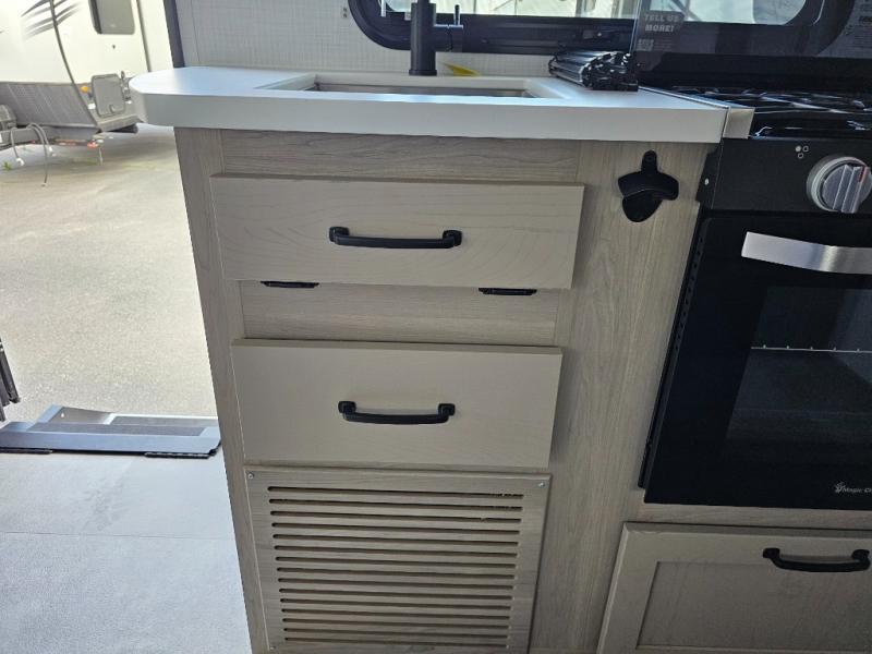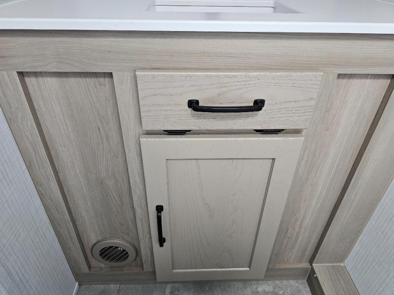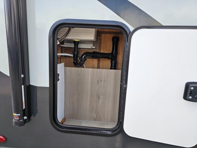 Get ready for a spacious and comfortable trip in this trailer, plus you will have a convenient rear full bathroom with an oversized shower and linen storage to utilize instead of using the campground's facilities. The walk-around full bed gives you two sides with wardrobes to claim as your own. And the kitchen offers full amenities to make meals. You can relax, dine, or even work from the slide out sofa with a 30" x 15" table and watch the TV. You will find storage along the exterior for your outdoor gear, plus a 14' power awning.
