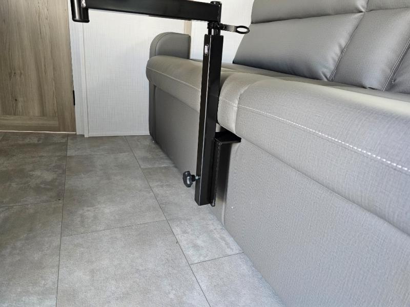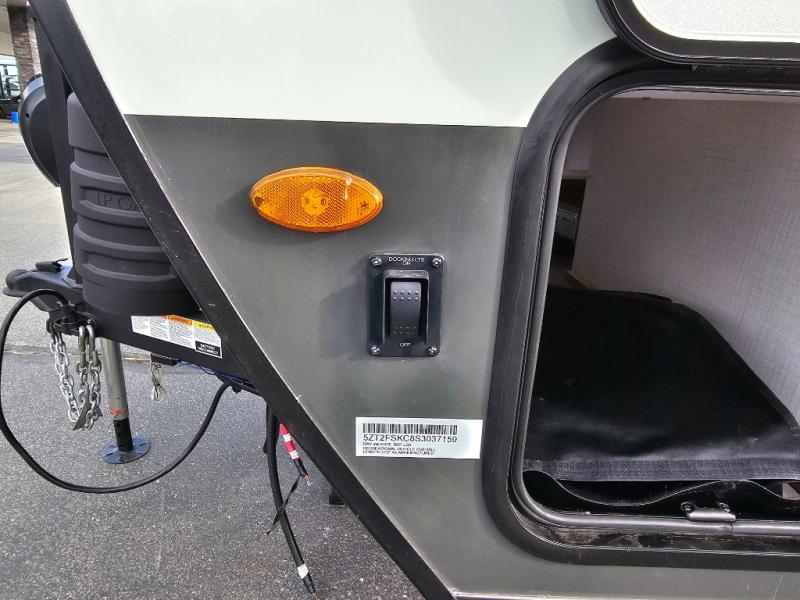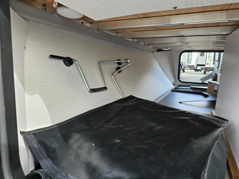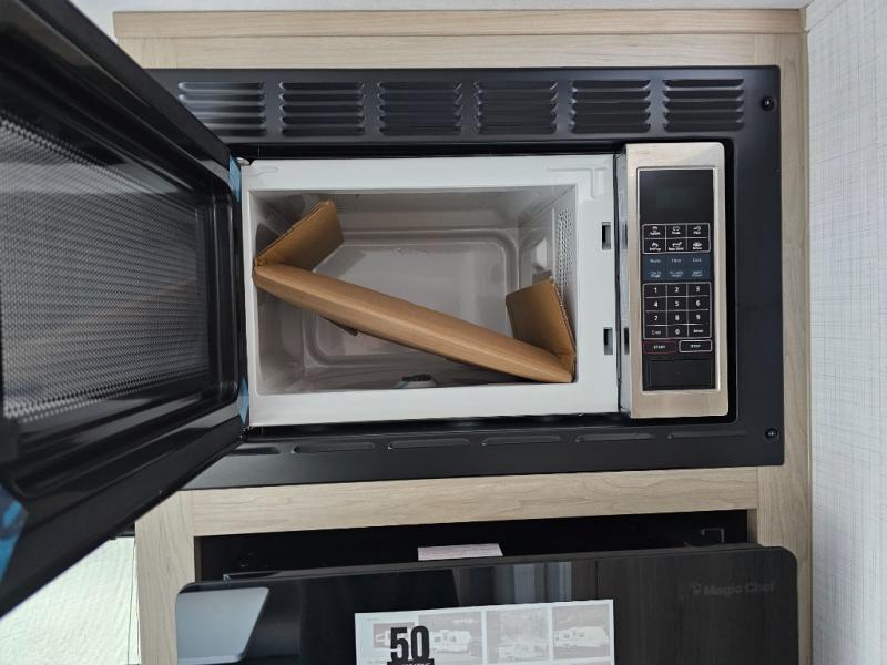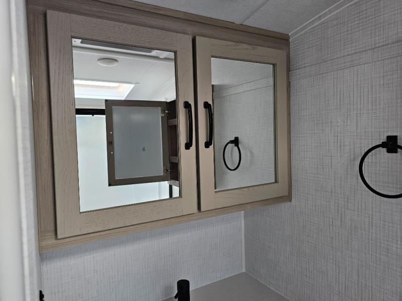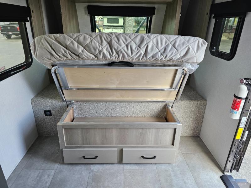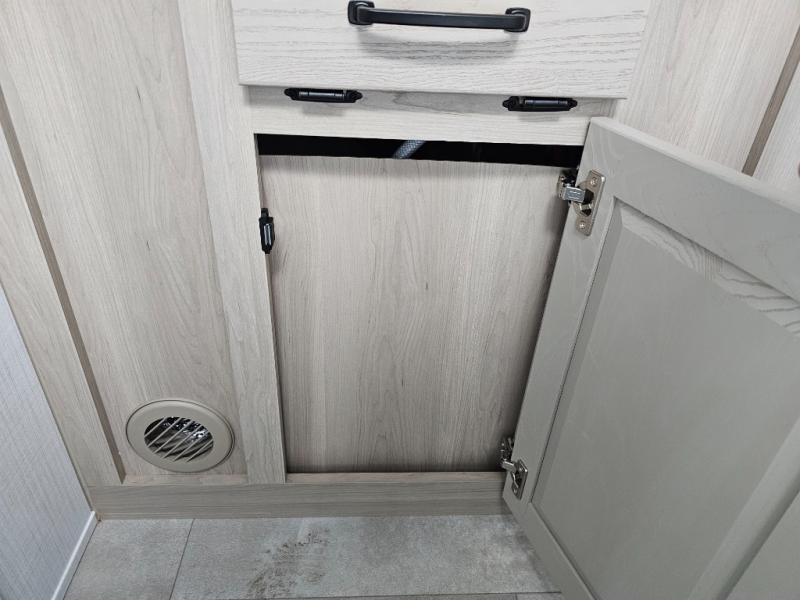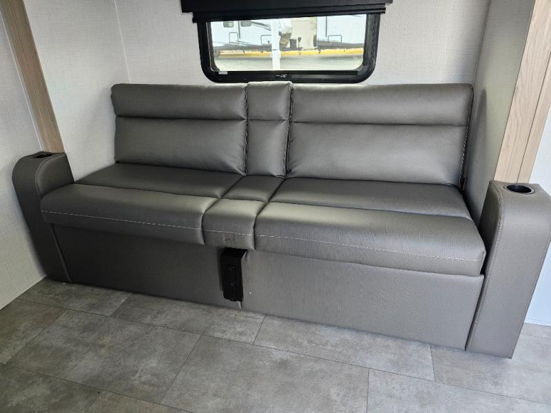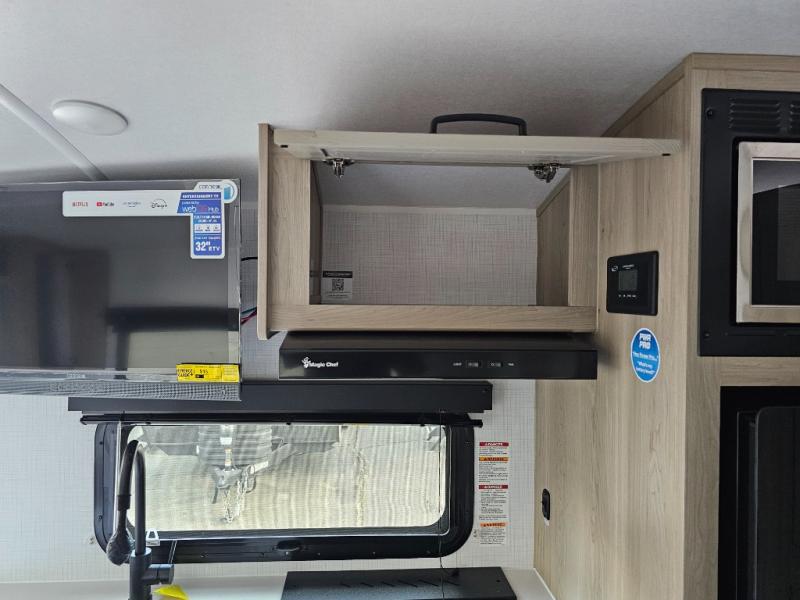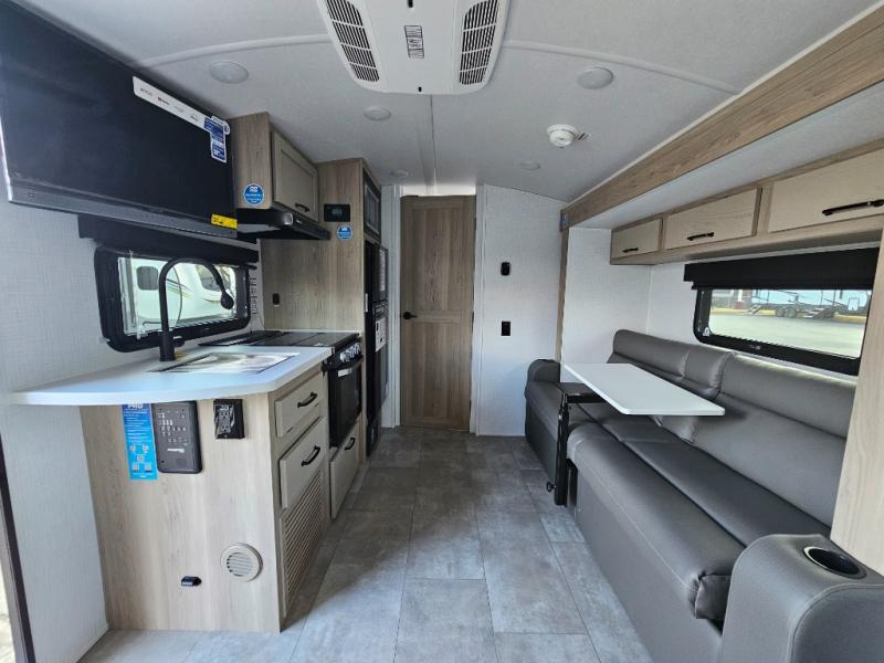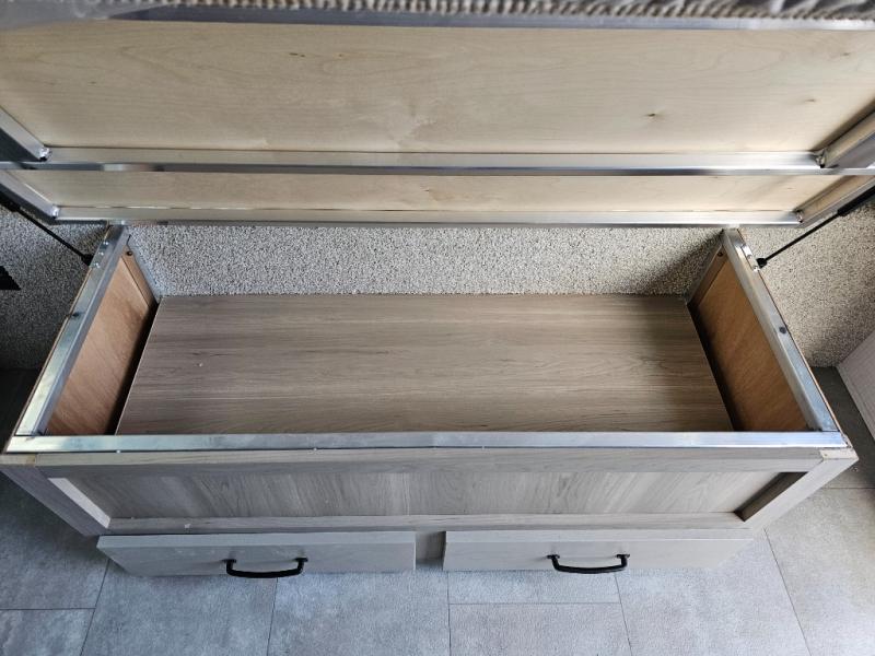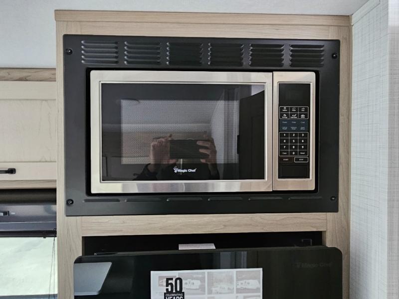 Get ready for a spacious and comfortable trip in this trailer, plus you will have a convenient rear full bathroom with an oversized shower and linen storage to utilize instead of using the campground's facilities. The walk-around full bed gives you two sides with wardrobes to claim as your own. And the kitchen offers full amenities to make meals. You can relax, dine, or even work from the slide out sofa with a 30" x 15" table and watch the TV. You will find storage along the exterior for your outdoor gear, plus a 14' power awning.