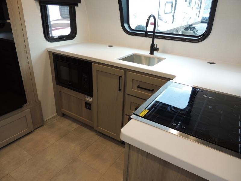 The chef will love cooking in the front kitchen of this travel trailer! It offers plenty of countertop space to meal prep and all of the essentials to cook delicious meals, plus there is even an outside kitchen with a refrigerator, a pull-out stove, and a griddle to fry what you caught that day. Enjoy all of your meals at the 72" sofa slide with a table or pull up a table and chairs under the 15' power awning. The queen bed offers a comfortable place for you to rest up each night and it even has a 26" x 80" flip-up bunk above it for a guest or two to tag along. Store all of your camping essentials in the exterior storage and rinse your feet off with the outside spray port after a fun day at the beach!