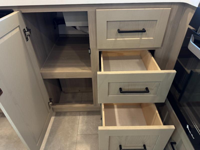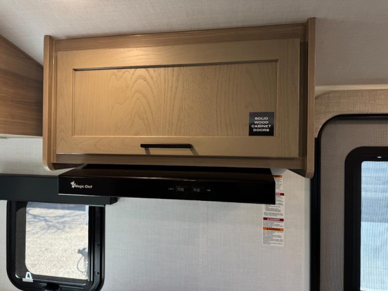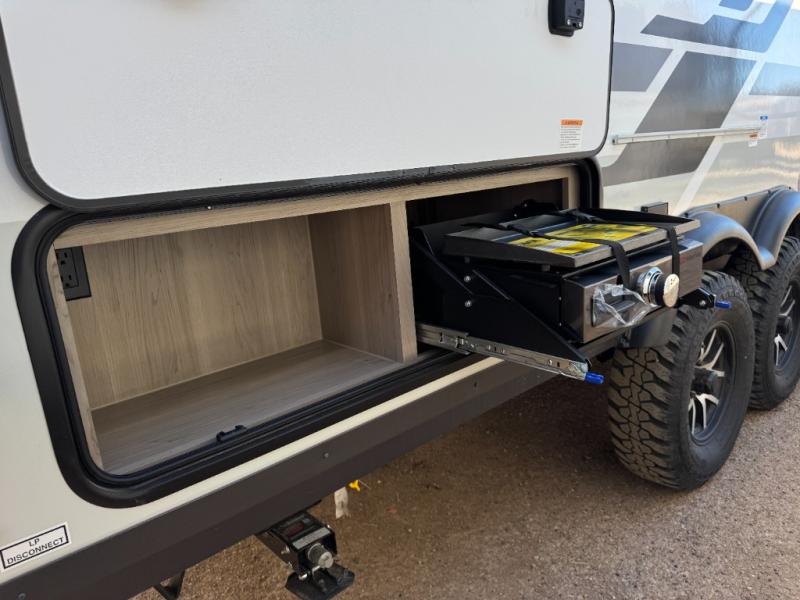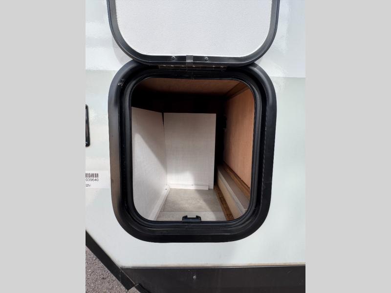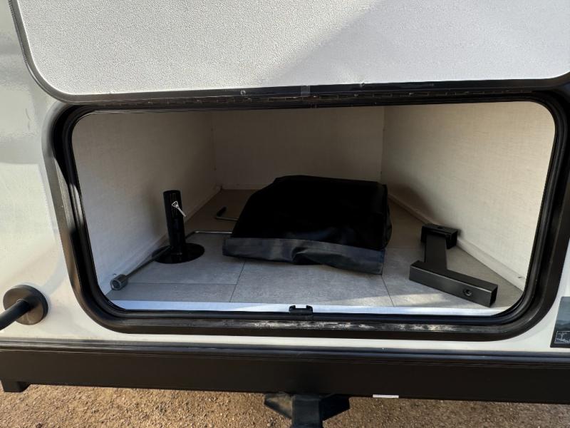 The chef will love cooking in the front kitchen of this travel trailer! It offers plenty of countertop space to meal prep and all of the essentials to cook delicious meals, plus there is even an outside kitchen with a refrigerator, a pull-out stove, and a griddle to fry what you caught that day. Enjoy all of your meals at the 72" sofa slide with a table or pull up a table and chairs under the 15' power awning. The queen bed offers a comfortable place for you to rest up each night and it even has a 26" x 80" flip-up bunk above it for a guest or two to tag along. Store all of your camping essentials in the exterior storage.