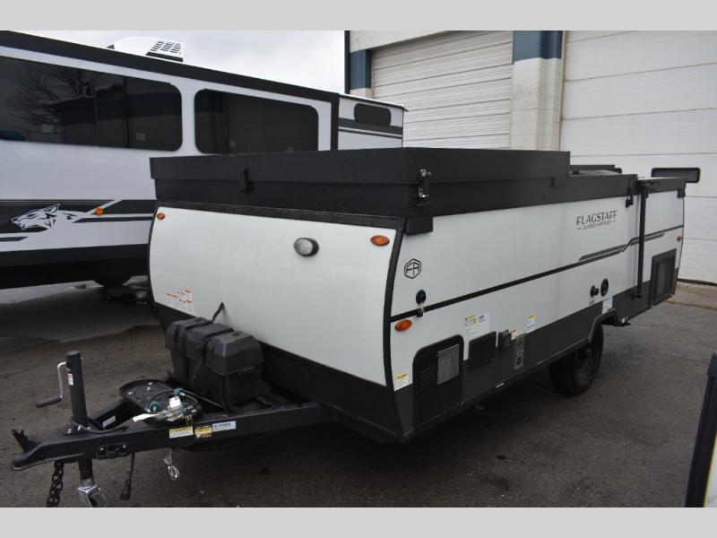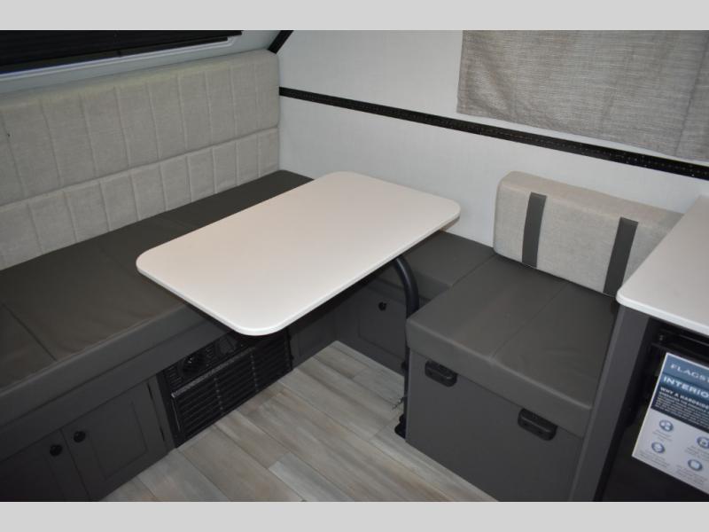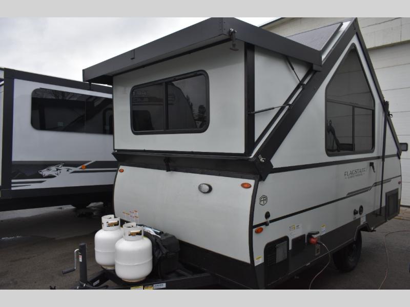 With any Flagstaff Hardside A-frame camper by Forest River, you will enjoy the hassle-free towing of a tent camper and the exterior of a travel trailer. Each one is built with a durable diamond plate front, a fiberglass laminated roof, and a two tone fiberglass exterior. There are also four stabilizer jacks with sand pads, radial tires with nitrogen, electric brakes, and solar prep on the frame if you want to add solar power. Head inside to enjoy the MaxxAir fan, interior floor lights and LED ceiling lights, plus raised panel cabinet doors.