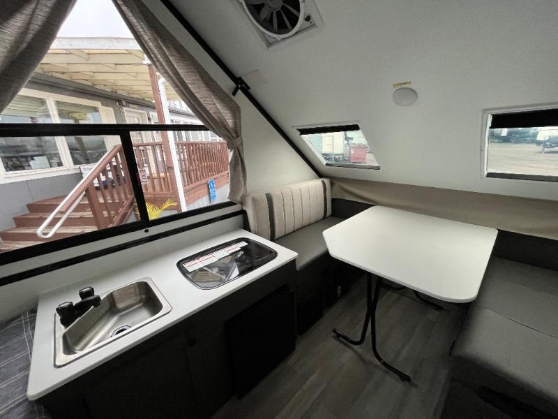 What a treat it will be to spend a weekend in this Flagstaff Hard Side A-frame! You will be able to create some more interior living space by repositioning the flip-up bed after you wake up, and the booth dinette can also maneuver out of a bed and back into a dining space easily. There is also a two burner range that can be used to fry up a hearty batch of pancakes without even starting a fire.