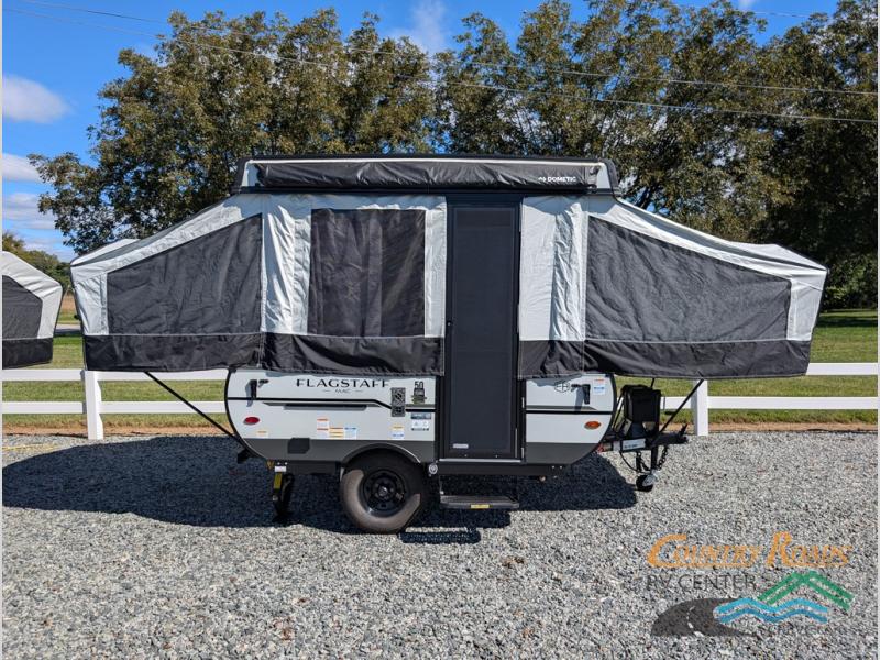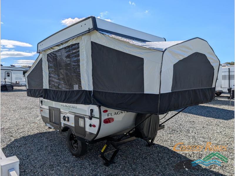 You'll be pleasantly surprised by the amount of comfort in these Flagstaff MAC Series folding pop-up campers by Forest River. Each one is built with a fiberglass laminated roof for added durability and a power roof lift for easy set up. There is also a clay exterior with an alloy band, solar panel prep on the frame, and four stabilizer jacks with sand pads to keep your camper secure. The interior features wood plank flooring, heated mattresses on the bunk ends, USB charging ports, and stylish Andover Sable wood.