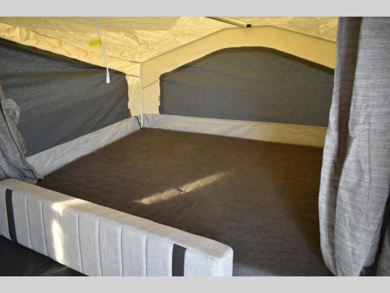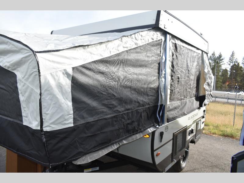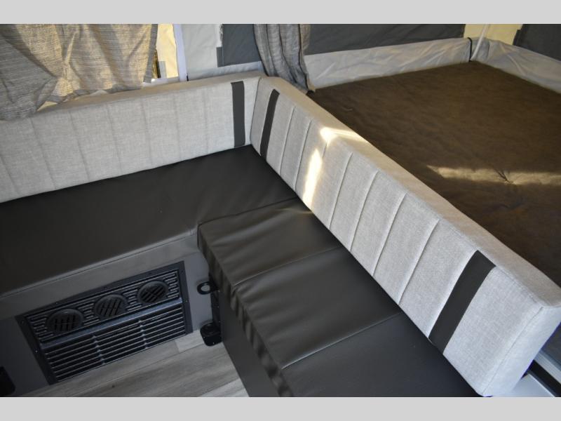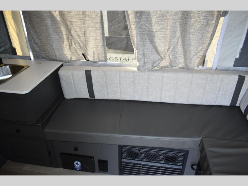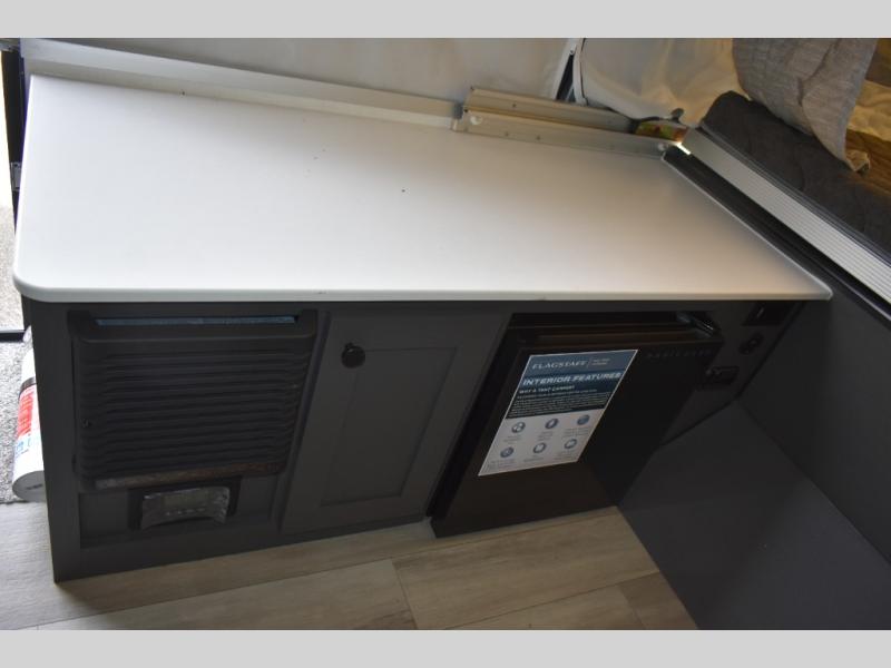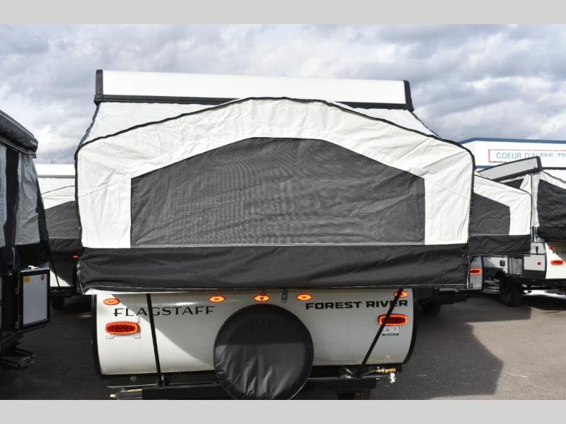 You'll be pleasantly surprised by the amount of comfort in these Flagstaff MAC Series folding pop-up campers by Forest River. Each one is built with a fiberglass laminated roof for added durability and a power roof lift for easy set up. There is also a clay exterior with an alloy band, solar panel prep on the frame, and four stabilizer jacks with sand pads to keep your camper secure. The interior features wood plank flooring, USB charging ports, and stylish Andover Sable wood.
